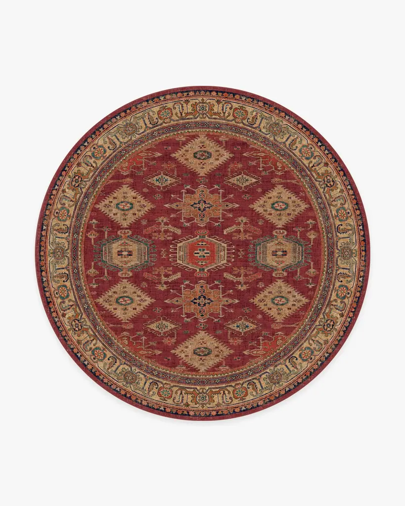 Zareen Scarlet Red Rug brings the timeless elegance of traditional Persian carpets to modern spaces. Tinted in bold and vivid hues of rich red, with pops of light yellow and chocolate brown, this bordered rug features animal figures peppered around hexagon and diamond shapes. A rich and visually riveting design chronicling the lives of the nomadic Persian people.