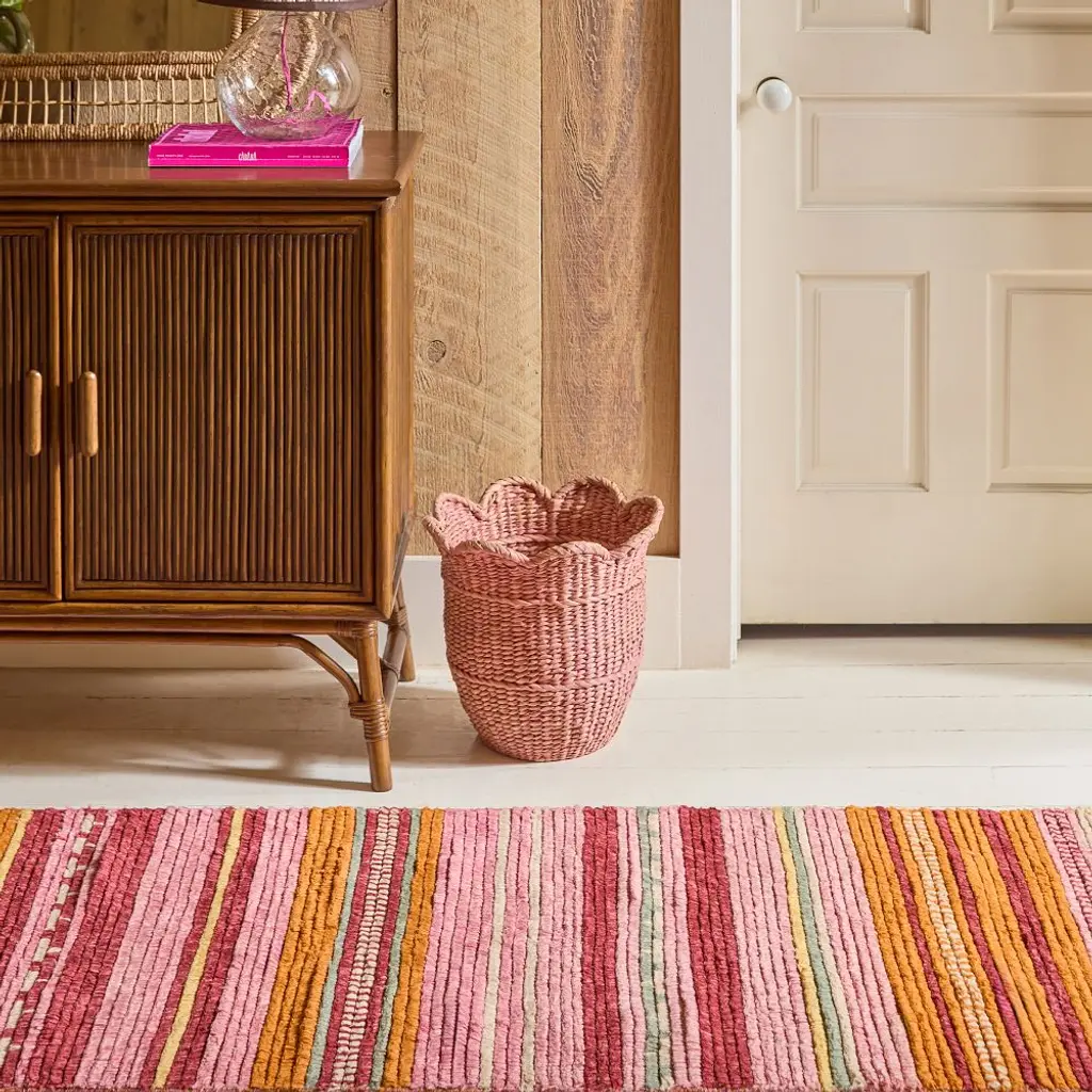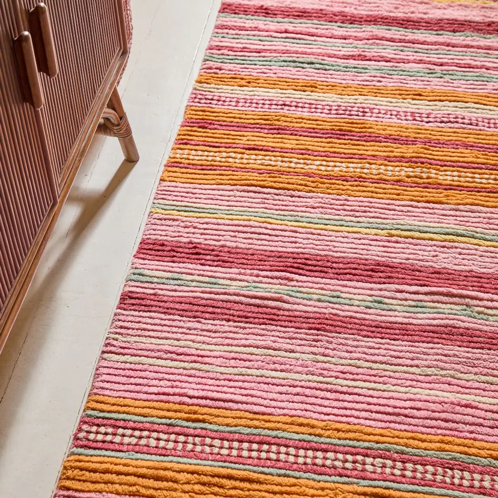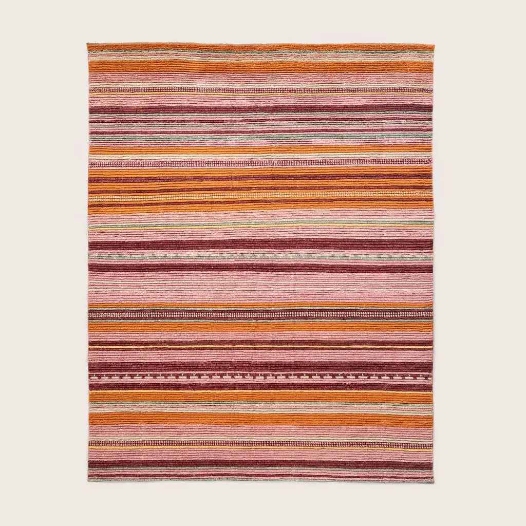 Soft, striped, and cozy. In a joyful palette of warm stripes, this hand-knotted, RWS-certified wool rug wears beautifully and feels exceptionally inviting underfoot.