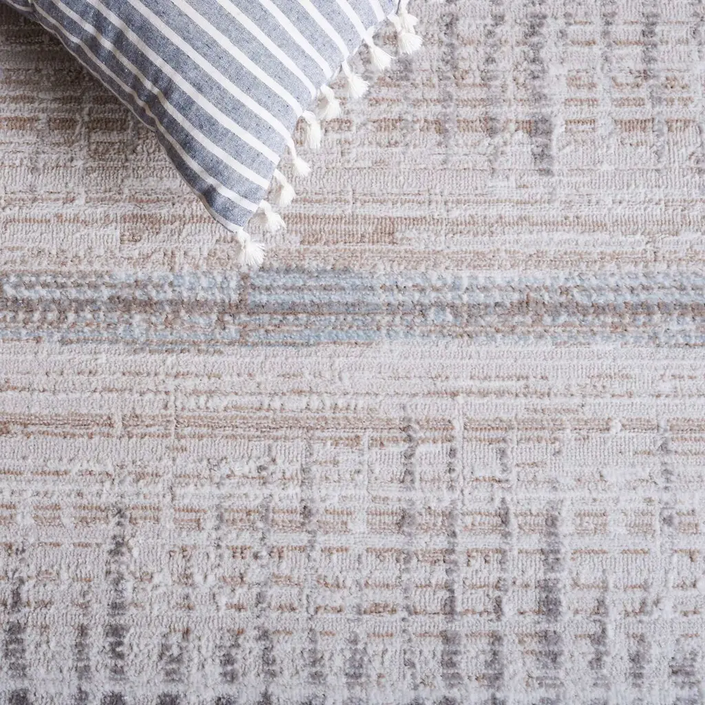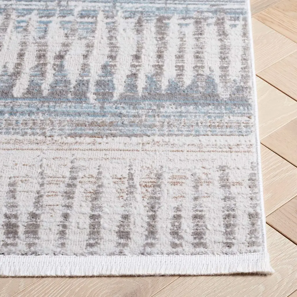 Elevate your living space with the exquisite touch of our Modern Style Area Rug. Measuring a versatile 5'-3" X 7'-6", this medium rectangle rug showcases a comforting height of 5/8", offering a plush underfoot experience that will enchant guests and household members alike. Crafted in the heart of Turkey, this rug epitomizes the pinnacle of textile innovation with its power-loomed construction, ensuring an intricate design with remarkable durability. The use of high-quality polyester imbues this piece with an inviting texture and guarantees easy care for those who treasure both style and convenience. The color palette of ivory and beige-grey harmoniously blends, creating a serene and sophisticated atmosphere. Drawing upon minimalist influences, the rug's pattern presents rhythmic linear textures that echo contemporary aesthetic principles while maintaining a timeless allure suitable for various interior decor schemes. This OEKO-TEX certified product assures that every fiber is free from harmful substances, providing peace of mind and a safer environmental choice. Perfect for anchoring your living room, bedroom, or office, this area rug will be the foundation of a chic, comfortable, and conscientious home.
