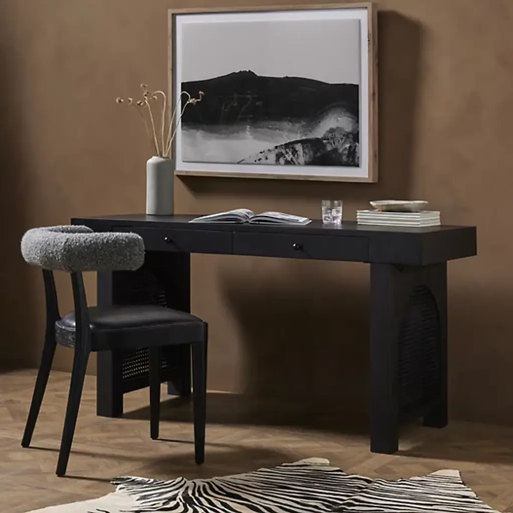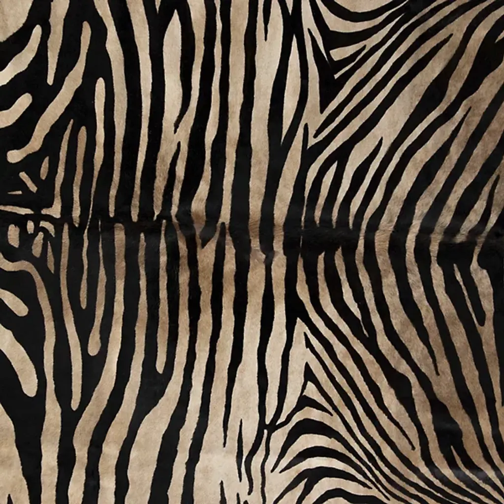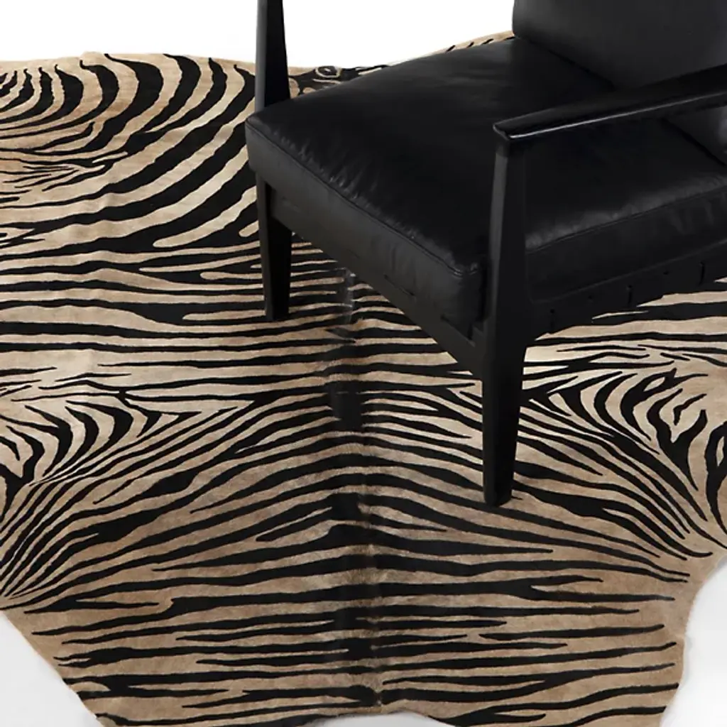Decorate your living space with the exotic Zebra Printed Hide Rug from Four Hands. This intricate piece boasts a zebra stripe pattern that draws in your eye. Your hair on hide rug takes on an abstract shape, adding a modern artisanal quality. Place this rug in spaces needing adventurous updates.
