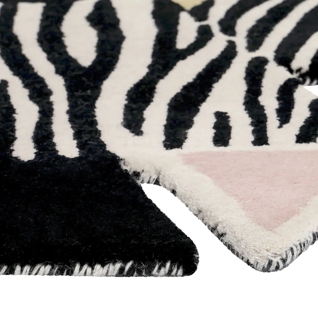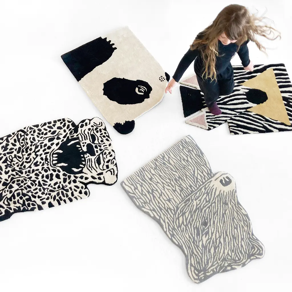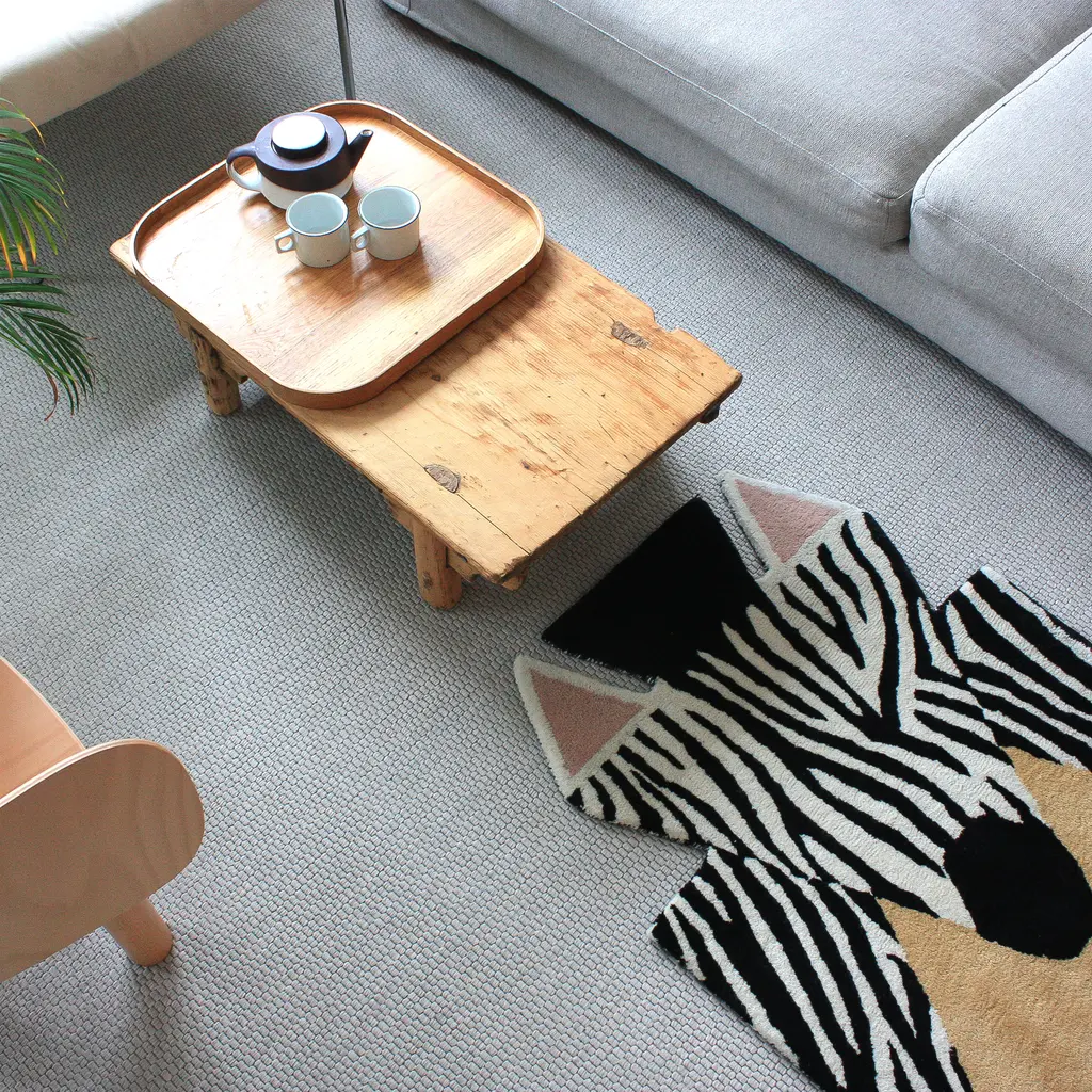 A classic black-and-white with a twist—this zebra trades the savannah for the living room, but keeps all its charm. The design plays with contrast and rhythm, turning the animal’s natural camouflage into a graphic accent piece. It doesn’t scream for attention, but you’ll find it hard not to look. Handmade from thick, soft New Zealand wool, the rug is both gentle underfoot and visually striking—long enough to stretch across a kid’s bedroom or add a bit of wild to a quiet corner. There’s a lightness to the expression, a touch of humor, and enough detail to feel considered. Whether it ends up under a chair or center stage, this is the kind of piece that sparks stories.