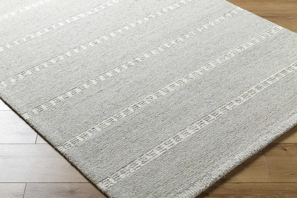 Collection: Zelda Colors: Ash, Silver Gray Construction: Hand Tufted Material: 100% Wool Pile: Medium Pile Pile Height: 0.39" Styles: Contemporary Backing: Canvas Made In: India Thickness: 0.59" Price Range: $$$$$ (Affordable)