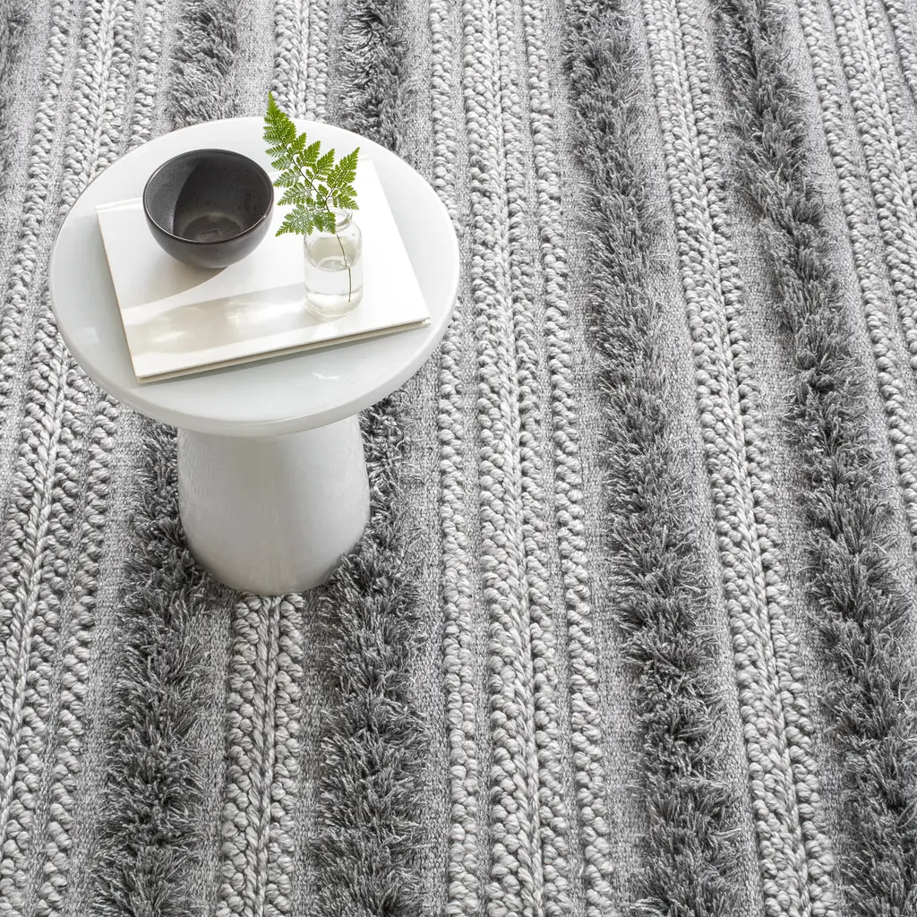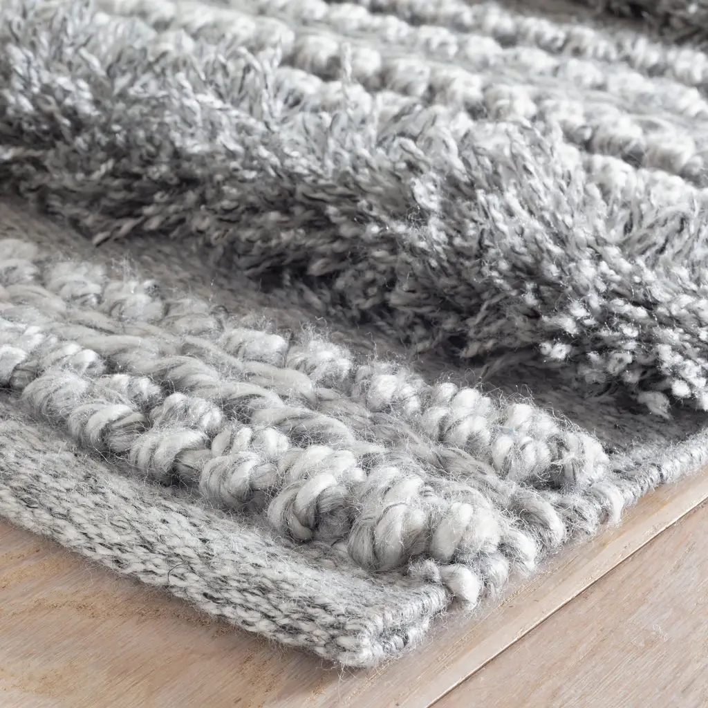 Annie never misses an opportunity to pile on the tactile texture and playful patterns. In this monochrome ode to texture supreme, stripes of nubby knots and sultry shag promote a relaxed sensibility with a bohemian flair. Handcrafted in "wool-touch" fibers, engineered to stand up to just about everything with all-the-way performance (or is it PAWformance?) par excellence. For versatility and comfort, you can't beat our innovative new designs in wonderful washable soft handed fibers.
