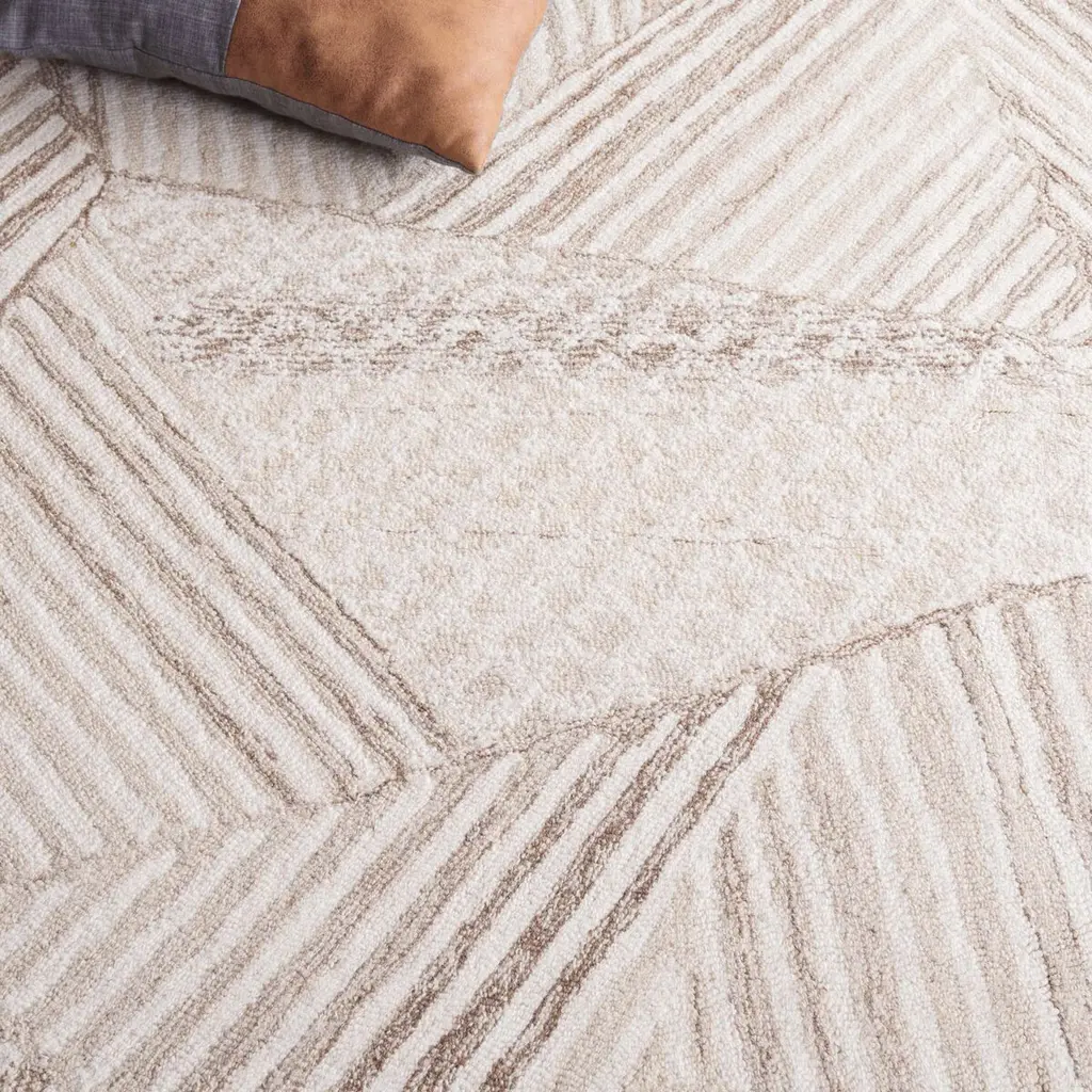 Elevate the ambiance of your space with this contemporary area rug. Measuring 4 feet by 6 feet, its small rectangular shape is an ideal fit for cozy areas where style is a must. The harmonious blend of ivory and light brown tones complements any decor, whether modern or classic. Its geometric pattern adds a layer of visual interest that draws the eye and creates depth. Crafted in India, the rug features a hand-tufted weave technique, blending wool and cotton to provide both comfort and durability. At 1/2 inch in height, it offers a plush feel underfoot without being too overwhelming. This rug is perfect for adding a touch of sophistication to living rooms, bedrooms, or study areas. Experience the perfect mix of texture and style and transform your living space today.