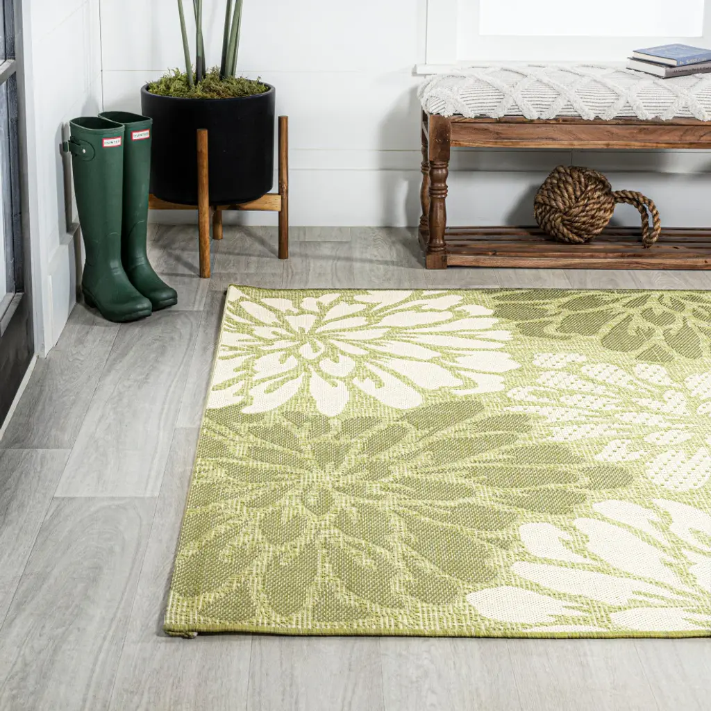 Add some graphic punch to your porch or patio with the bold blooms on our modern floral rug. The large-scale pattern has a geometric effect in a simple palette of sage green, brown and beige. The flatweave design is great for high-traffic spaces indoors too.Features:• Flat-weave construction of 100% polypropylene• Soft green and cream with a handwoven mingled texture• Water resistance with 0.19" pile• 100% Polypropylene• No backing, use of rug pad is recommended (sold separately)• Power Loomed in Turkey• Actual Dimension: 9 ft. x 12 ft.• Color: Green/Cream• Thickness measures: 0.19 in.• Available in multiple sizes and/or colorsRug Care:• Vacuum regularly and spot clean as needed; avoid direct and continuous exposure to sunlight; use brushless vacuum; remove spills immediately; if liquid, blot with clean, undyed cloth by pressing firmly around the spill to absorb as much as possible; for hard to remove stains, professional rug cleaning is recommended; store in a dry, well ventilated area and rotate for consistent wear• Packing and shipping may cause temporary creases in rugs, which will flatten out after a week on the floor; to expedite the process, try back-rolling your rug before laying it down, and then allow ample time for the remaining creases to relax• Please Note: Due to differences in monitors, some rug colors may vary slightly. Lengths and widths may vary from the published dimensions. Patterns may vary slightly according to shape and size selected.About us:Style your floors with JONATHAN Y. By combining fine craftsmanship and design, this New York creative studio is bringing fashion to your floors. The collection mixes sustainable organic materials, vibrant colors and trend worthy styles to create JONATHAN Y''s distinctive catalog of rugs.