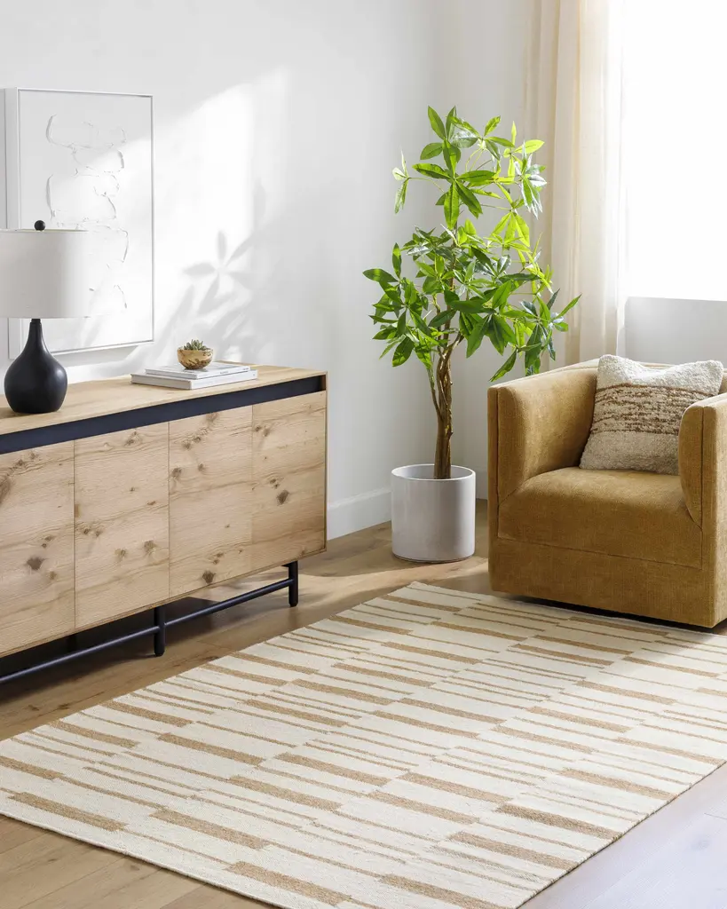 Collection: Zofia Colors: Pearl, Camel, Warm Gray Construction: Hand Woven Material: 100% Wool Pile: No Pile Styles: Contemporary Made In: India Thickness: 0.23" Price Range: $$$$$ (Affordable)