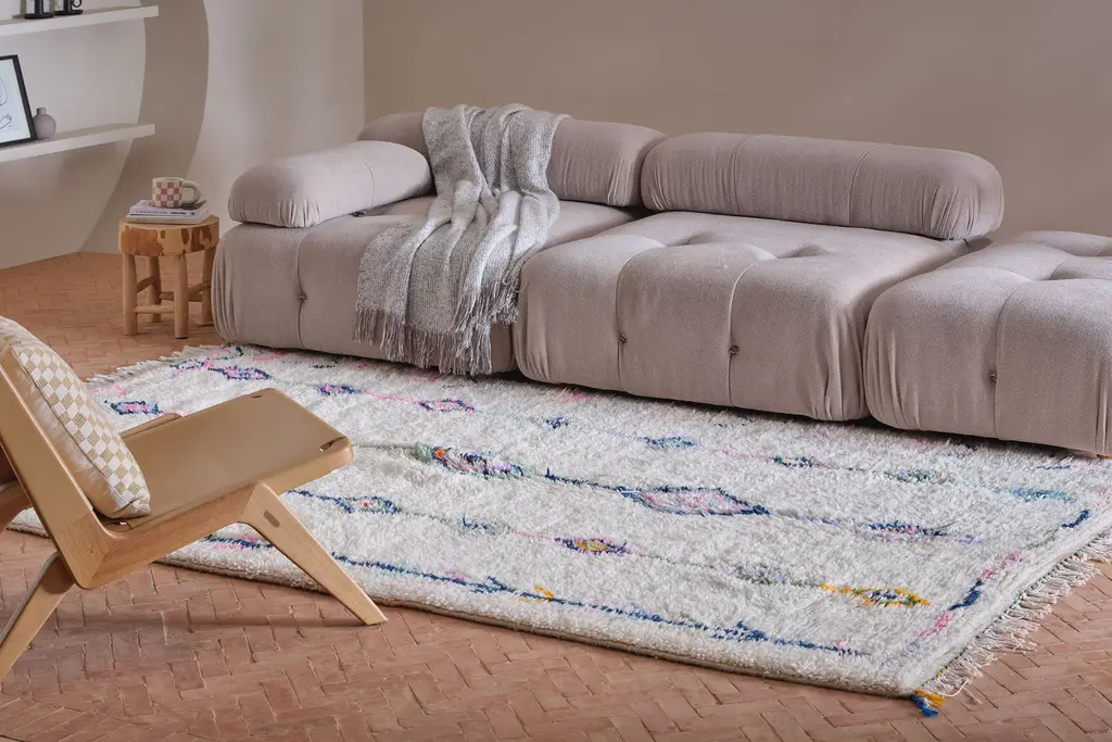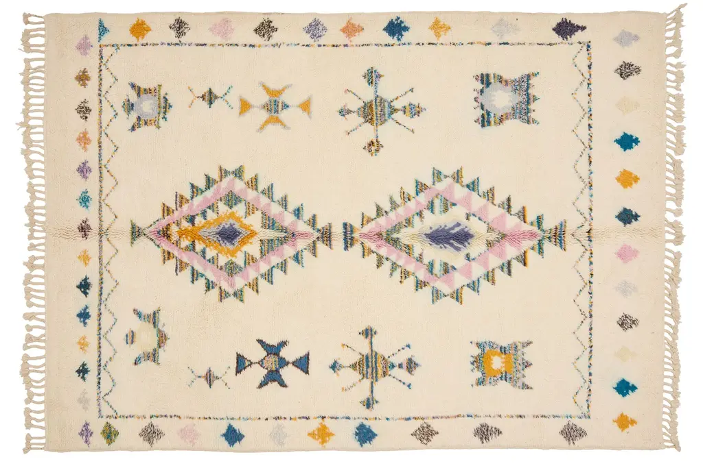 Our Moroccan pieces are each one-of-a-kind. Much of our collection was woven between 30 and 100 years ago, and curated by us. Other rugs in our collection are fresh off the loom and made with traditional techniques. Moroccan rugs don’t come with a key. As with any painting or poem, their motifs have many subjective interpretations. Originally made for personal use, these rugs took months to weave, documenting a shifting tide of events and emotions in the weaver’s life.