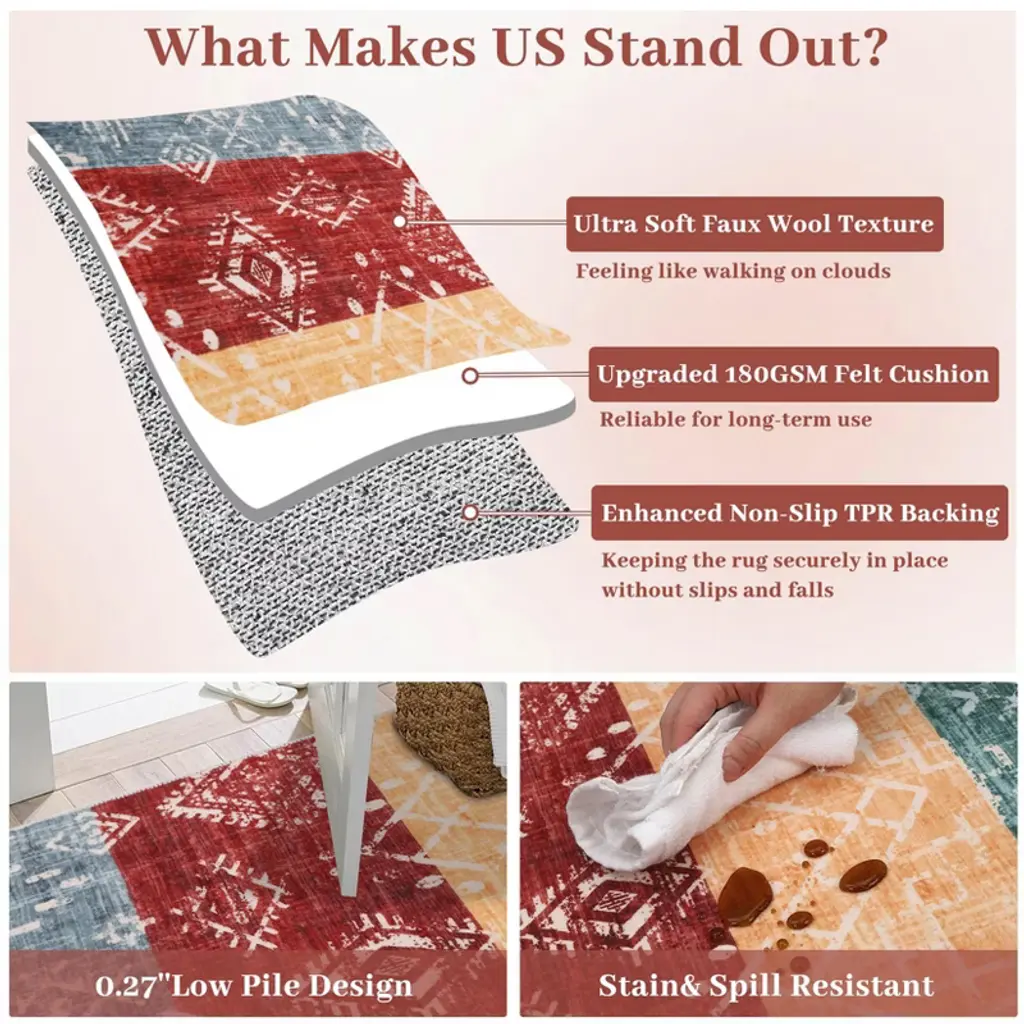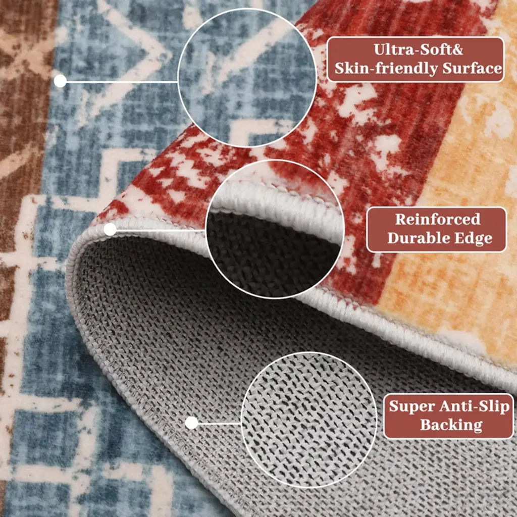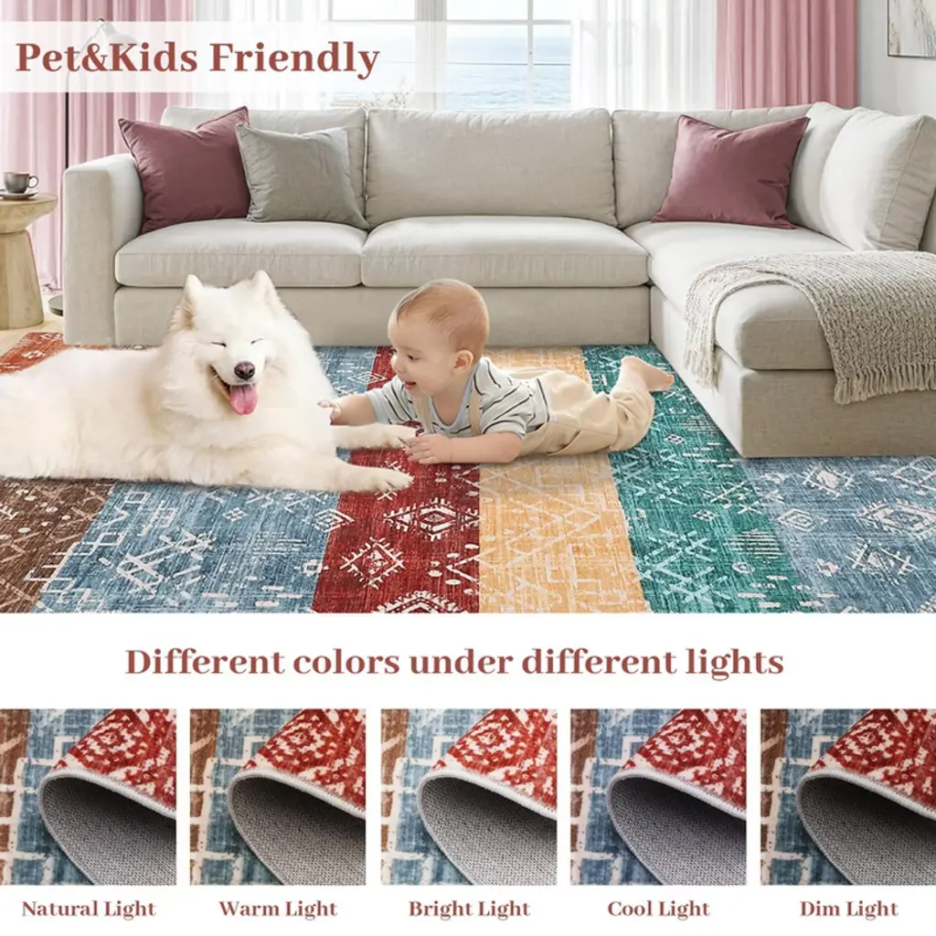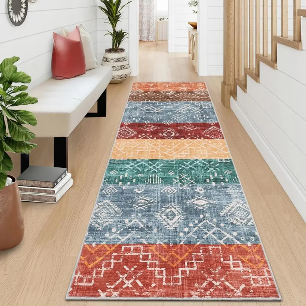 With non slip backing, safe for families and pets, ensuring a friendly environment for all.Features a colorful geometric pattern, adding a modern and structured elegance to the space.This washable rug features a stain resistant, high durability construction - making it perfect for high traffic areas.The low pile provides a flat and even surface that is both easy to maintain and perfect for high-traffic areas, while still maintaining a soft and comfortable feel underfoot.Effortlessly preserved through simple care methods like hosing or machine washing, spot cleaning with a gentle detergent, and routine vacuuming to ensure it stays pristine and vibrant.