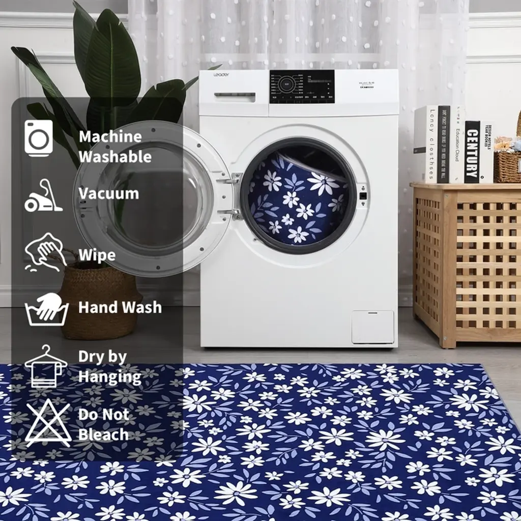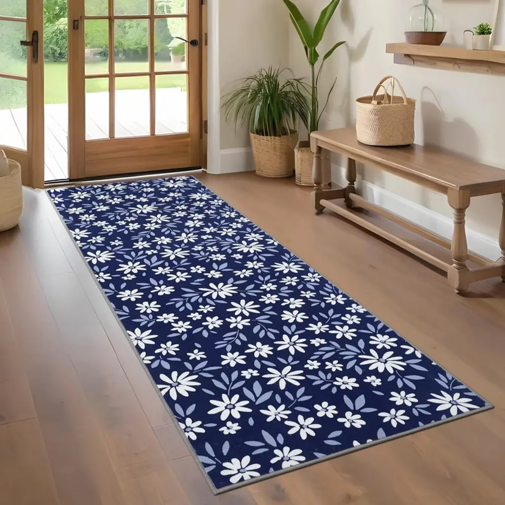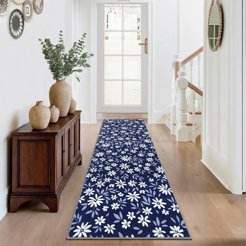 2' X 6' Washable Modern Floral Print Runner Rugs For Entyway Laundry, Soft Non Slip Low Pile Carpet For Home Office, Navy
