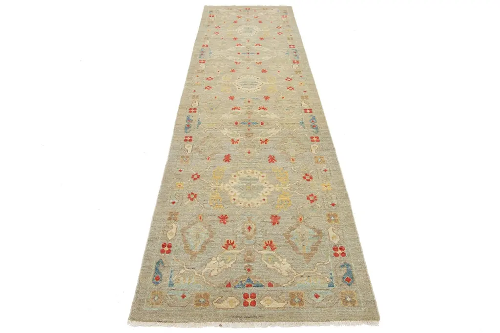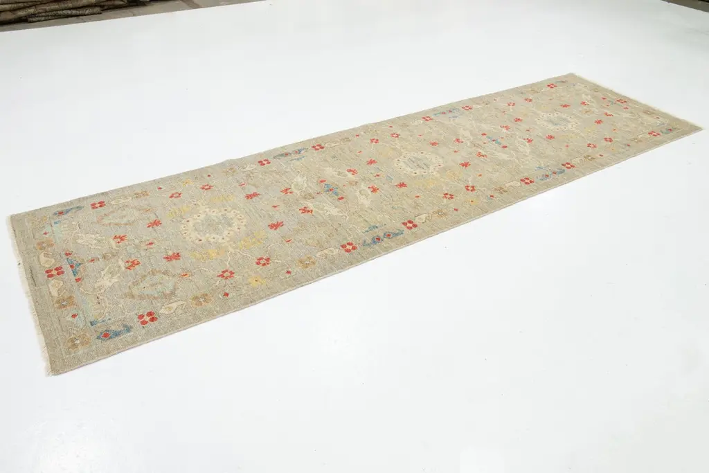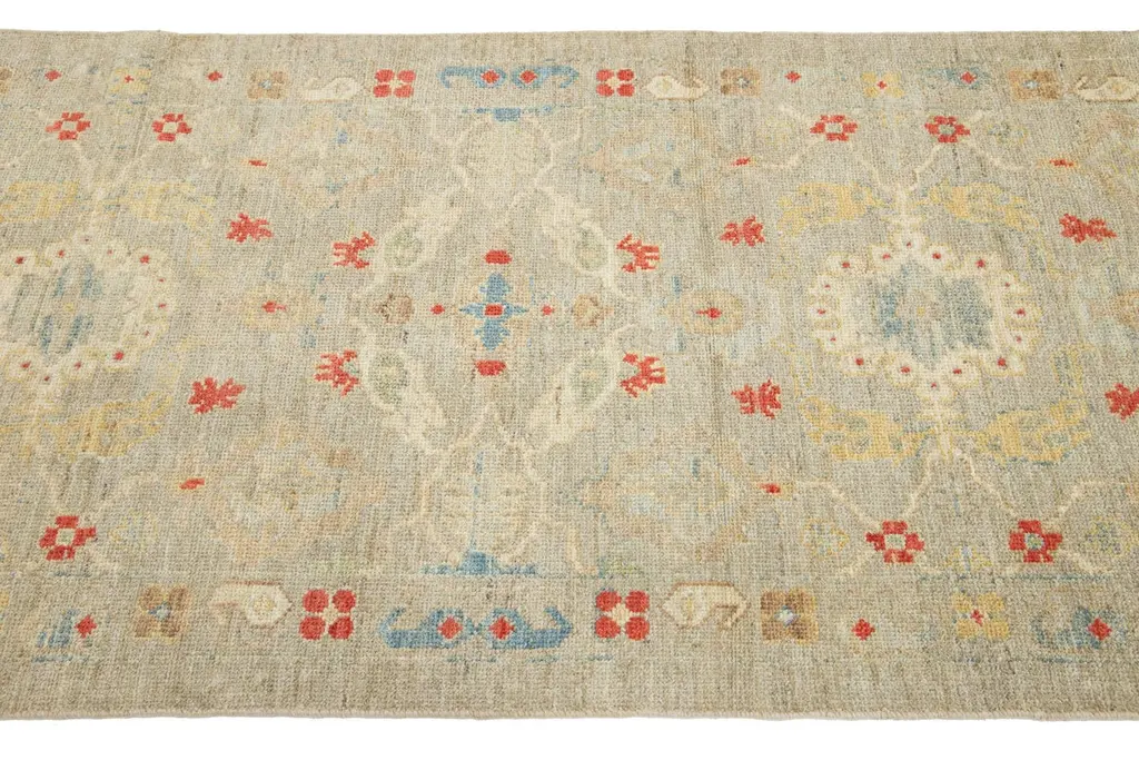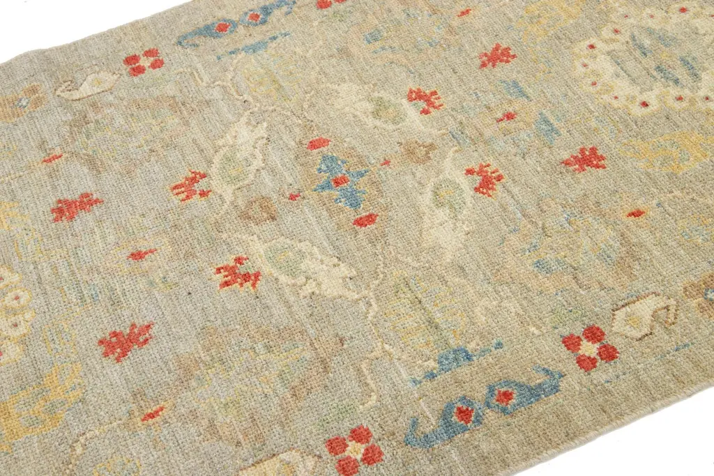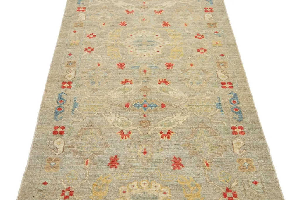 The design showcases a beautiful contemporary Sultanabad runner rug, hand-knotted from wool, featuring a light gray and beige field with deep red and blue accents. This similarity is due to the magnificent graphic nature of the designs.This rug measures 3' 2" x 11' 6".