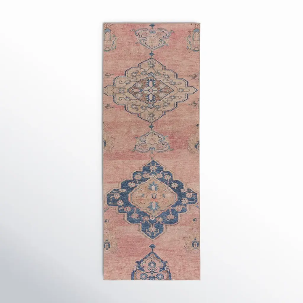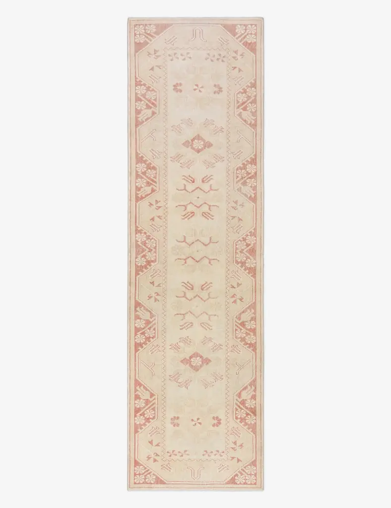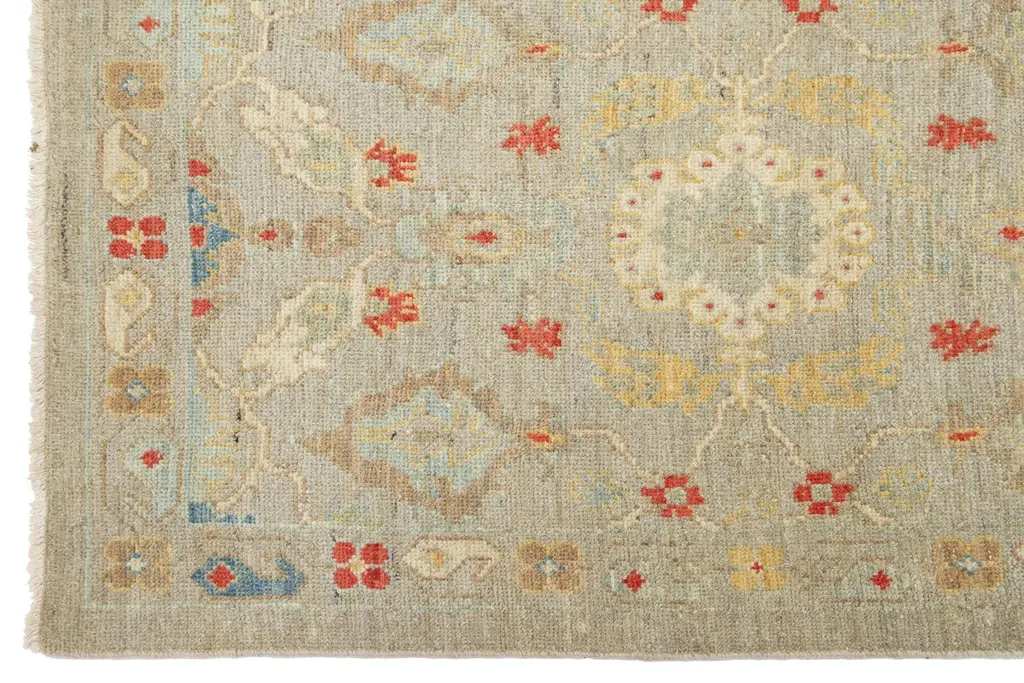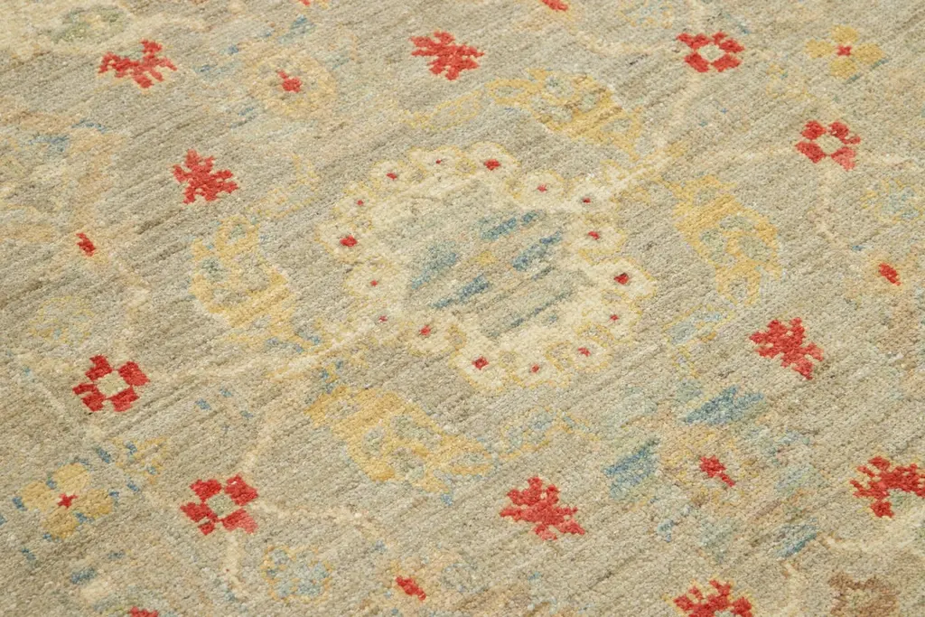 The design showcases a beautiful contemporary Sultanabad runner rug, hand-knotted from wool, featuring a light gray and beige field with deep red and blue accents. This similarity is due to the magnificent graphic nature of the designs.This rug measures 3' 2" x 11' 6".
