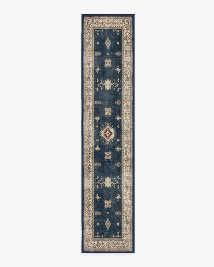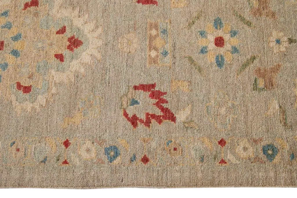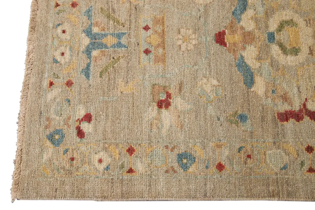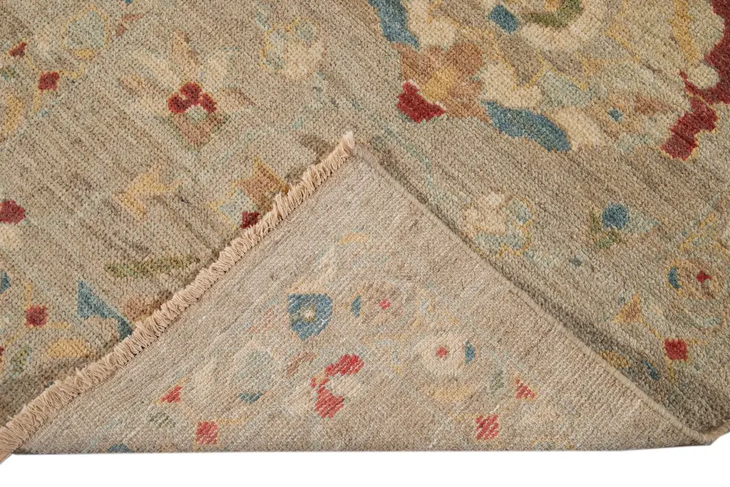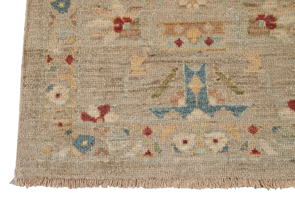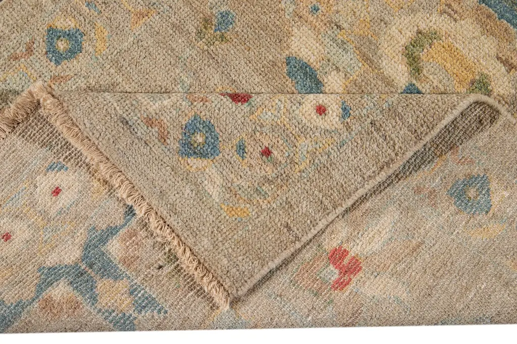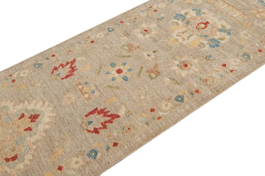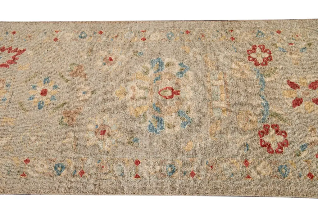 Beautiful contemporary Sultanabad runner rug, hand knotted wool with a tan field, ivory, red and blue accents in an all-over designThis rug measures 2' 10" x 18' 3".