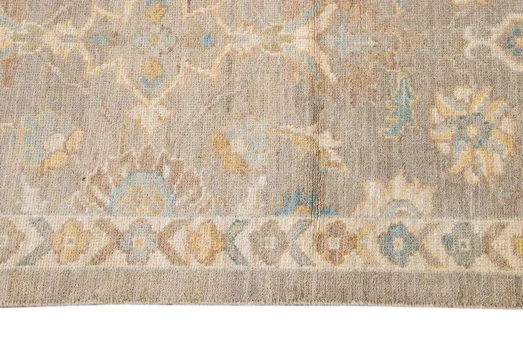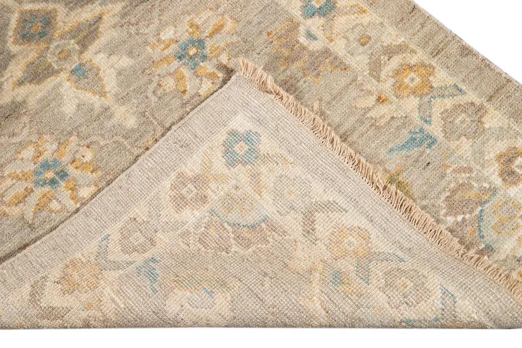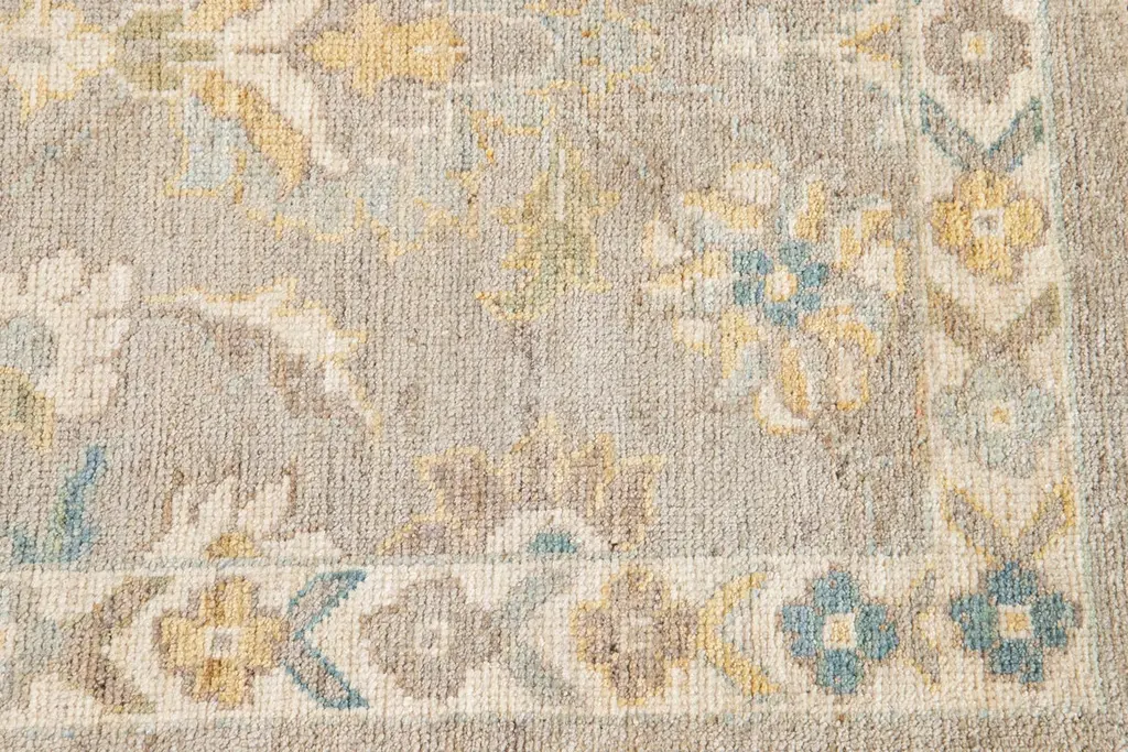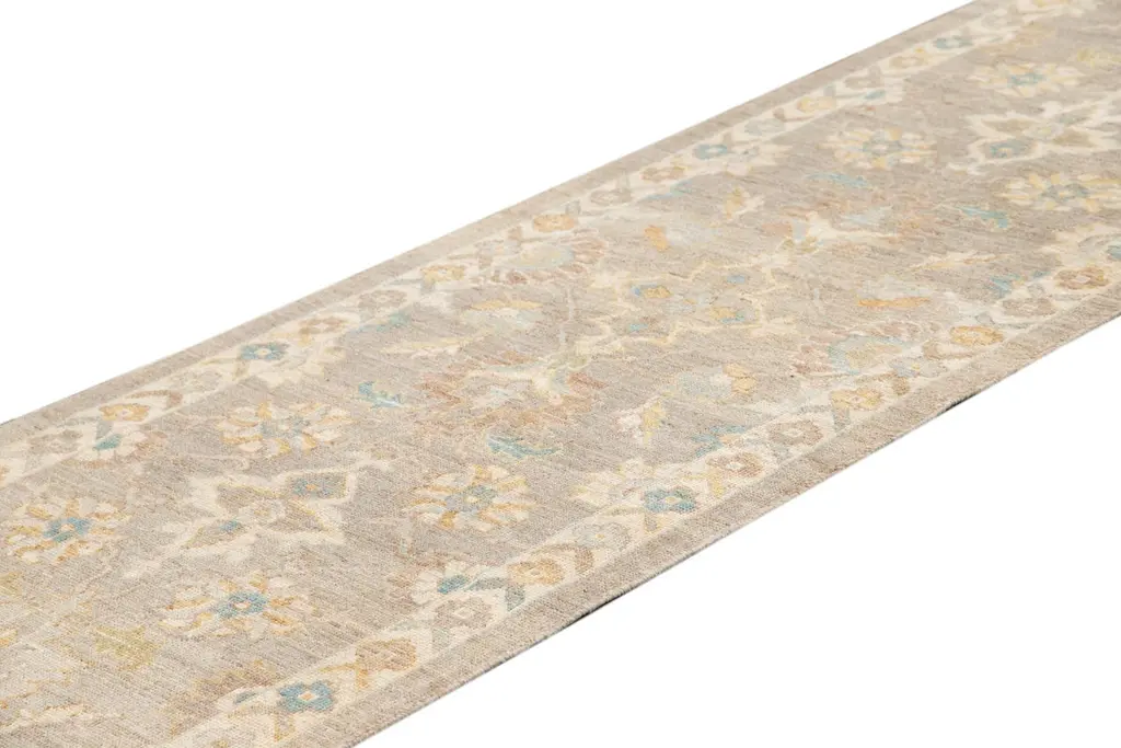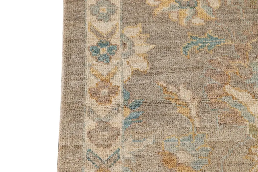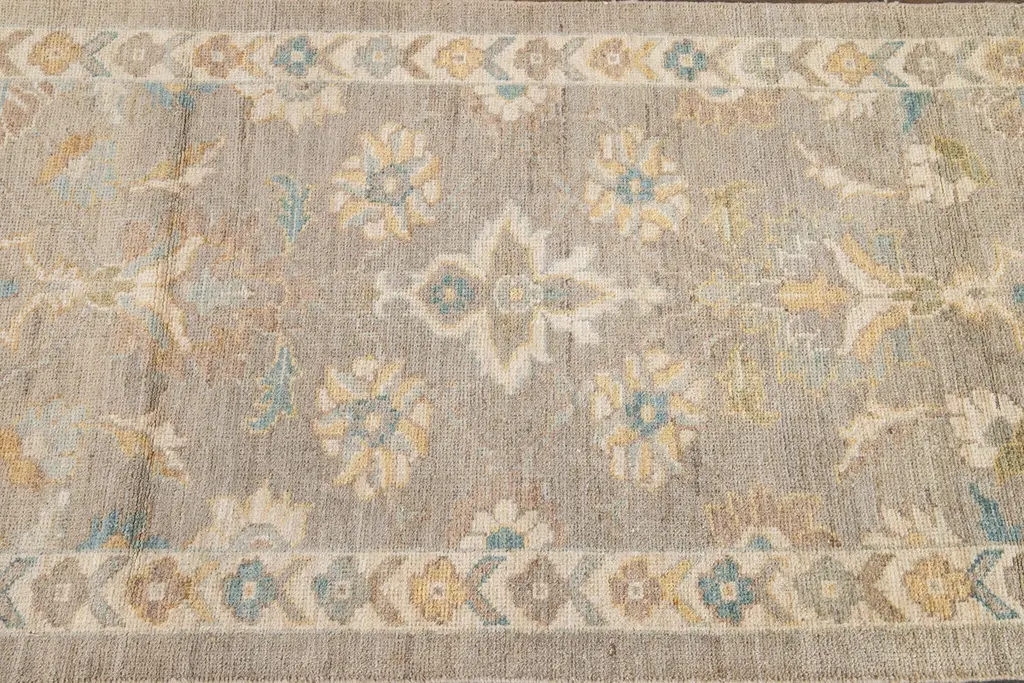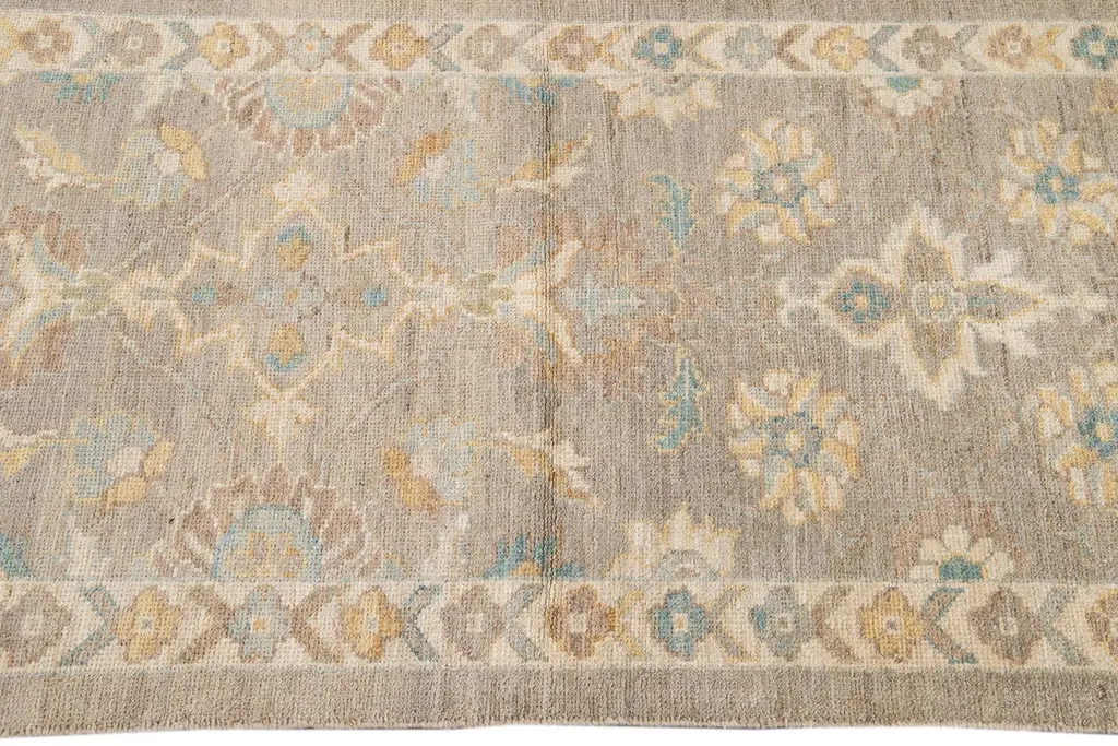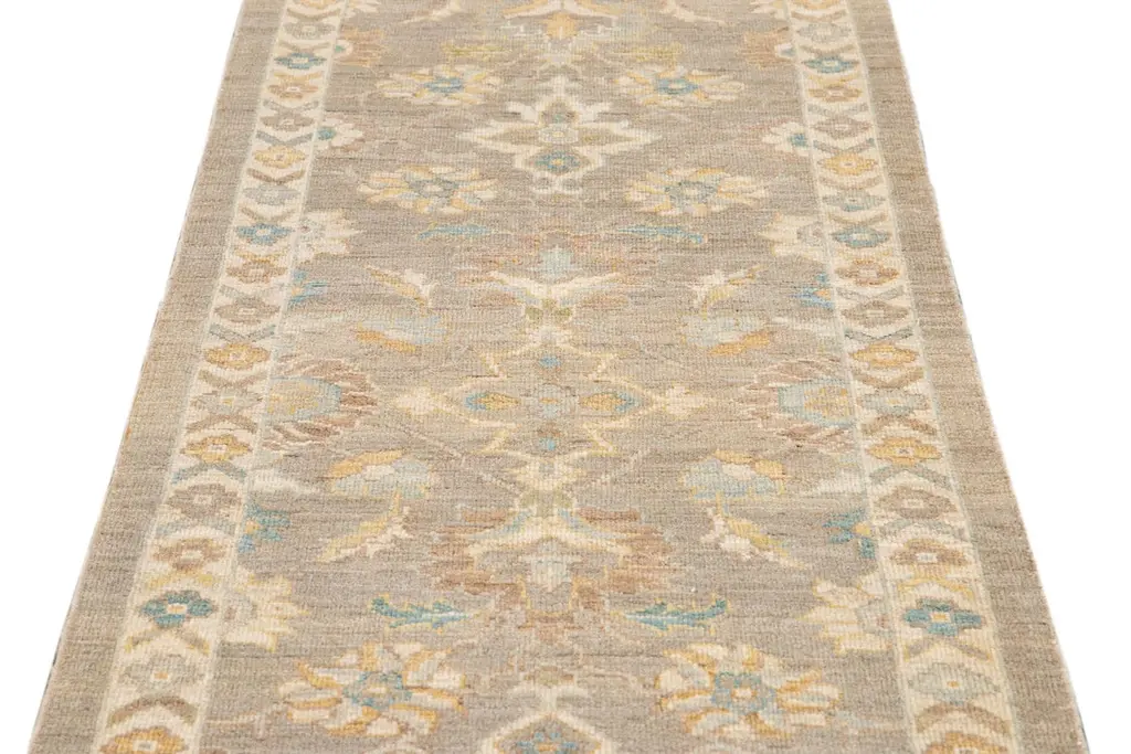 Beautiful contemporary Sultanabad runner rug, hand knotted wool with a tan field, blue and yellow accents all-over the design.This rug measures 2' 11" x 12' 1".
