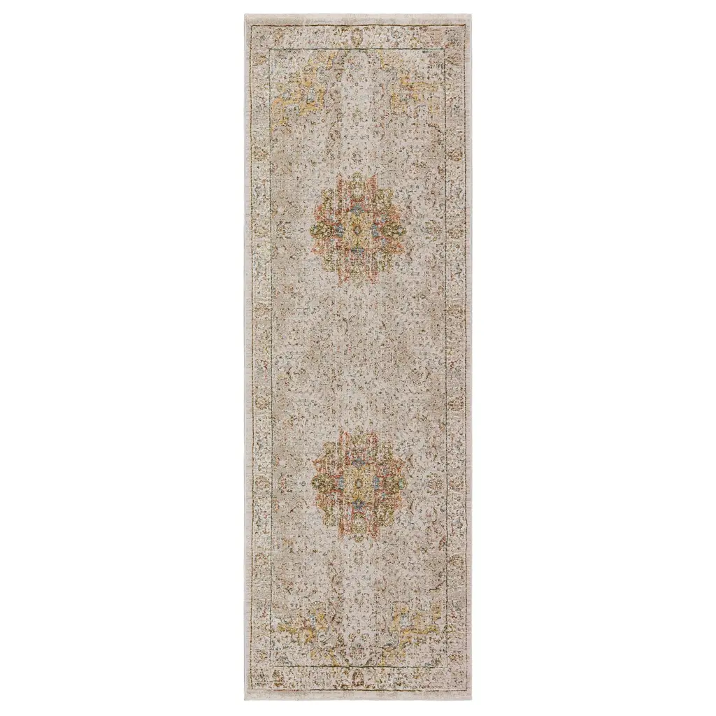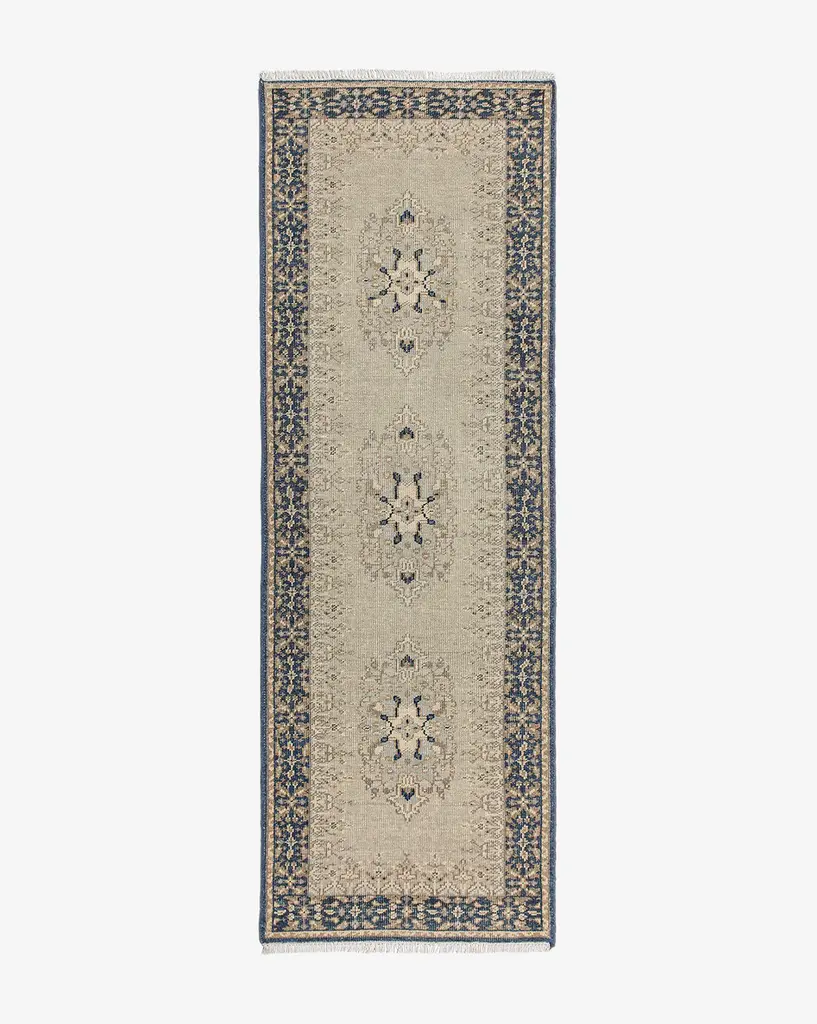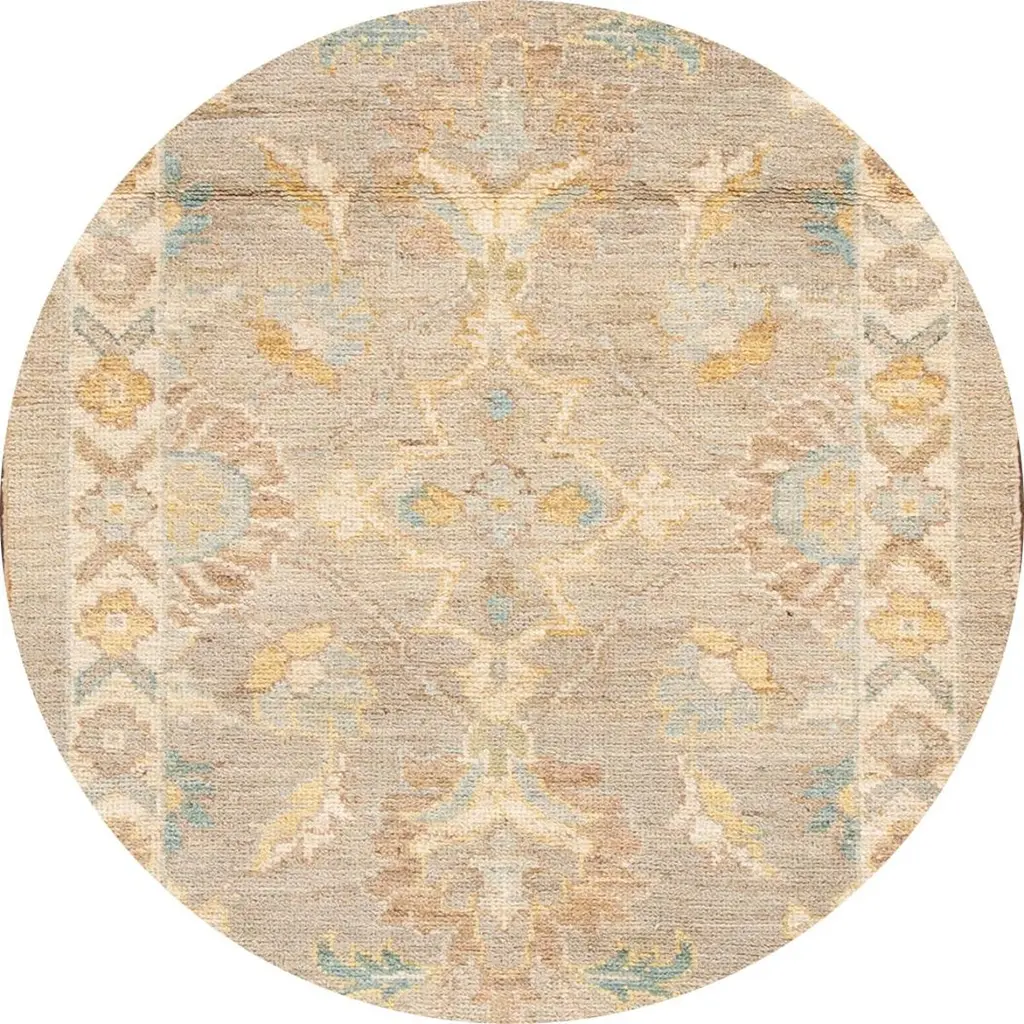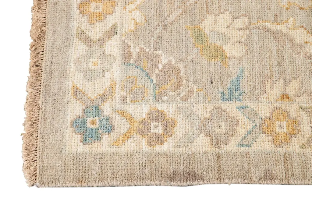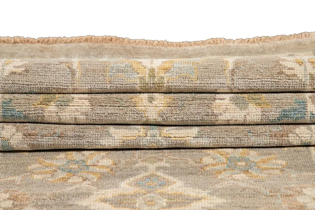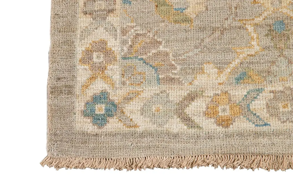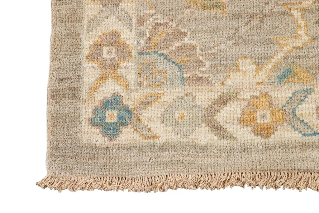 Beautiful contemporary Sultanabad runner rug, hand knotted wool with a tan field, blue and yellow accents all-over the design.This rug measures 2' 11" x 12' 1".