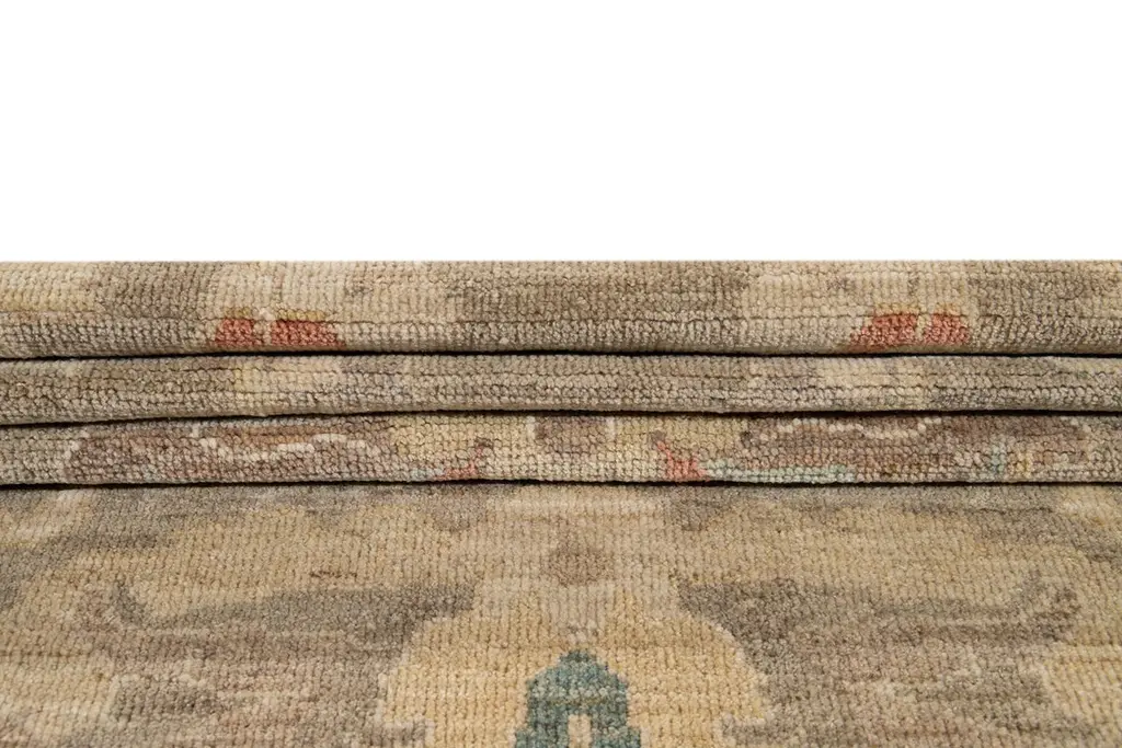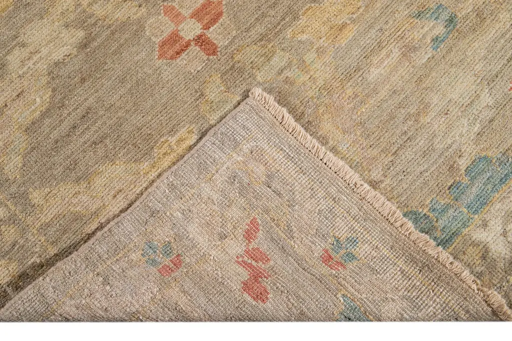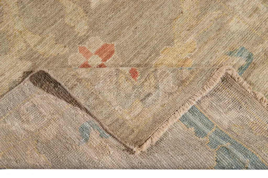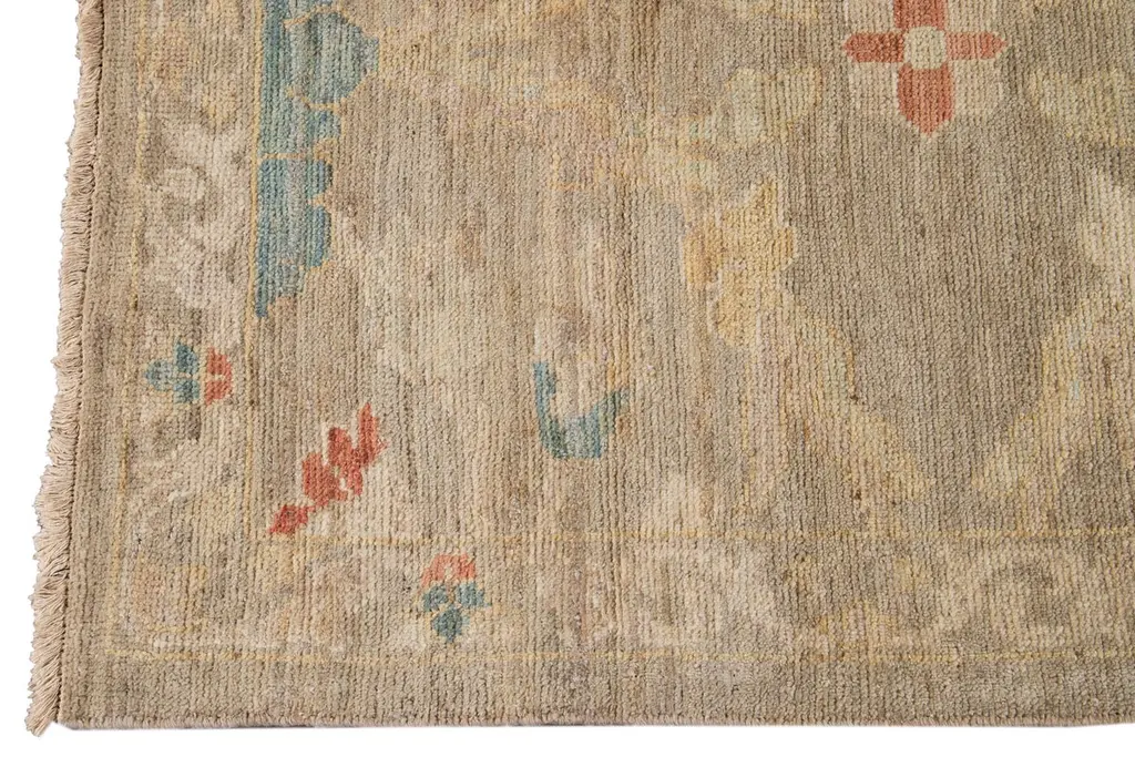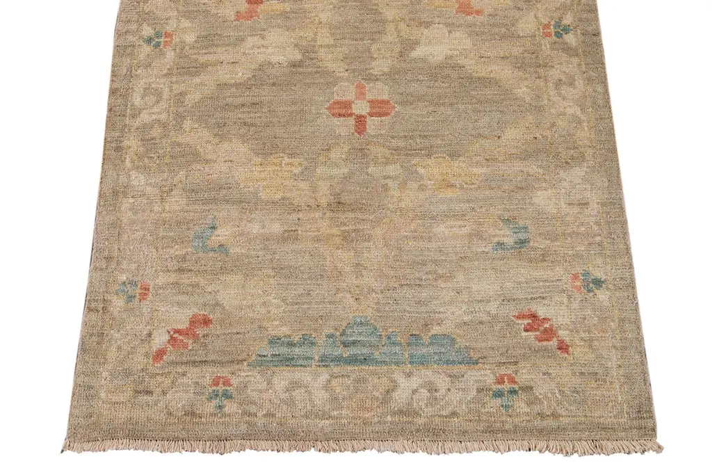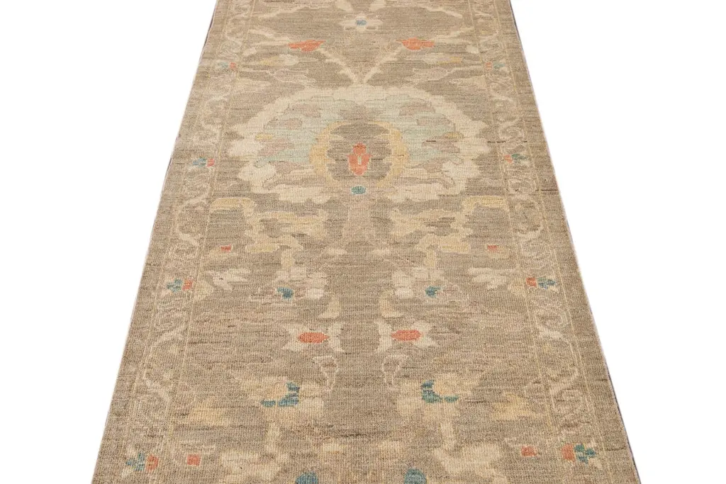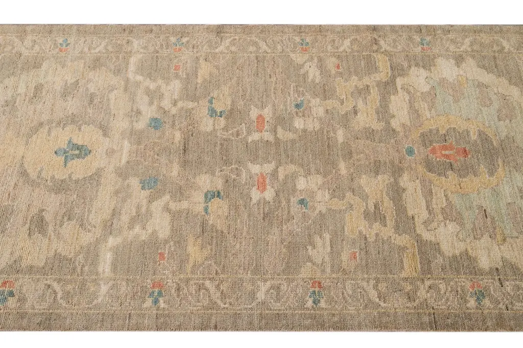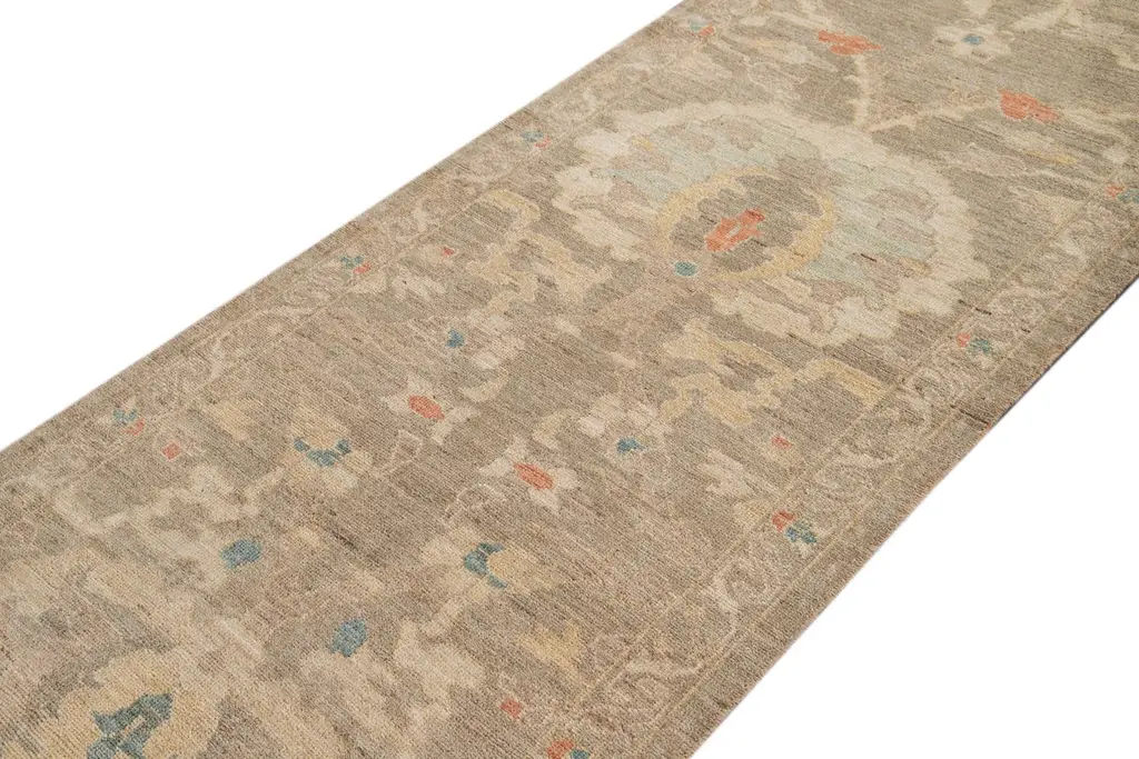 Beautiful contemporary Sultanabad runner rug, hand knotted wool with a tan field, ivory and blue accents in an all-over designThis rug measures 3' 3" x 15' 8".