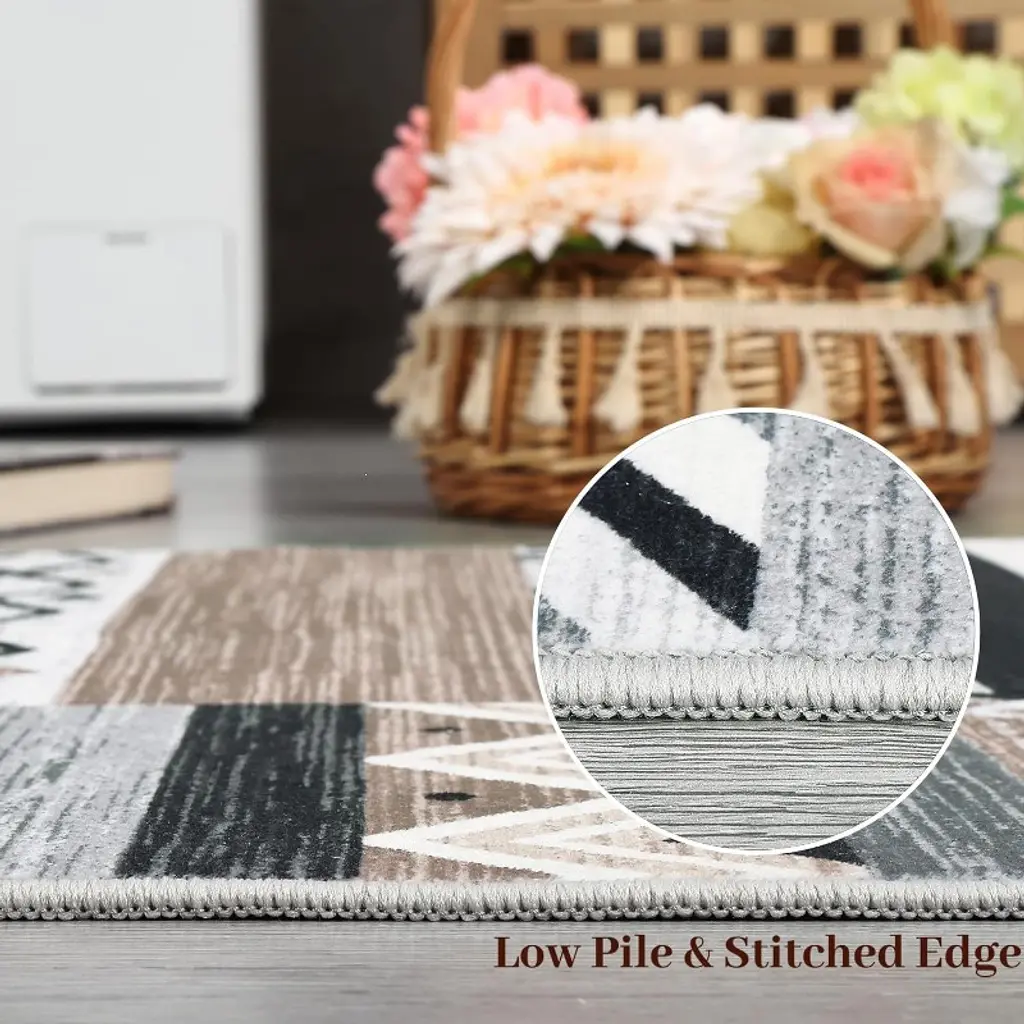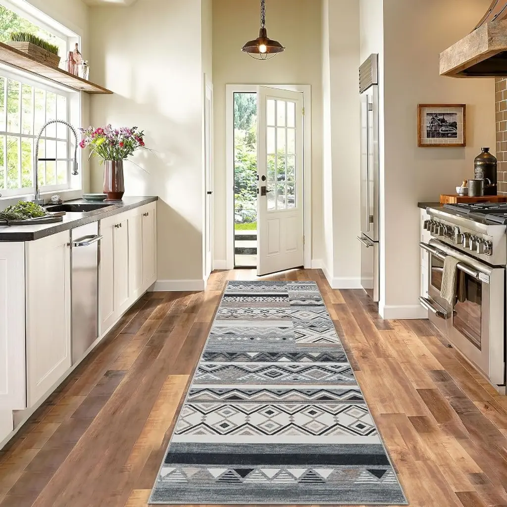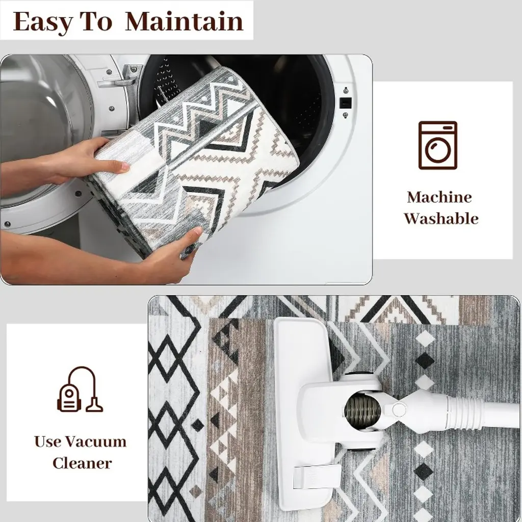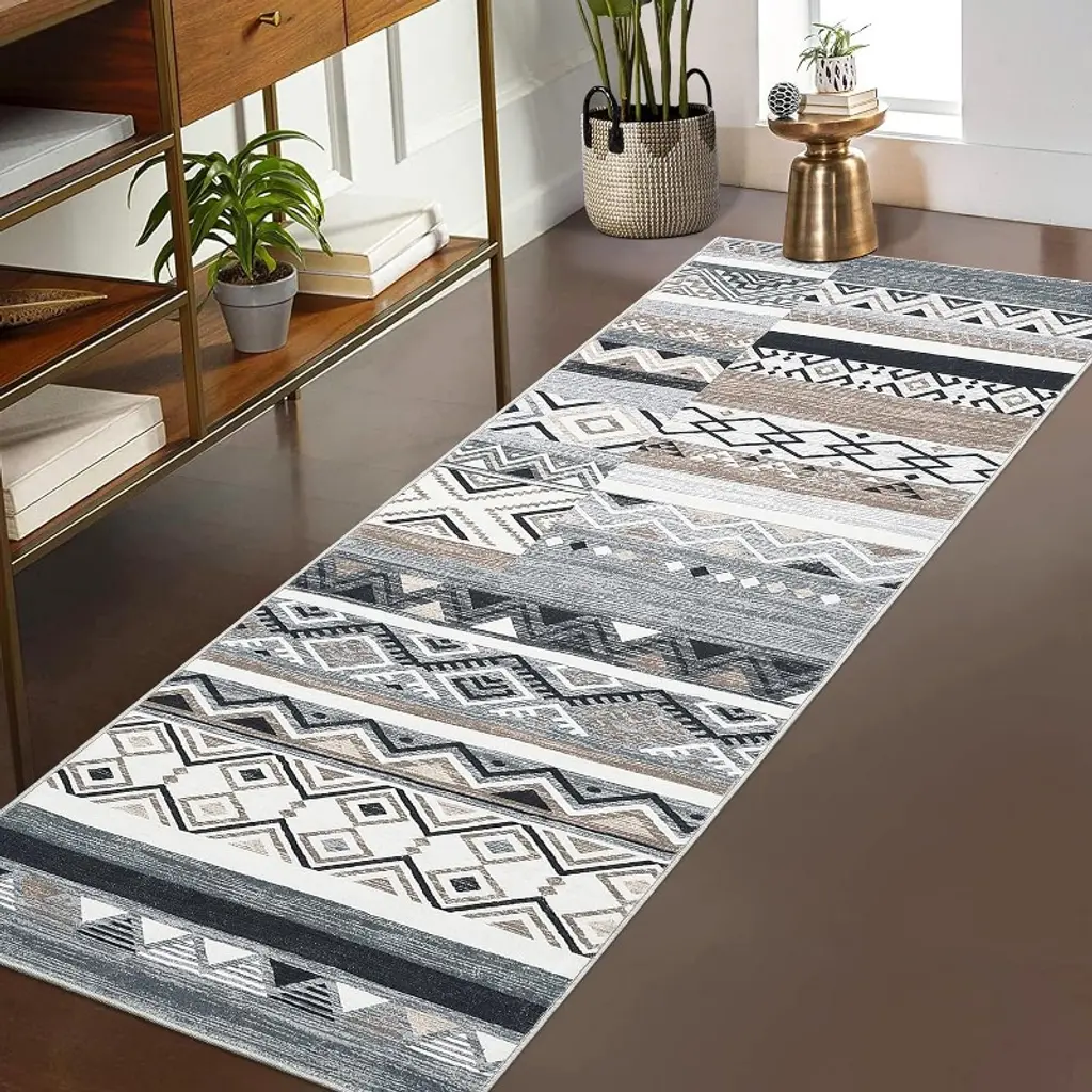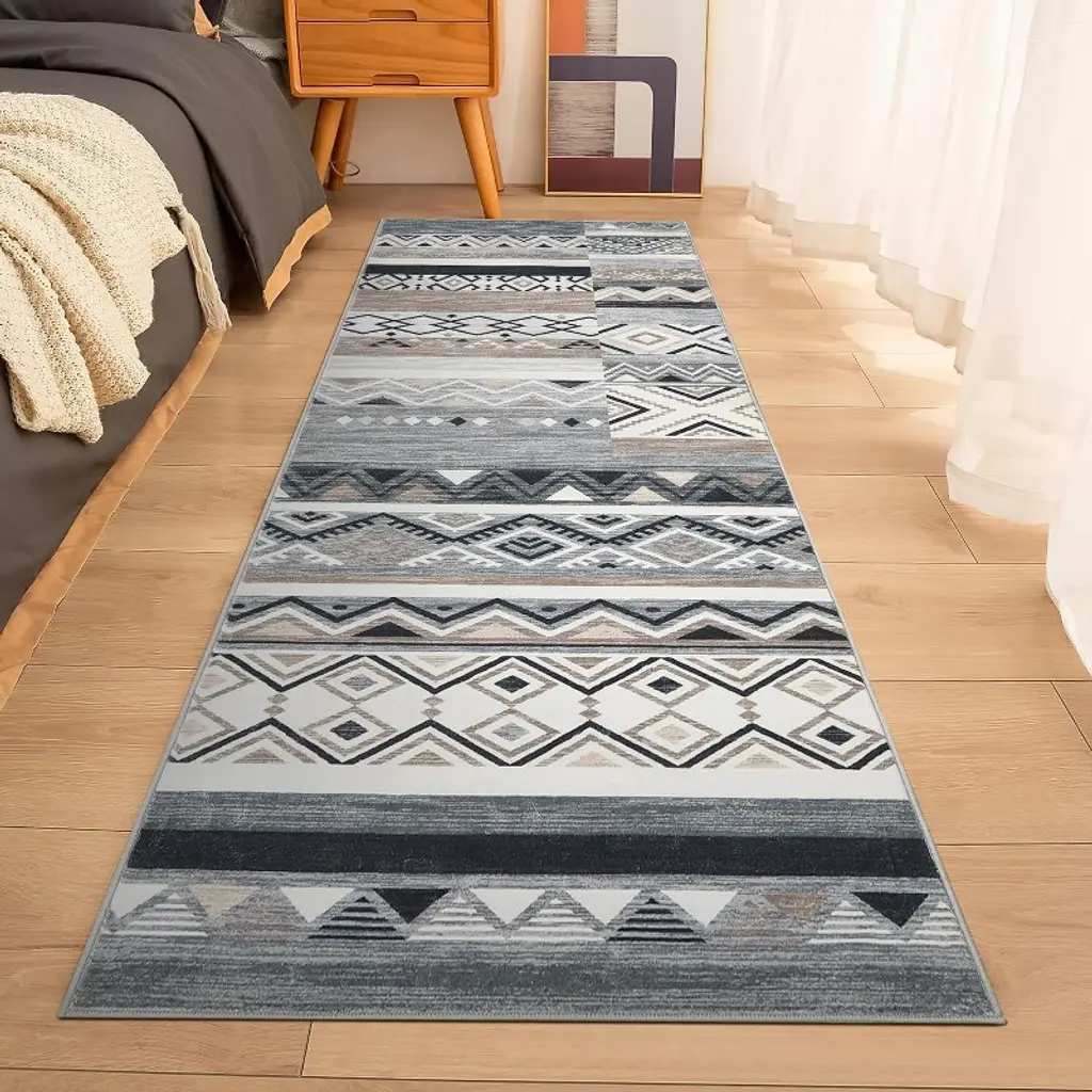 2X6 Ft Vintage Patchwork Runner Rug ̈C Washable Grey Non-slip Geometric Carpet, Stain-resistant Indigenoussoft Low-pile Foldable Floor Mat