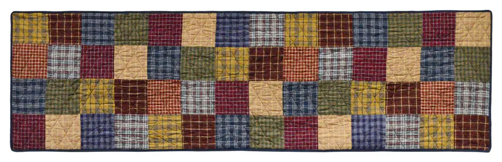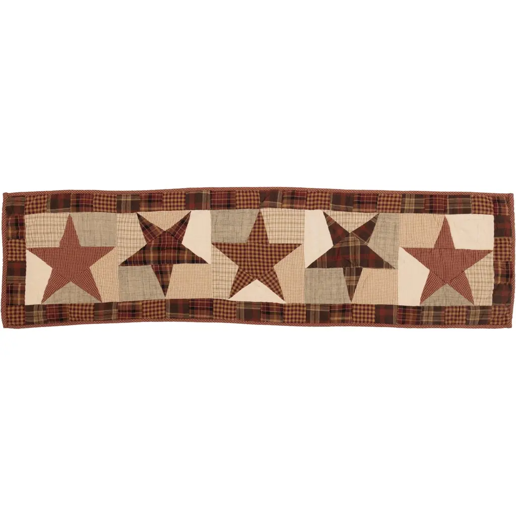 The Abilene Star Collection features warm rustic colors with plaids and stars layed out in a five patch star pattern to create a down home country inspired look for your dining area.Features PREMIUM CONSTRUCTION: with over two decades experience crafting goods for American homes, our items are built to last for years to come.PRIMITIVE DECOR: traditional style that compliments any primitive or Americana home.QUALITY MATERIAL: made with durable 100% cotton shell for a proper look and feel.Echo and stitch in the ditch hand-quilting5-Point stars in assorted burgundy fabrics trail the center surrounded with coordinating patchwork block borderStraight edge with .5" bias cut red microcheck bindingReverses to burgundy, black, creme, and tan plaidPatchwork: Hand-quilted, Machine piecedSpecifications Material: 100% Cotton, Cotton BattingColors: Burgundy, Tan, Dark BrownQuilting Stitch: Stitch in the Ditch, EchoManufacturer Country: IndiaCare: Machine Wash, Tumble Dry Low, Iron safeSizes Available 13" x 36" - 0.5 lb13" x 48" - 0.6 lb13" x 72" - 0.7 lb
