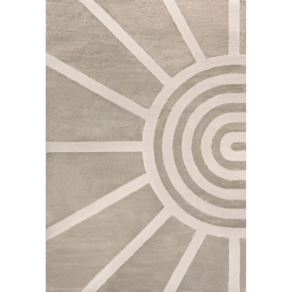 This casual rug features an abstract sun design and a crisp two-tone color scheme. Inspired by midcentury modern styles, it's woven from plush polyester, in a high-low pile that accentuates the pattern. Make a bold statement in the bedroom, living room or dining room with this geometric rug. Please note that variations in the rug's appearance may occur when the fibers are brushed due to natural light reflection and weaving characteristics.