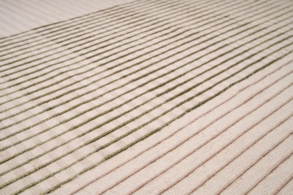 AGNES, simple and minimal contemporary handwoven area rug collection is inspired by Agnes Martin's delicate lines and the Japanese philosophy of Ma. The collection conveys a sense of simplicity and elegance. Its minimal design invites contemplation and serenity, a space for the mind to find peace and quietude. Woven with the warmth of wool and the spirit of nature, each thread celebrates the beauty of stillness.Hand crafted with meticulous detail, the Agnes contemporary area rugs are tactile canvases, bringing a lightness and airiness to the space while remaining grounded in their natural, textural beauty.Agnes Runner in Ivory and Green is a top quality flat-weave indoor rug handwoven with kilim technique in the villages of Turkey by traditional women weavers. Material is 100% Anatolian sheep wool.