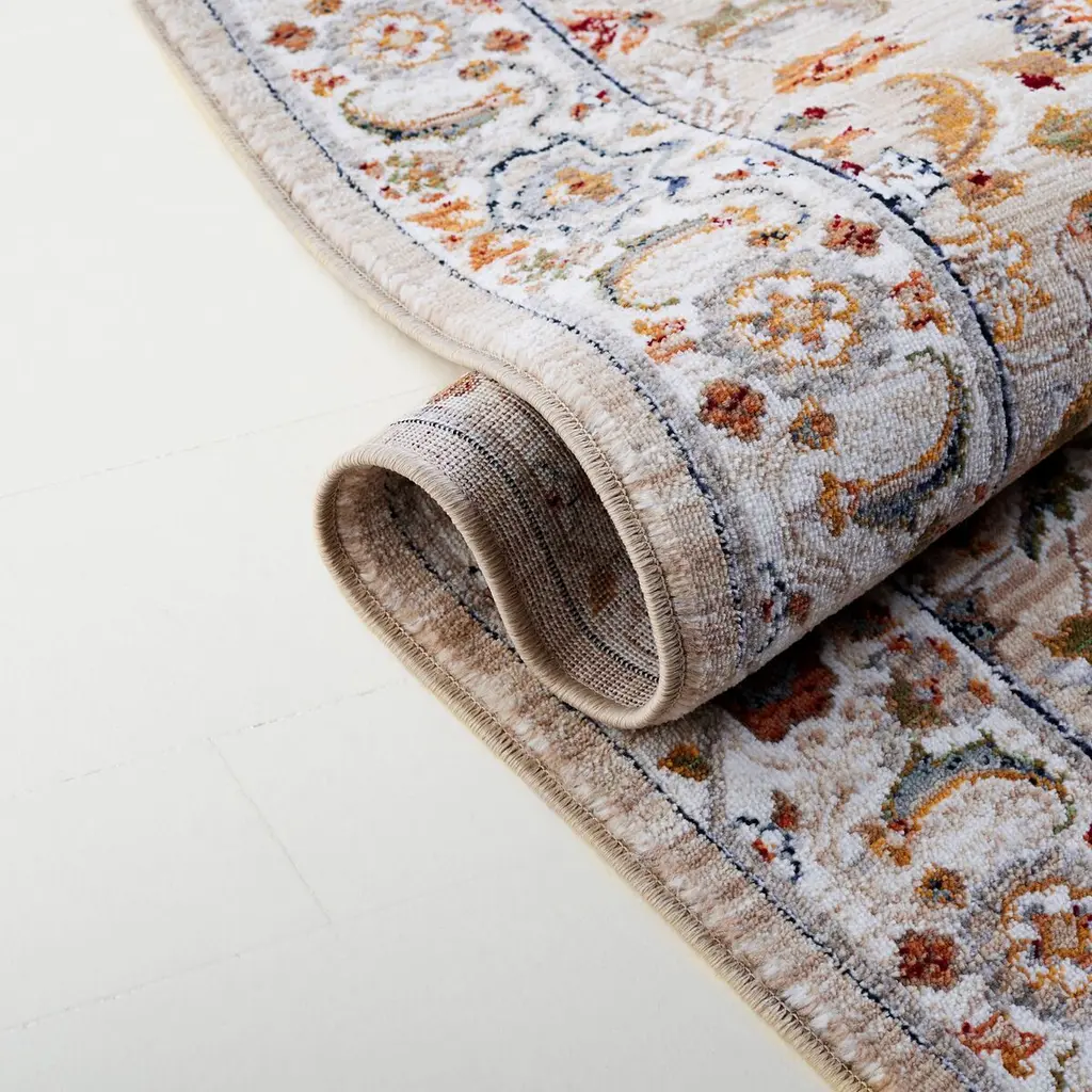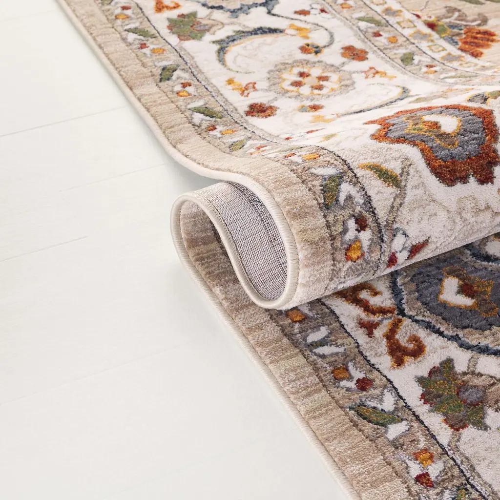 Introducing our exquisite 2'-6" X 8' Runner Area Rug in an enchanting Ivory/Rust palette, designed to elevate the elegance of your home. This transitional-style runner is meticulously crafted in Turkey using a power-loomed technique, which ensures a blend of durability and fine detail in every inch. Constructed of a superior quality combination of 65% Polypropylene, 30% Cotton, and 5% Polyester, this rug is not only soft to the touch but also capable of withstanding the rigors of high-traffic areas. With a comfortable pile height of 3/8", it provides a plush feel underfoot without compromising on the ease of maintenance. Our runner's pattern, as displayed in the image, showcases a harmonious mix of florals and ornamental designs, reminiscent of classic motifs yet with a fresh, modern twist. This striking design is framed by an equally stunning border, creating a cohesive look that will complement both traditional and contemporary decor. Safety and environmental accountability are also at the forefront of our priorities. That's why we're proud to announce that this area rug is OEKO-TEX certified, meaning it has been tested and verified as free from harmful levels of more than 100 substances known to be detrimental to human health. Whether you're gracing your hallway, entryway, or elongated living space with this runner, it will be a testament to your sophisticated tastes and commitment to quality. Make this Ivory/Rust runner area rug the