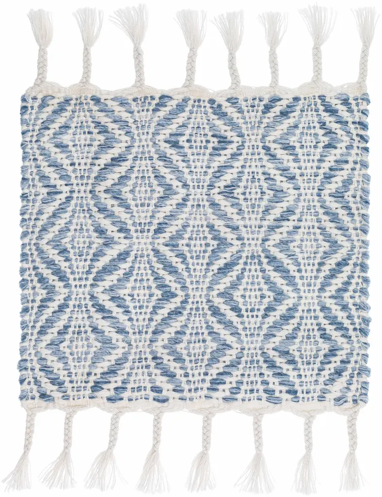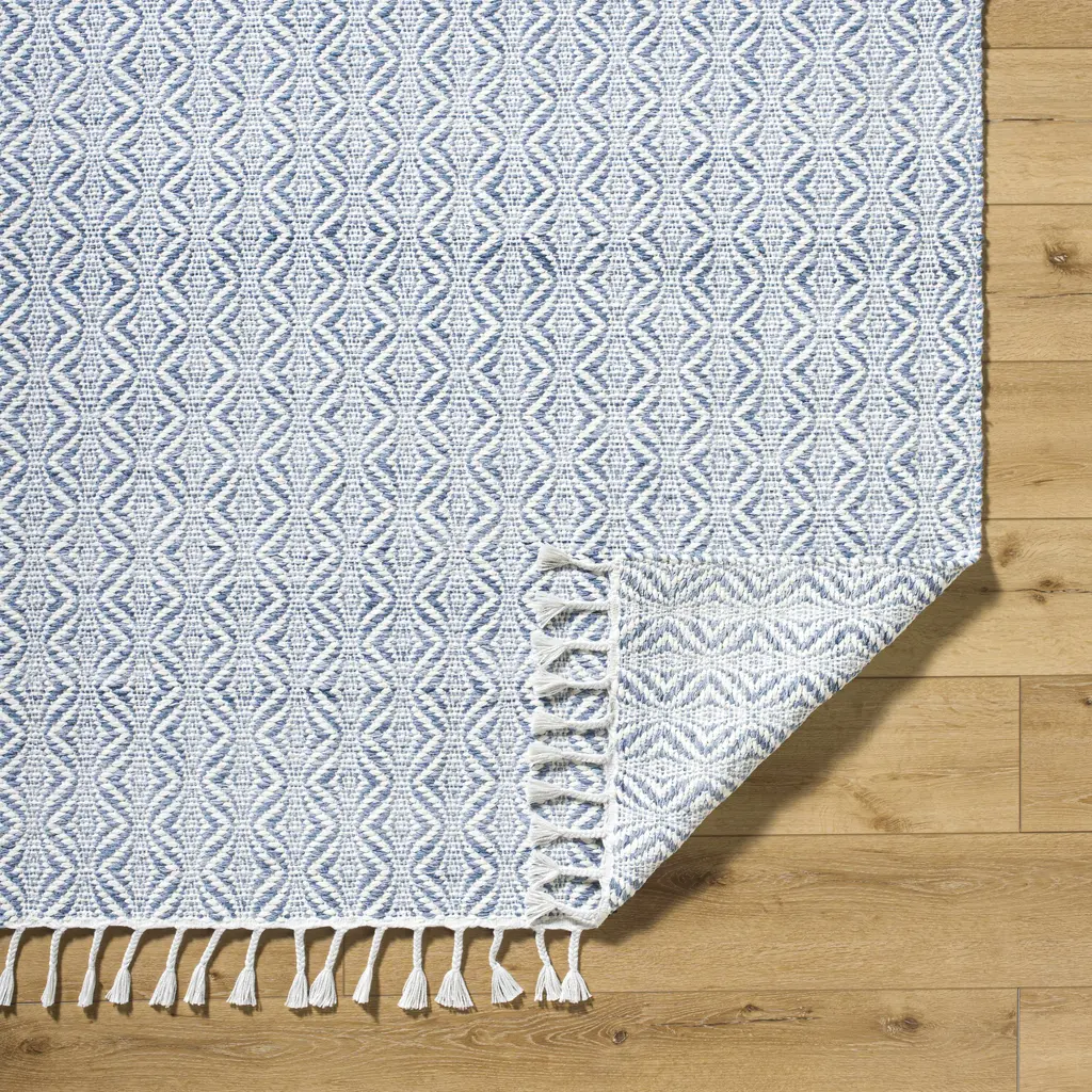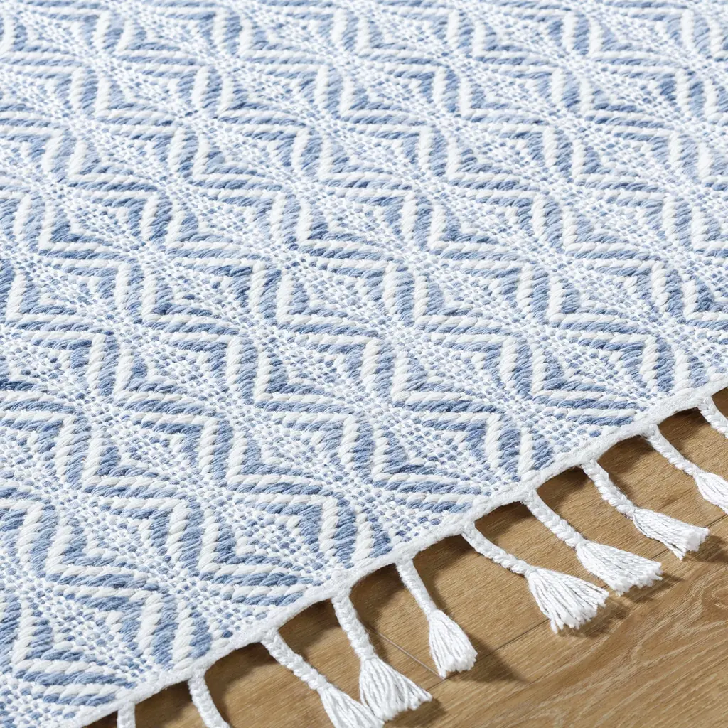 Collection: Anelia Colors: Sky Blue, Powder Blue, Ivory Construction: Hand Woven Material: 100% Recycled PET Yarn Pile: No Pile Styles: Transitional,Traditional Made In: India Thickness: 0.3" Fringe Length: 4" Price Range: $$$$$ (Affordable)