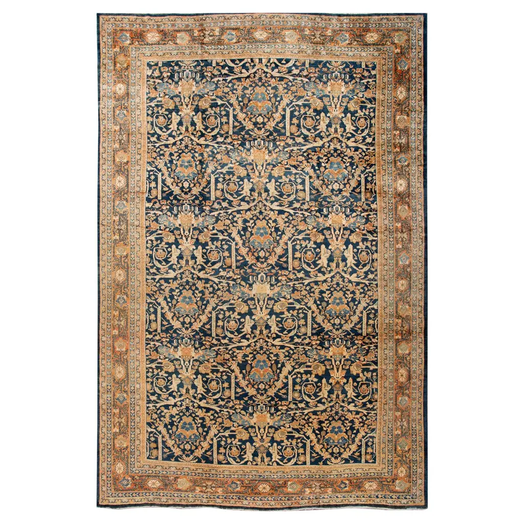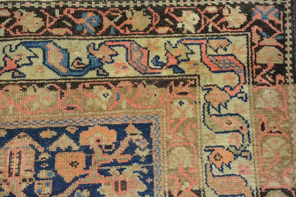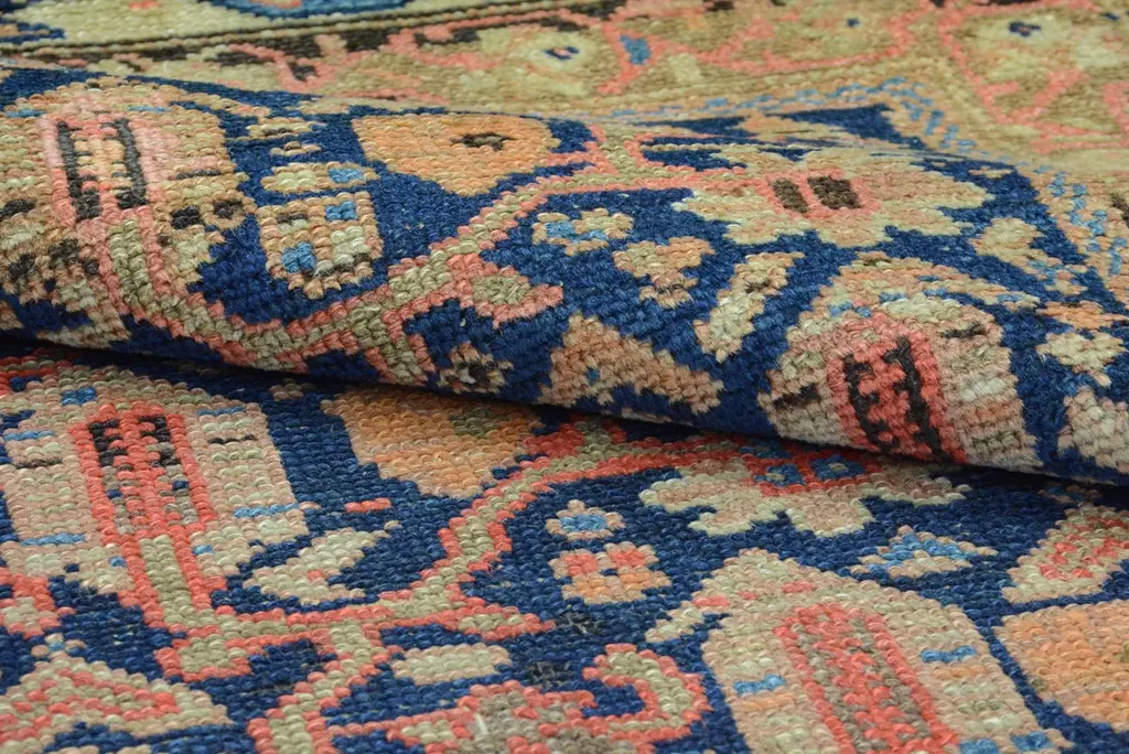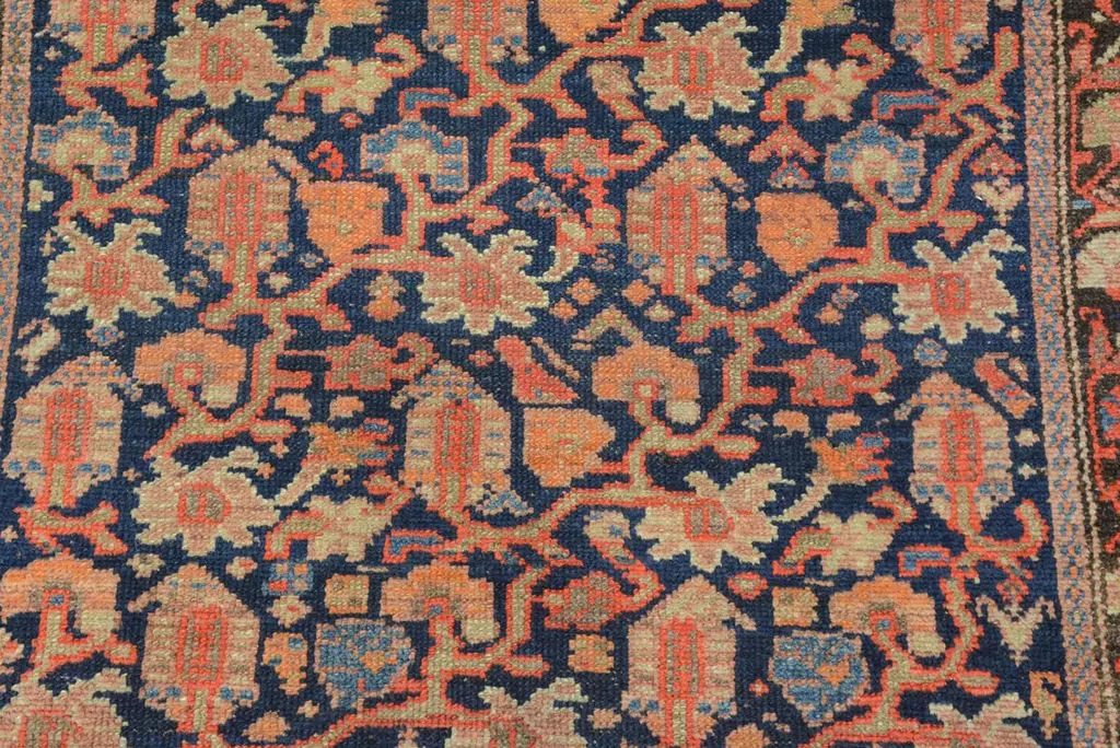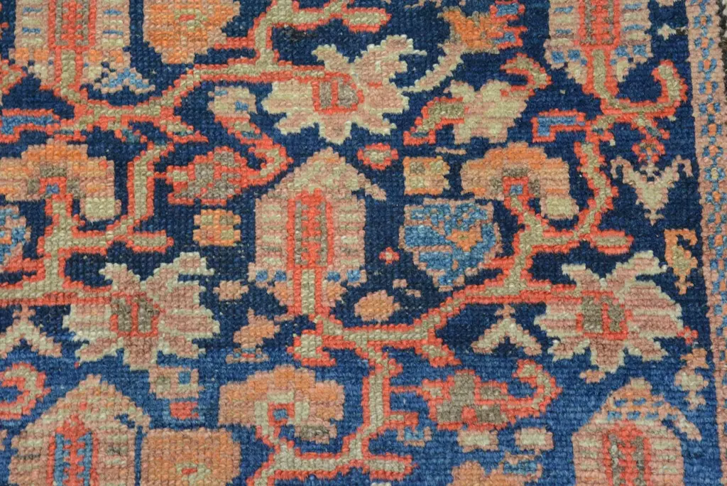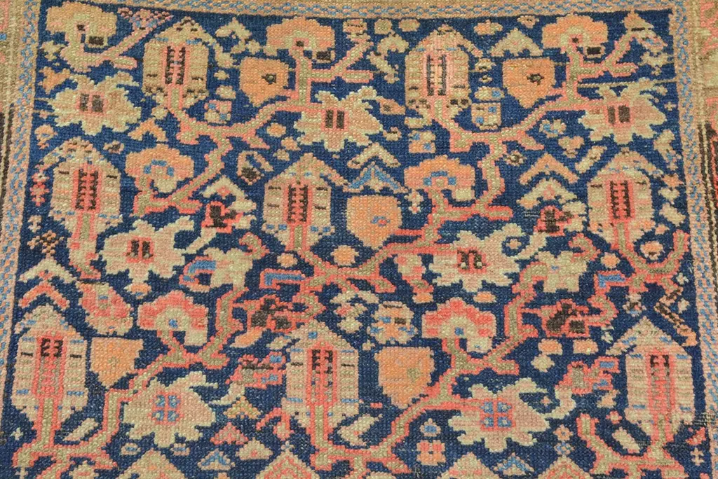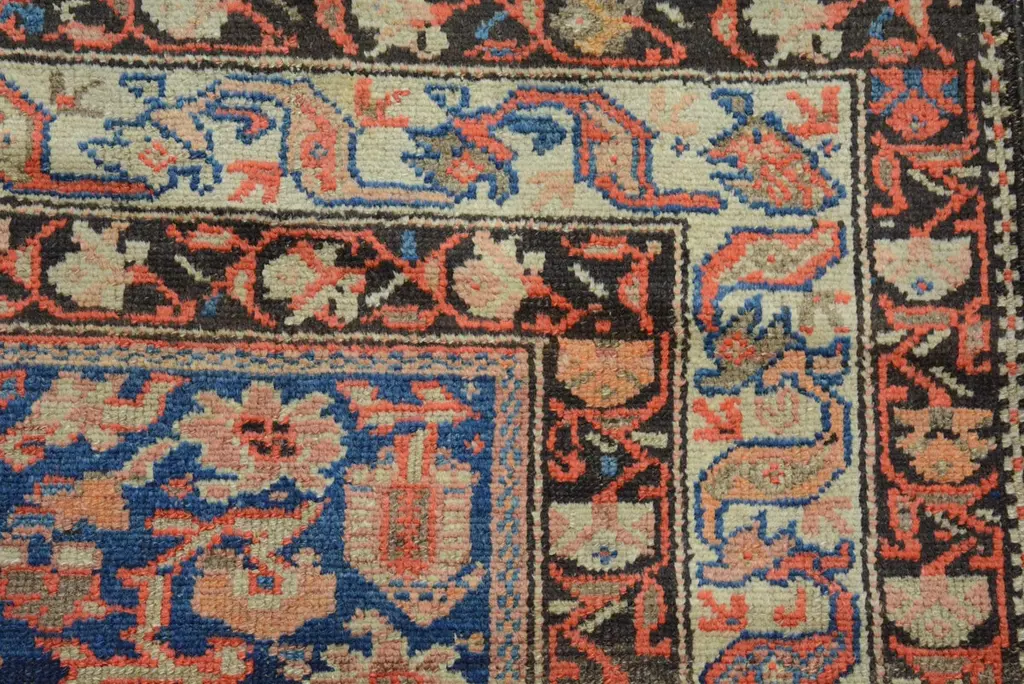 The geographical region of Northwest Persia with its’ cities and villages was at the forefront of the large-scale export of rugs and carpets in the late 19th century. The merchants of Tabriz, a large city that is the capital of Persian Azerbaijan, are credited with the successful promotion of the carpet industry to the west. Hamadan is 6,000 feet above sea level and is a major production center and shipping market for primarily scatter rugs and runners. Many of the weavings from the roughly 600 small villages surrounding this commercial center are marketed and sold to the west from this city. These rugs utilize excellent quality wool and have a distinctive weave with a single-weft thread between each row of knots. The rug production in the actual town of Hamadan began in the early 20th century, but weaving from the surrounding villages, many of which are primarily inhabited by Kurds, has existed for centuries. This rug has an overall ascending boteh pattern amongst vinery on an indigo field within an ivory meandering vine border. 6' 5" x 4' 5" .