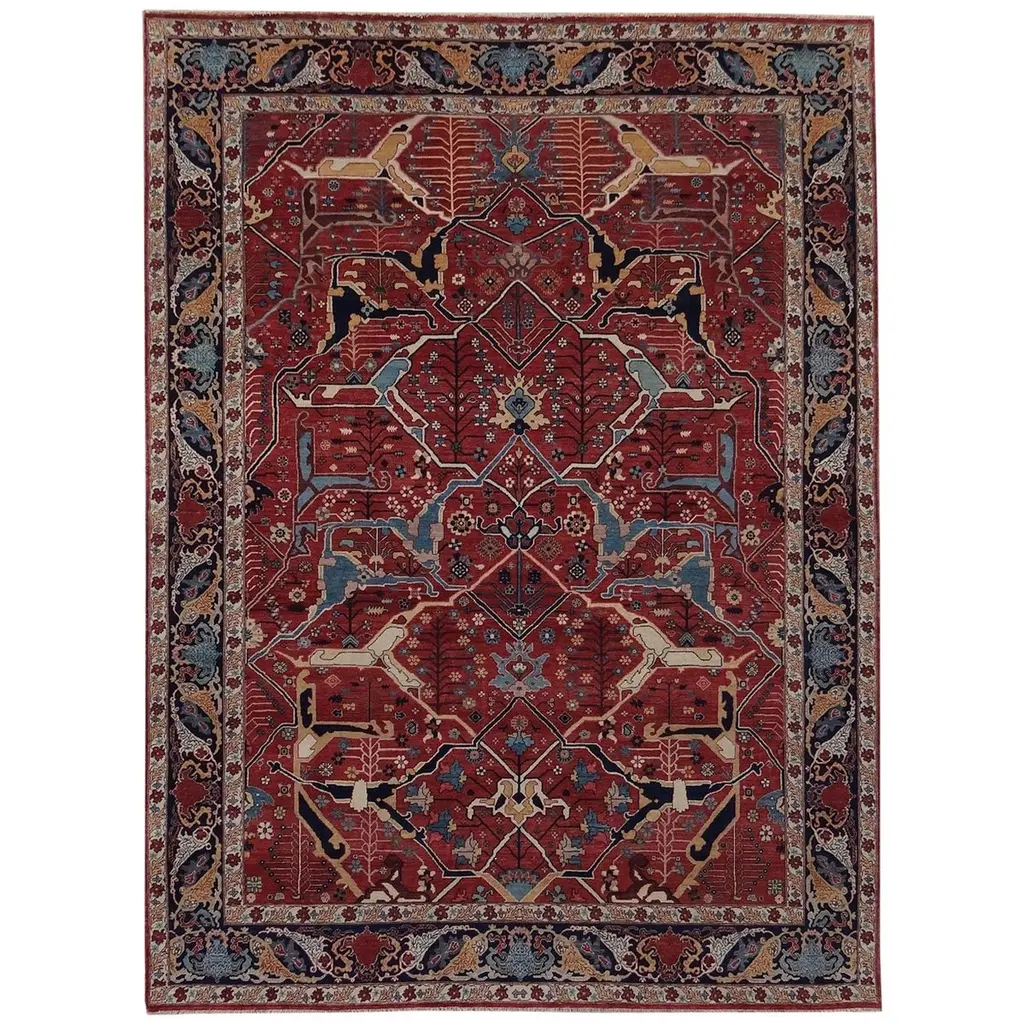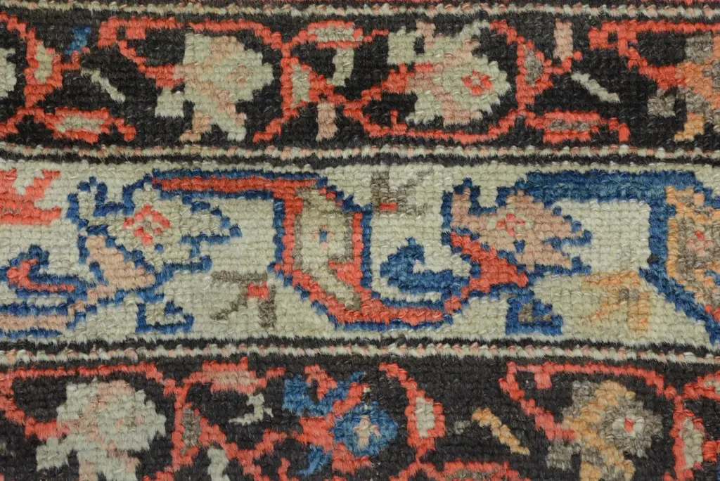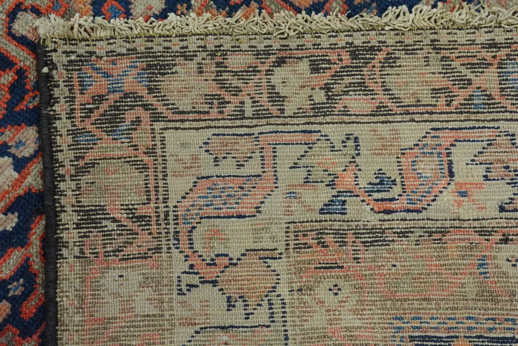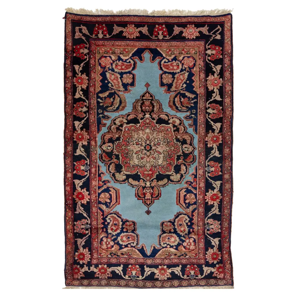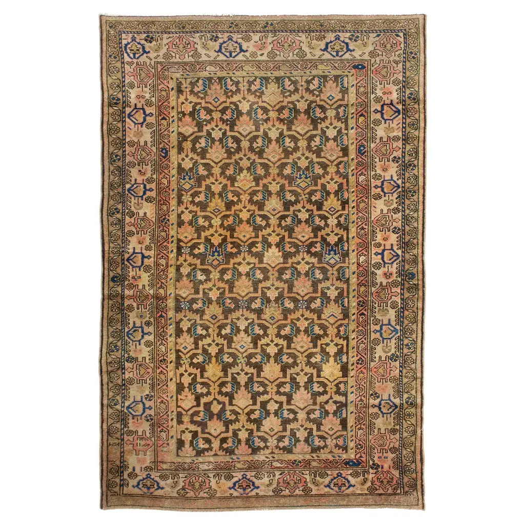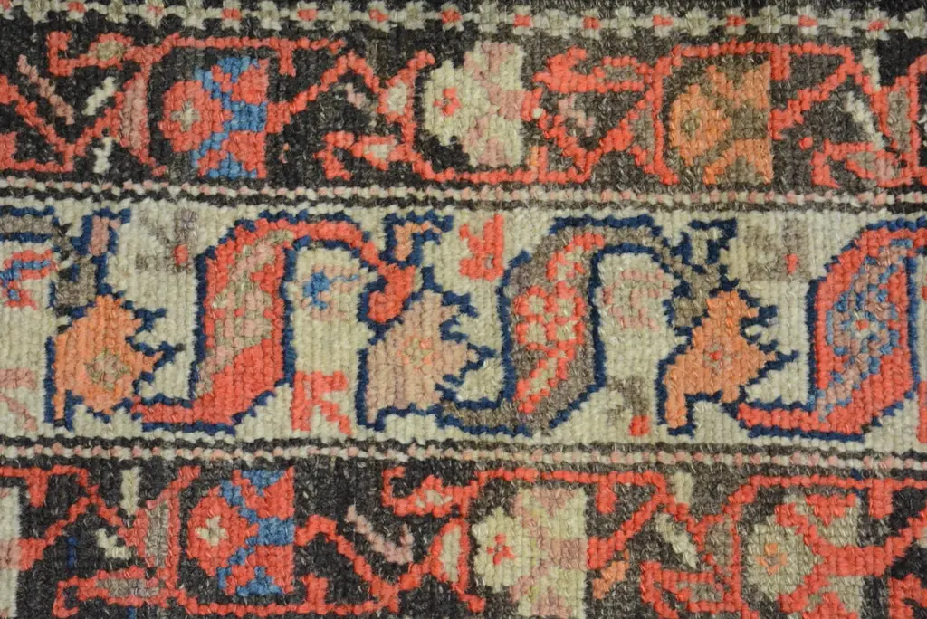 The geographical region of Northwest Persia with its’ cities and villages was at the forefront of the large-scale export of rugs and carpets in the late 19th century. The merchants of Tabriz, a large city that is the capital of Persian Azerbaijan, are credited with the successful promotion of the carpet industry to the west. Hamadan is 6,000 feet above sea level and is a major production center and shipping market for primarily scatter rugs and runners. Many of the weavings from the roughly 600 small villages surrounding this commercial center are marketed and sold to the west from this city. These rugs utilize excellent quality wool and have a distinctive weave with a single-weft thread between each row of knots. The rug production in the actual town of Hamadan began in the early 20th century, but weaving from the surrounding villages, many of which are primarily inhabited by Kurds, has existed for centuries. This rug has an overall ascending boteh pattern amongst vinery on an indigo field within an ivory meandering vine border. 6' 5" x 4' 5" .