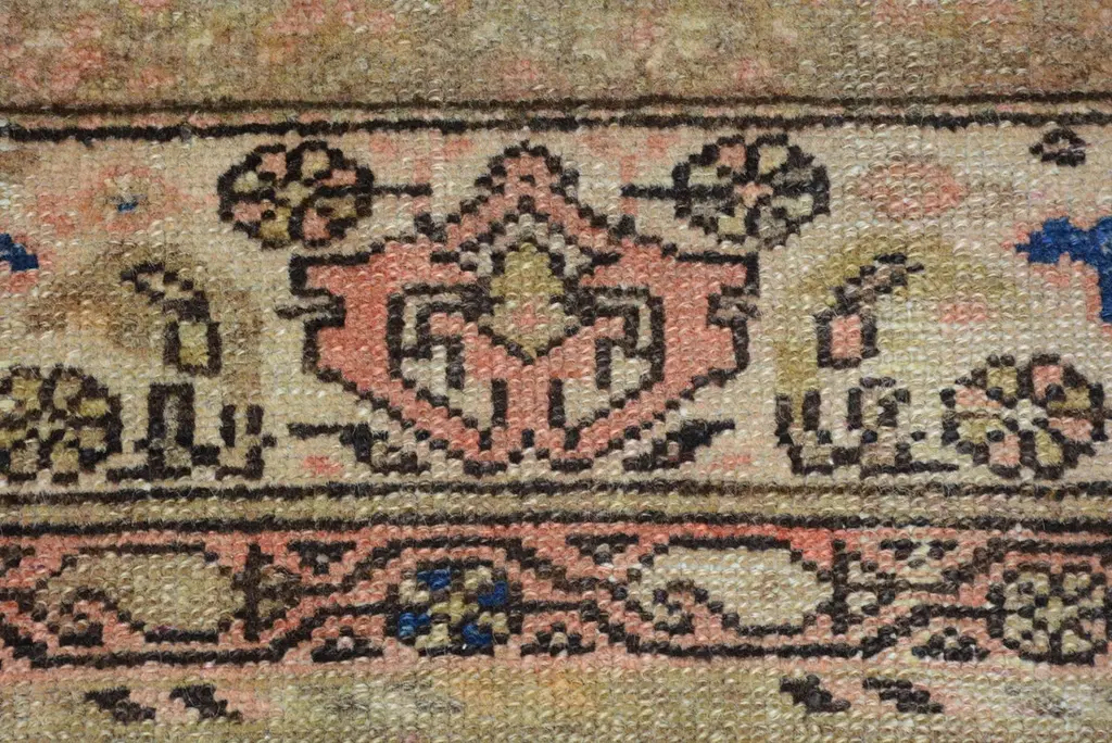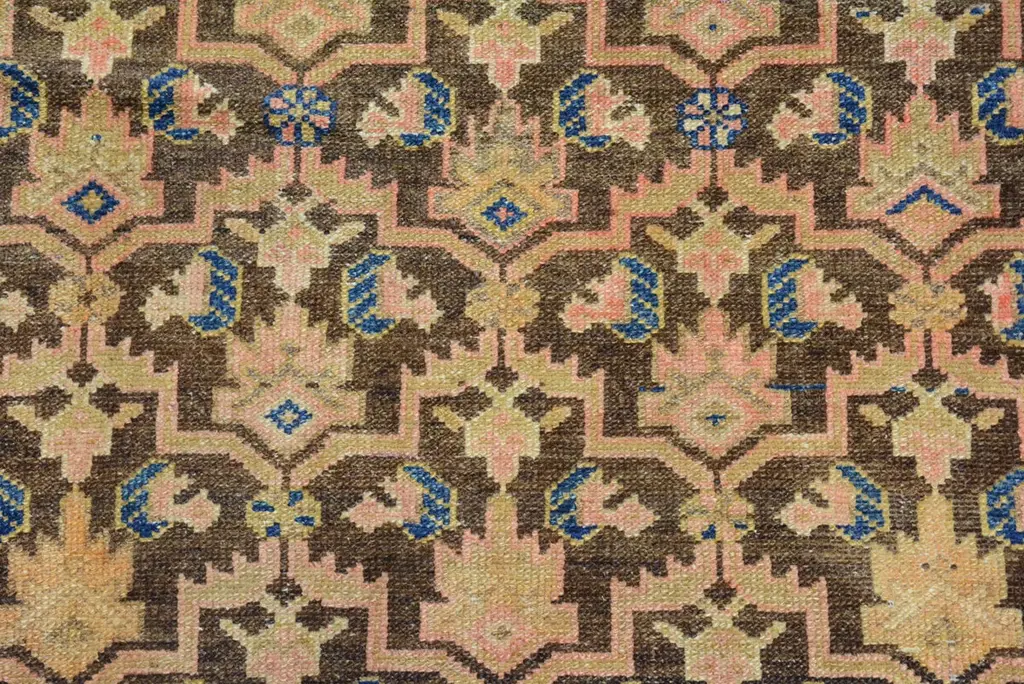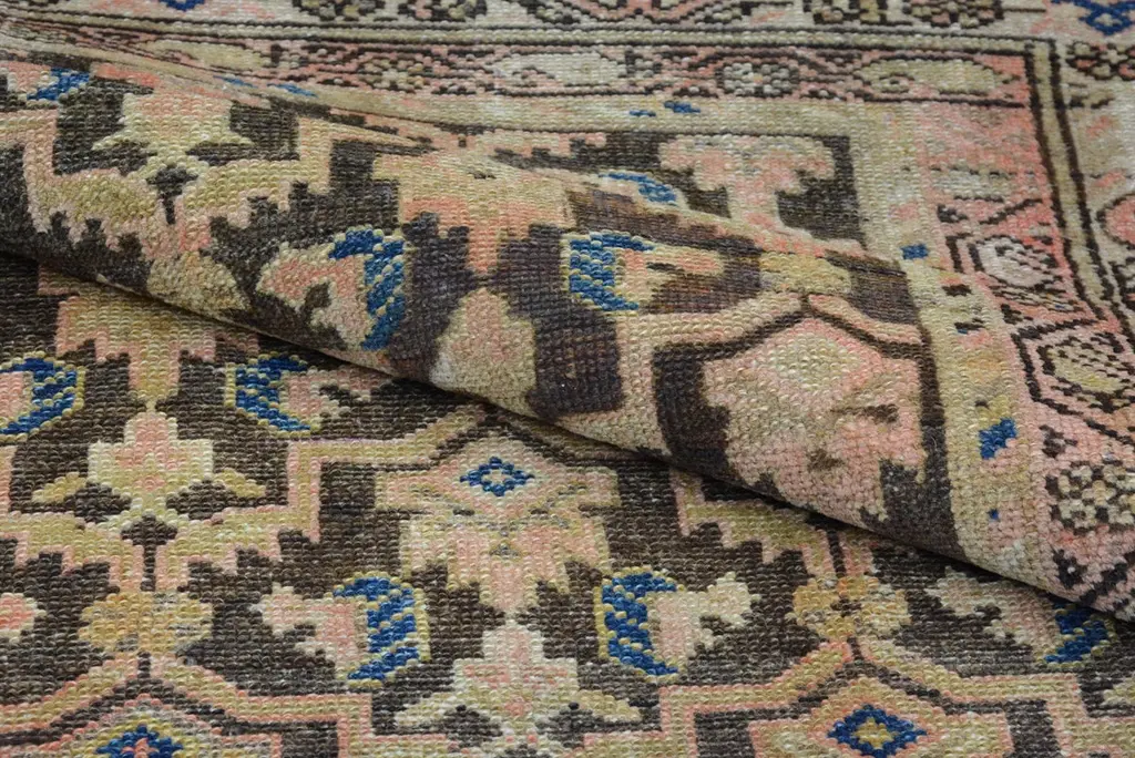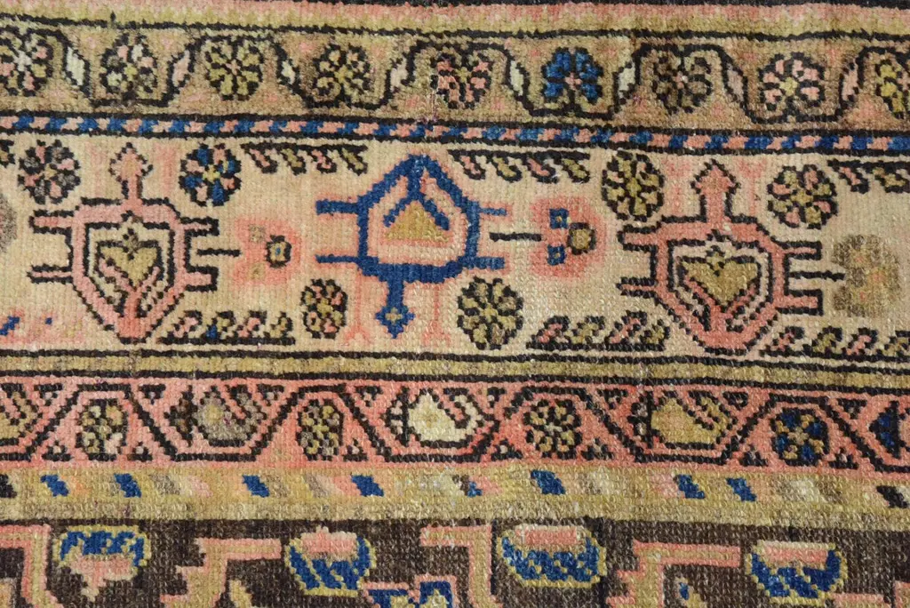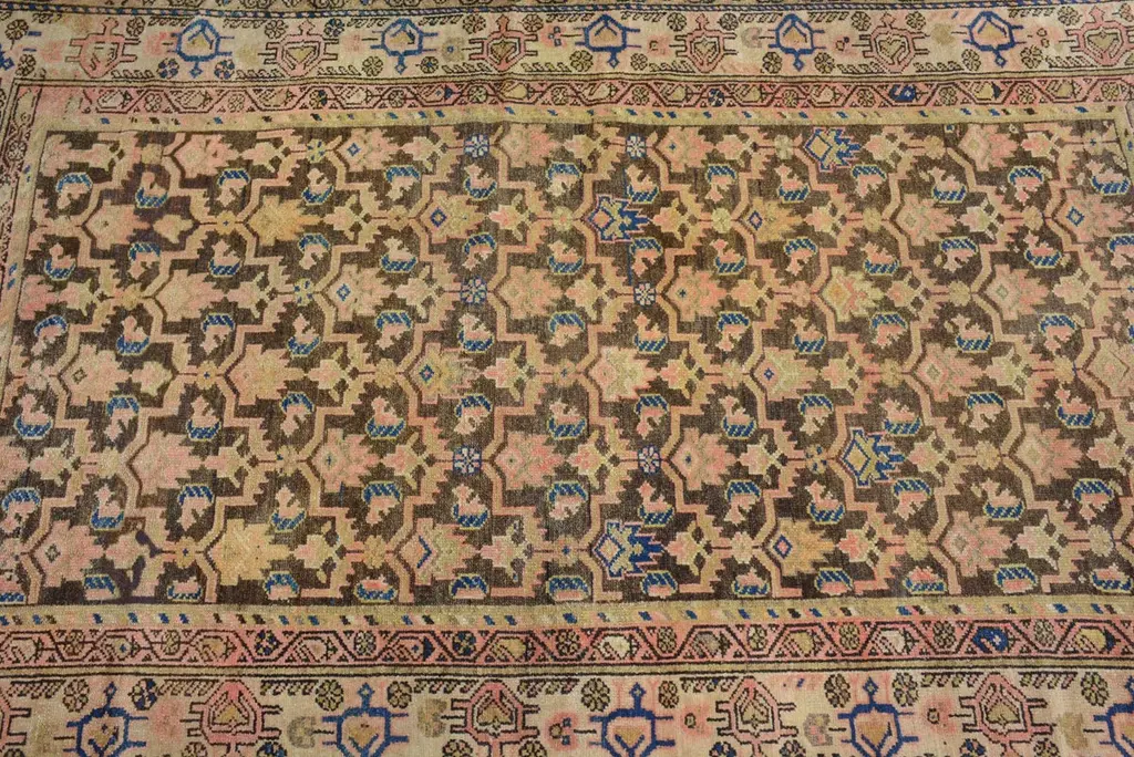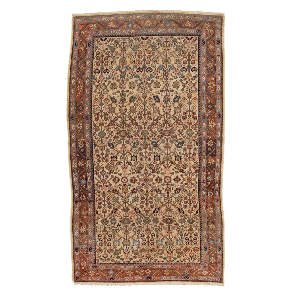The geographical region of Northwest Persia with its’ cities and villages was at the forefront of the large-scale export of rugs and carpets in the late 19th century. The merchants of Tabriz, a large city that is the capital of Persian Azerbaijan, are credited with the successful promotion of the carpet industry to the west. Hamadan is 6,000 feet above sea level and is a major production center and shipping market for primarily scatter rugs and runners. Many of the weavings from the roughly 600 small villages surrounding this commercial center are marketed and sold to the west from this city. These rugs utilize excellent quality wool and have a distinctive weave with a single-weft thread between each row of knots. The rug production in the actual town of Hamadan began in the early 20th century, but weaving from the surrounding villages, many of which are primarily inhabited by Kurds, has existed for centuries. This rug has an overall ascending shrub pattern in a pleasing color palette within an ivory stylized palmette border. 6' 4" x 4' 1" .
