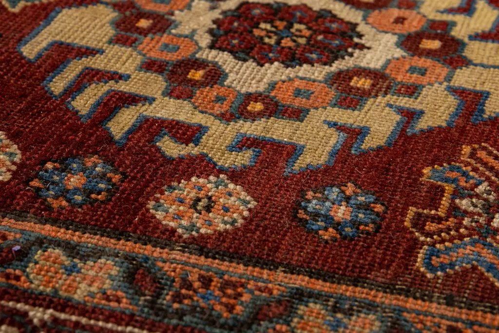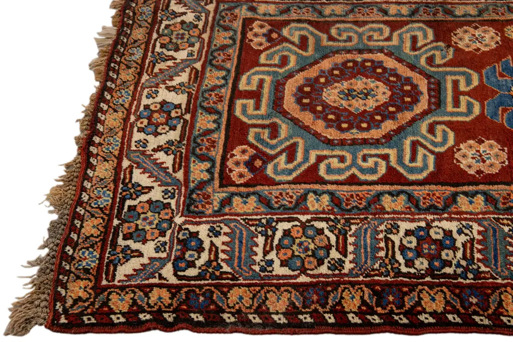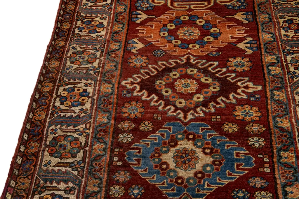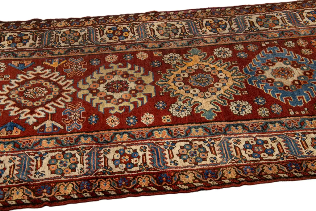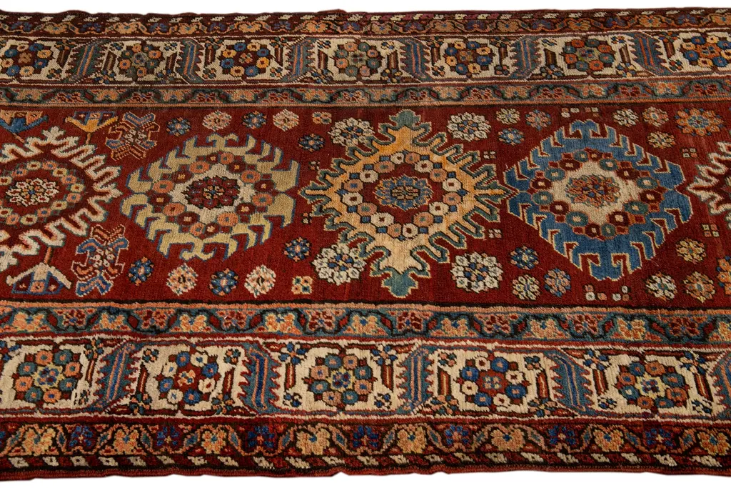 Beautiful antique Serapi hand-knotted wool rug with a red field. This Persian rug has a beige frame and multicolor accents in a gorgeous all-over geometric multi medallion floral motif.This rug measures: 3'4" x 11'6". Our Rugs are professionally cleaned before shipping.