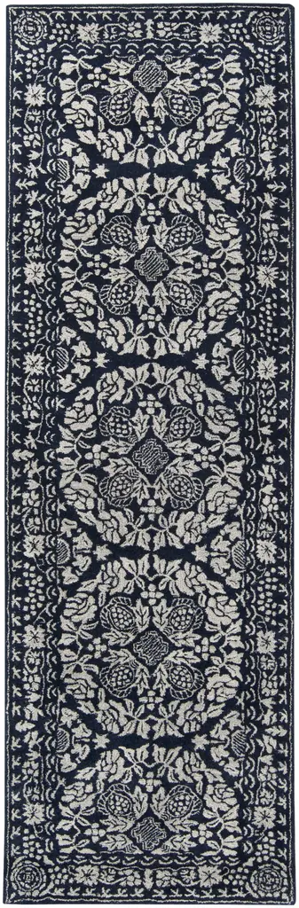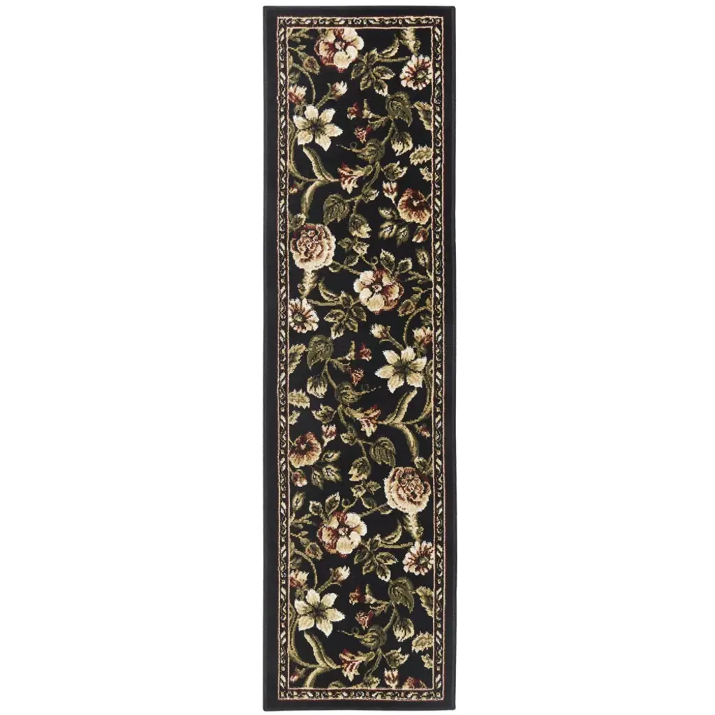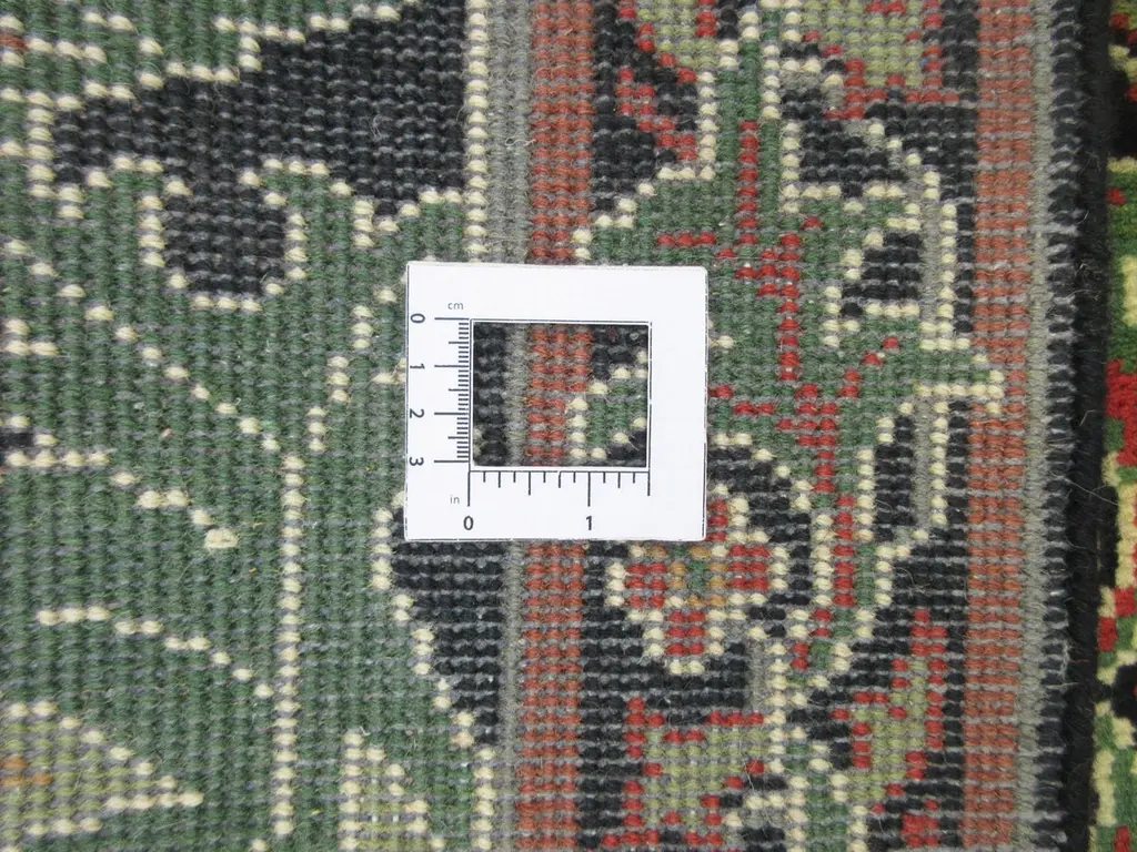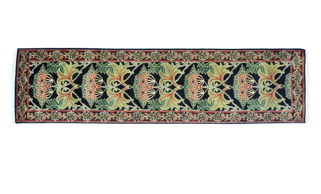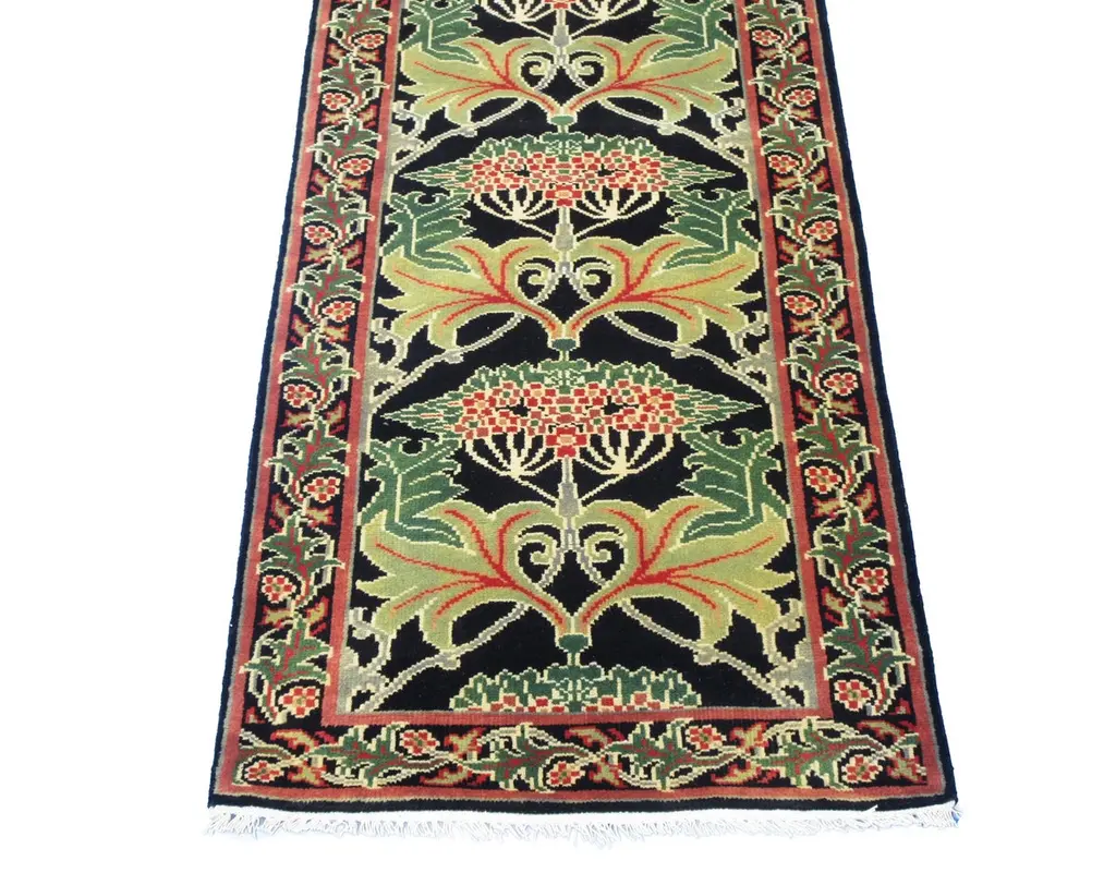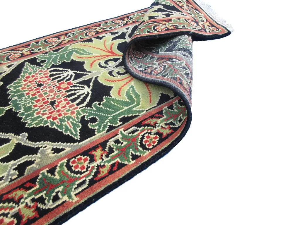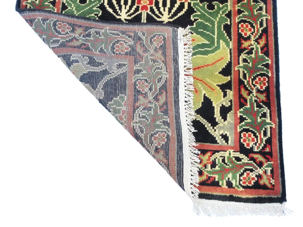 Hand-knotted, wool pile on a cotton foundation.Field Color: BlackBorder Color: BlackAccent Colors: Green, Red-Orange.
