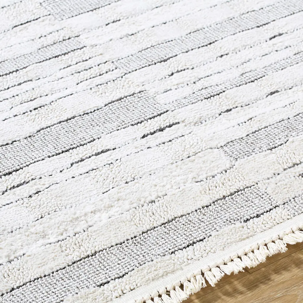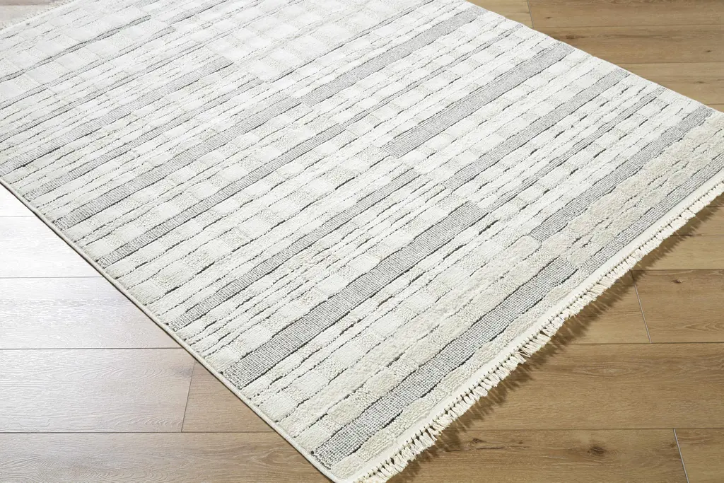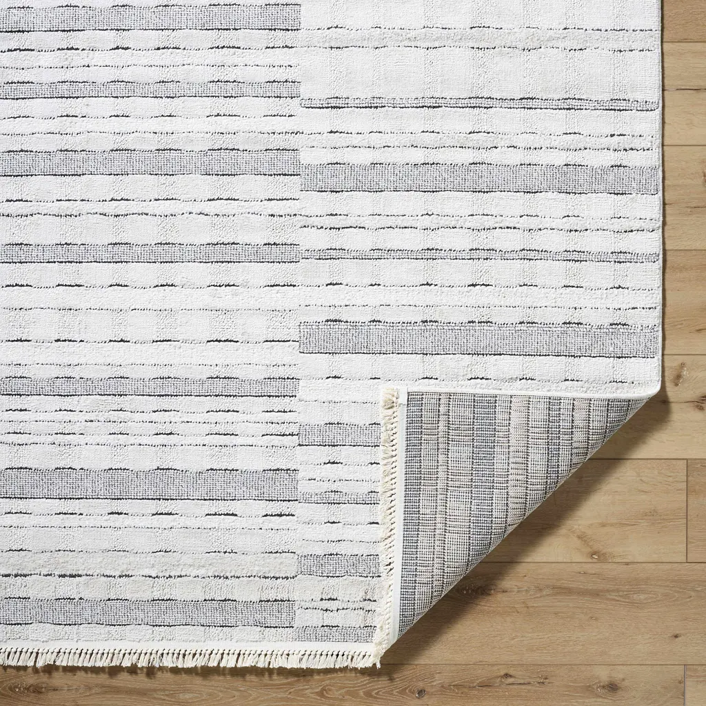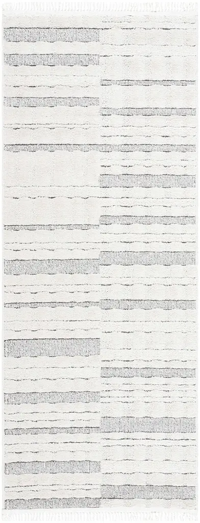 Collection: Astrid Colors: Ivory, Black Construction: Machine Woven Material: Face: 70% Polypropylene, 30% Polyester / Warp: 100% Polyester Pile: Medium Pile Pile Height: 0.31" Styles: Contemporary Made In: Turkey Thickness: 0.39" Fringe Length: 1.18" Price Range: $$$$$ (Affordable)