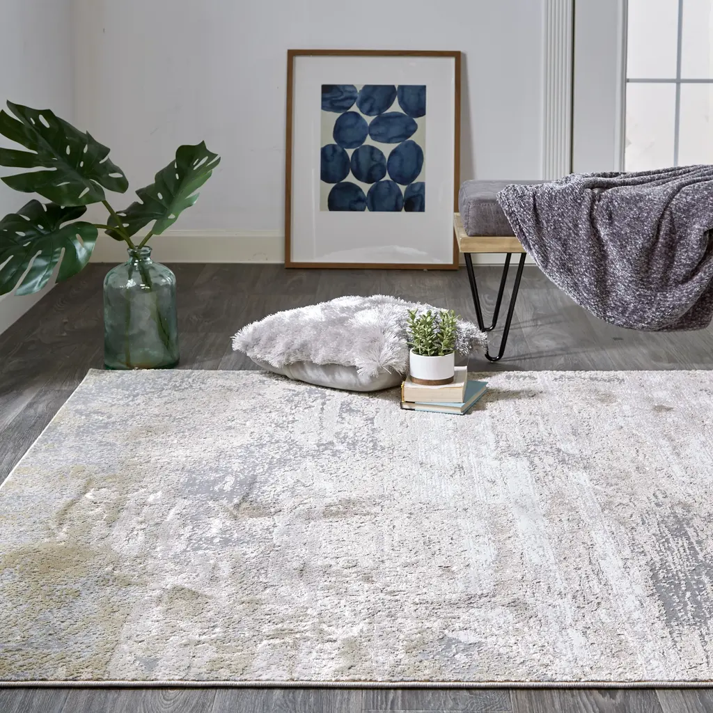 Collection: Aura Colors: Ivory, Gold, Gray Construction: Machine Made Material: Face: Polyester, Polypropylene / Warp: Jute Pile: Low Pile Pile Height: 0.39" Styles: Contemporary,Casual,Industrial Backing: Jute Made In: Turkey Thickness: 0.39" Price Range: $$$$$ (Affordable)