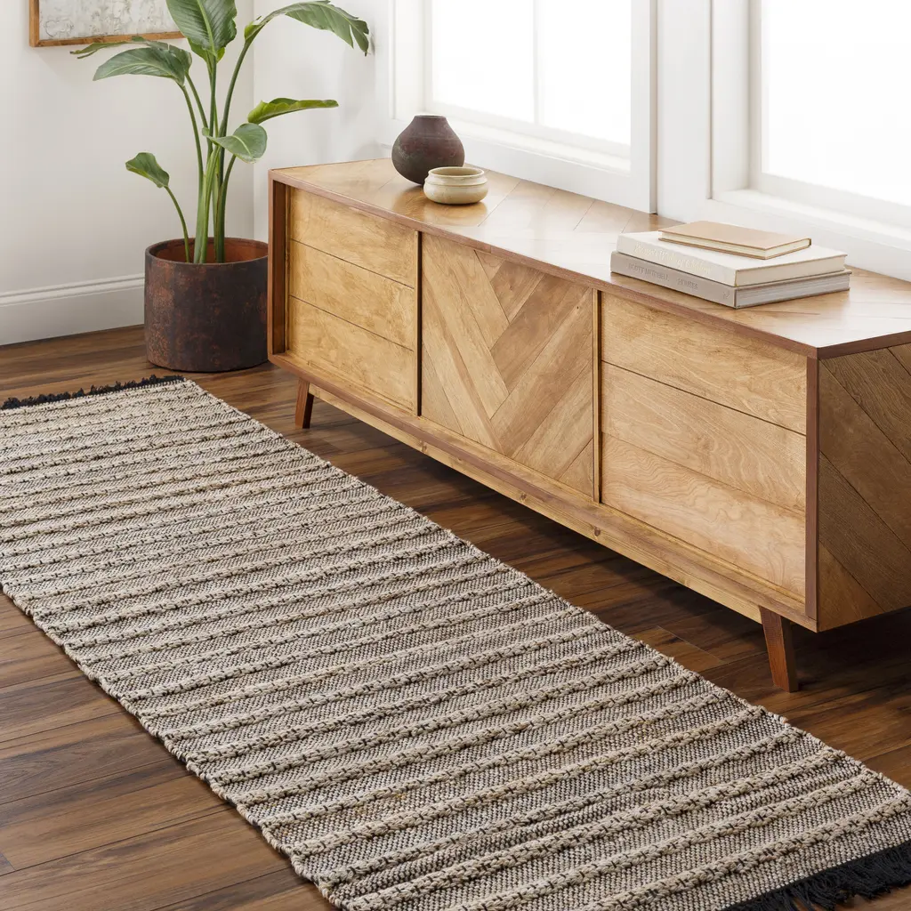 The simplistic yet compelling rugs from the Azalea Collection effortlessly serve as the exemplar representation of modern decor. The meticulously woven construction of these pieces boasts durability and will provide natural charm into your decor space. Made with Recycled PET Yarn in India, and has No Pile. Spot Clean Only, One Year Limited Warranty.