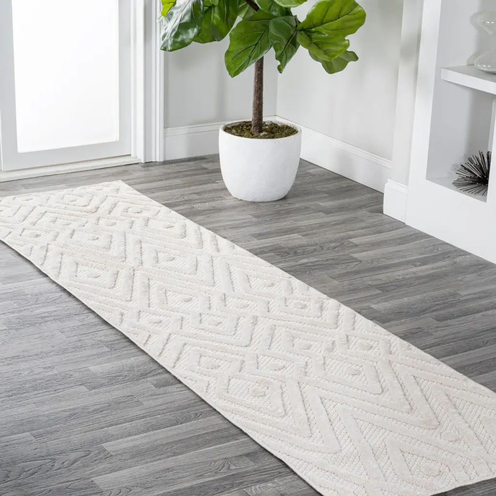 Inspired by vintage Moroccan rugs, our indoor/outdoor rug adds modern tribal style to your porch, patio or sunroom. The classic Moroccan pattern has a geometric design of ivory diamonds, dots and zigzags. Mingled threads give this rug a handwoven, vintage vibe that''s perfect for an entry, kitchen, hallway, living room or bedroom too. The pet-friendly and kid-proof flatweave design makes it easy to clean, and perfect for the beach house.Features:• Power loomed in a low pile that''s soft and durable, with a latex backing for added stability• Woven in shades of ivory with mingled beige threads for a handmade effect• Made from easy-care polypropylene - just sweep, vacuum or hose down with mild soap and water• 100% Polypropylene• No backing, use of rug pad is recommended (sold separately)• Power Loomed in Turkey• Actual Dimension: 2 ft. 2 in. x 8 ft.• Color: Ivory• Thickness measures: 0.43 in.• Available in multiple sizes and/or colorsRug Care:• Vacuum regularly and spot clean as needed; avoid direct and continuous exposure to sunlight; use brushless vacuum; remove spills immediately; if liquid, blot with clean, undyed cloth by pressing firmly around the spill to absorb as much as possible; for hard to remove stains, professional rug cleaning is recommended; store in a dry, well ventilated area and rotate for consistent wear• Packing and shipping may cause temporary creases in rugs, which will flatten out after a week on the floor; to expedite the process, try back-rolling your rug before laying it down, and then allow ample time for the remaining creases to relax• Please Note: Due to differences in monitors, some rug colors may vary slightly. Lengths and widths may vary from the published dimensions. Patterns may vary slightly according to shape and size selected.About us:Style your floors with JONATHAN Y. By combining fine craftsmanship and design, this New York creative studio is bringing fashion to your floors. The collection mixes sustainable organic materials, vibrant colors and trend worthy styles to create JONATHAN Y''s distinctive catalog of rugs.