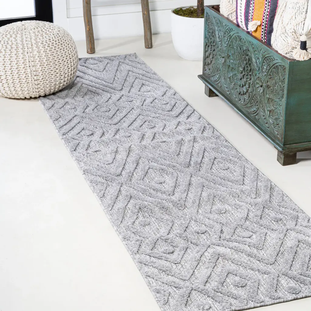Inspired by vintage Moroccan rugs, our indoor/outdoor rug adds modern tribal style to your porch, patio or sunroom. The classic Moroccan pattern has a geometric design of gray diamonds, dots and zigzags. Mingled threads give this rug a handwoven, vintage vibe that''s perfect for an entry, kitchen, hallway, living room or bedroom too. The pet-friendly and kid-proof flatweave design makes it easy to clean, and perfect for the beach house.Features:• Power loomed in a low pile that''s soft and durable, with a latex backing for added stability• Woven in shades of gray with mingled threads for a handmade effect• Made from easy-care polypropylene - just sweep, vacuum or hose down with mild soap and water• 100% Polypropylene• No backing, use of rug pad is recommended (sold separately)• Power Loomed in Turkey• Actual Dimension: 2 ft. 2 in. x 8 ft.• Color: Light Gray• Thickness measures: 0.43 in.• Available in multiple sizes and/or colorsRug Care:• Vacuum regularly and spot clean as needed; avoid direct and continuous exposure to sunlight; use brushless vacuum; remove spills immediately; if liquid, blot with clean, undyed cloth by pressing firmly around the spill to absorb as much as possible; for hard to remove stains, professional rug cleaning is recommended; store in a dry, well ventilated area and rotate for consistent wear• Packing and shipping may cause temporary creases in rugs, which will flatten out after a week on the floor; to expedite the process, try back-rolling your rug before laying it down, and then allow ample time for the remaining creases to relax• Please Note: Due to differences in monitors, some rug colors may vary slightly. Lengths and widths may vary from the published dimensions. Patterns may vary slightly according to shape and size selected.