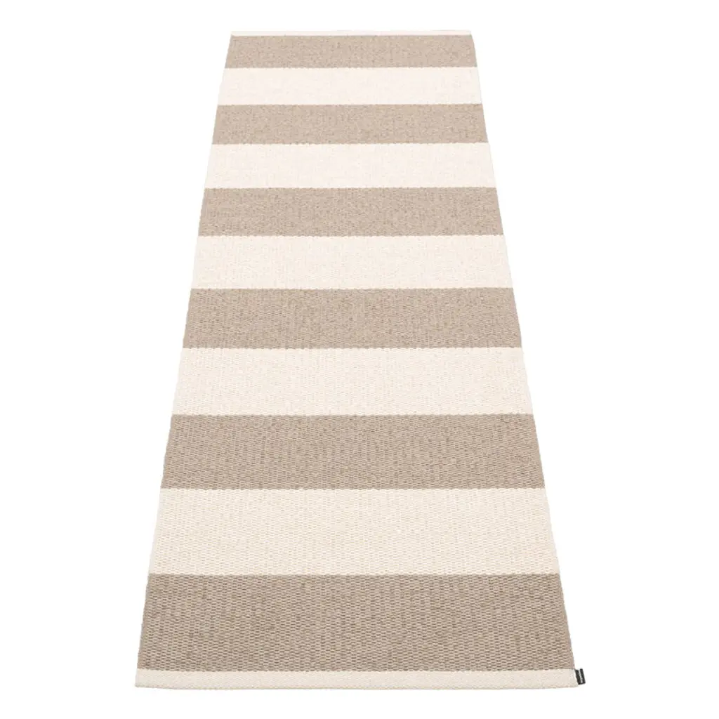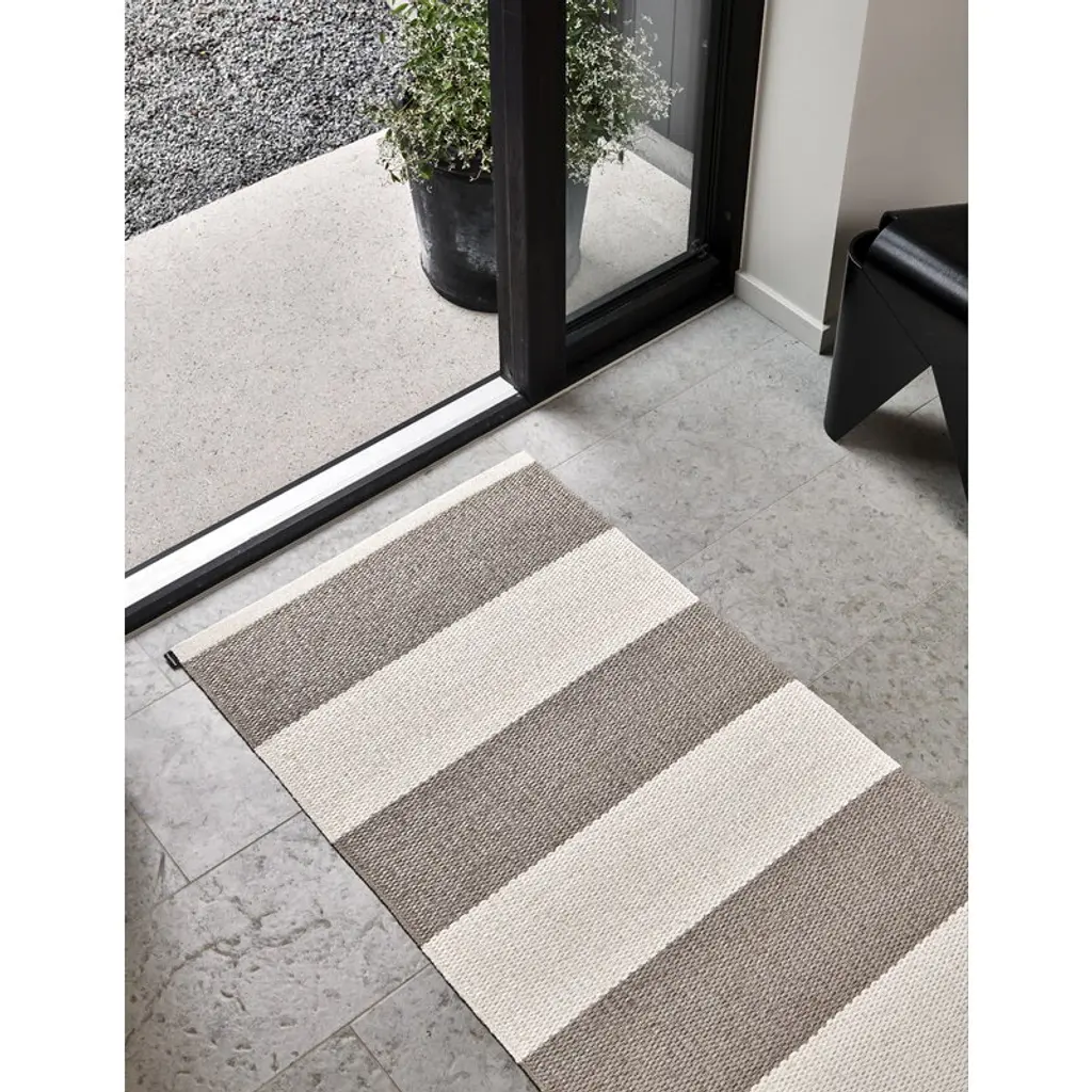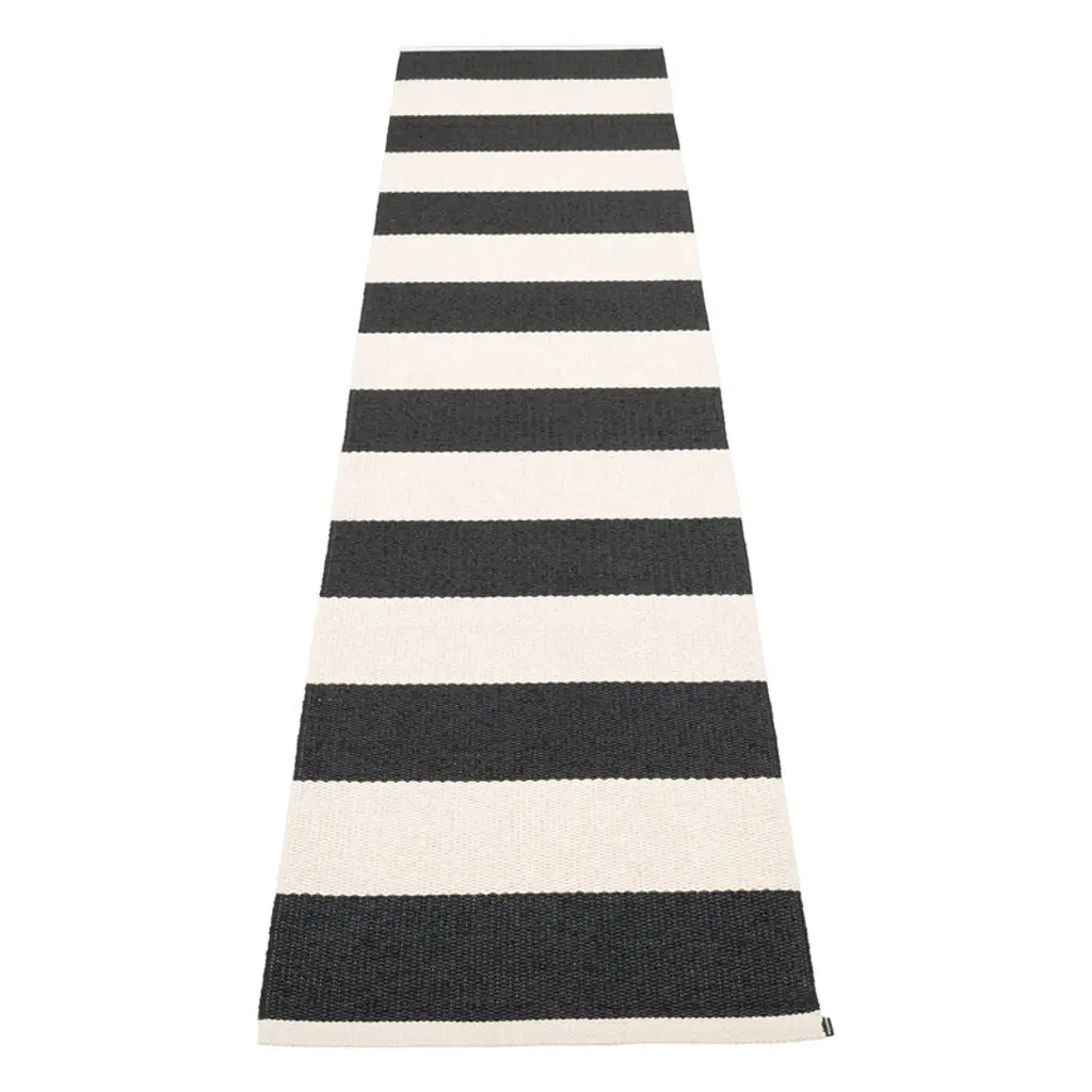 The Bob plastic rugs from Pappelina are woven on a traditional loom in Dalarna, Sweden. Made of phthalate-free PVC ribbon, the rugs are durable and easy to care for, and their striped pattern gives character to any space. Due to its narrow form, the rug can easily be put to use as a stunning hallway runner, kitchen area rug or outdoor rug. The Bob rugs come with an embossed logo at both ends. In 2024, BOB was refreshed with new colors and our luxurious hemmed edge was added.