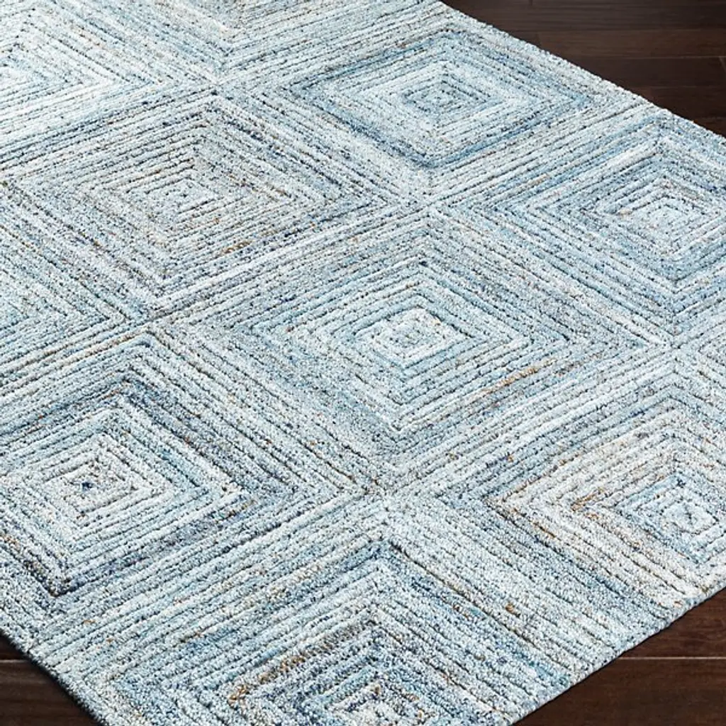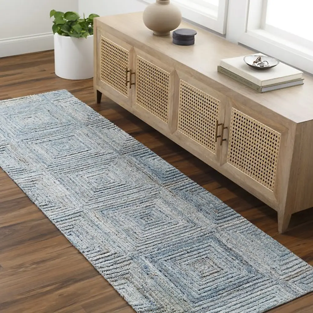 The Calgary CGR 2301 Runner is presented by Surya. This exquisite runner is hand tufted in India, showcasing the skillful craftsmanship of artisans. Composed of 100% recycled PET yarn, it embraces eco-consciousness while providing a luxurious texture underfoot. The design features a series of squares adorned with a mesmerizing pattern, creating a visual dance along the surface.