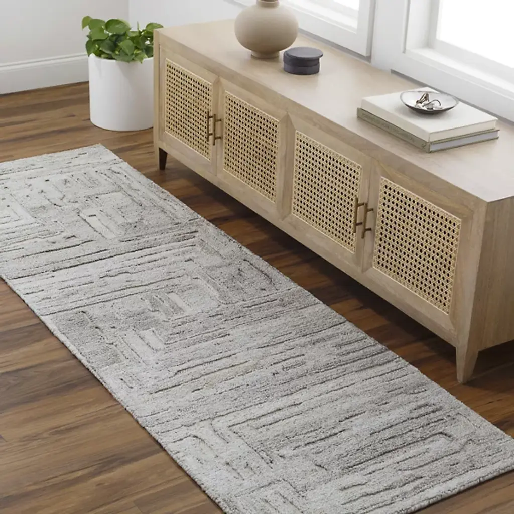 The Calgary CGR 2302 Runner from Surya is hand tufted in India, showcasing the artistry and expertise of skilled craftsmen. Composed of 100% recycled PET yarn, it not only offers a soft and luxurious feel but also promotes eco-consciousness via sustainable materials. The design features an array of organically inspired lines that gracefully intertwine, forming a gentle geometric pattern.