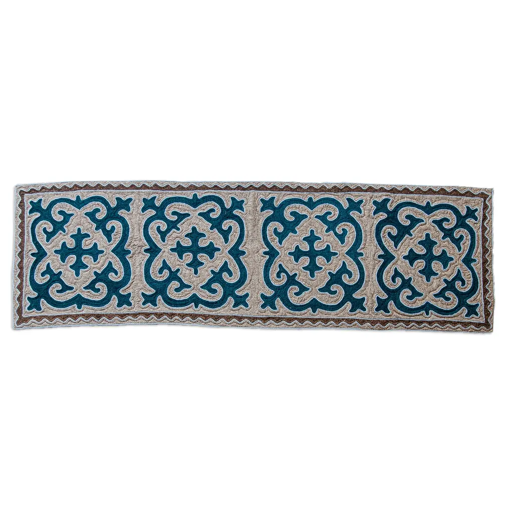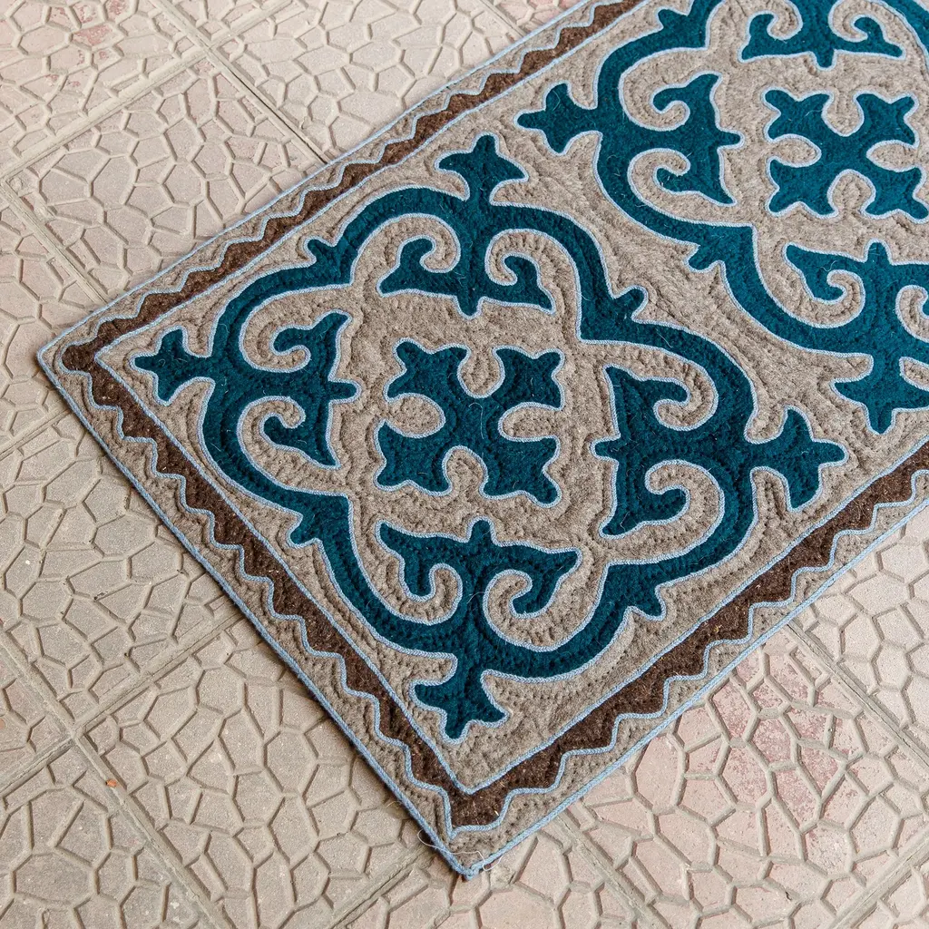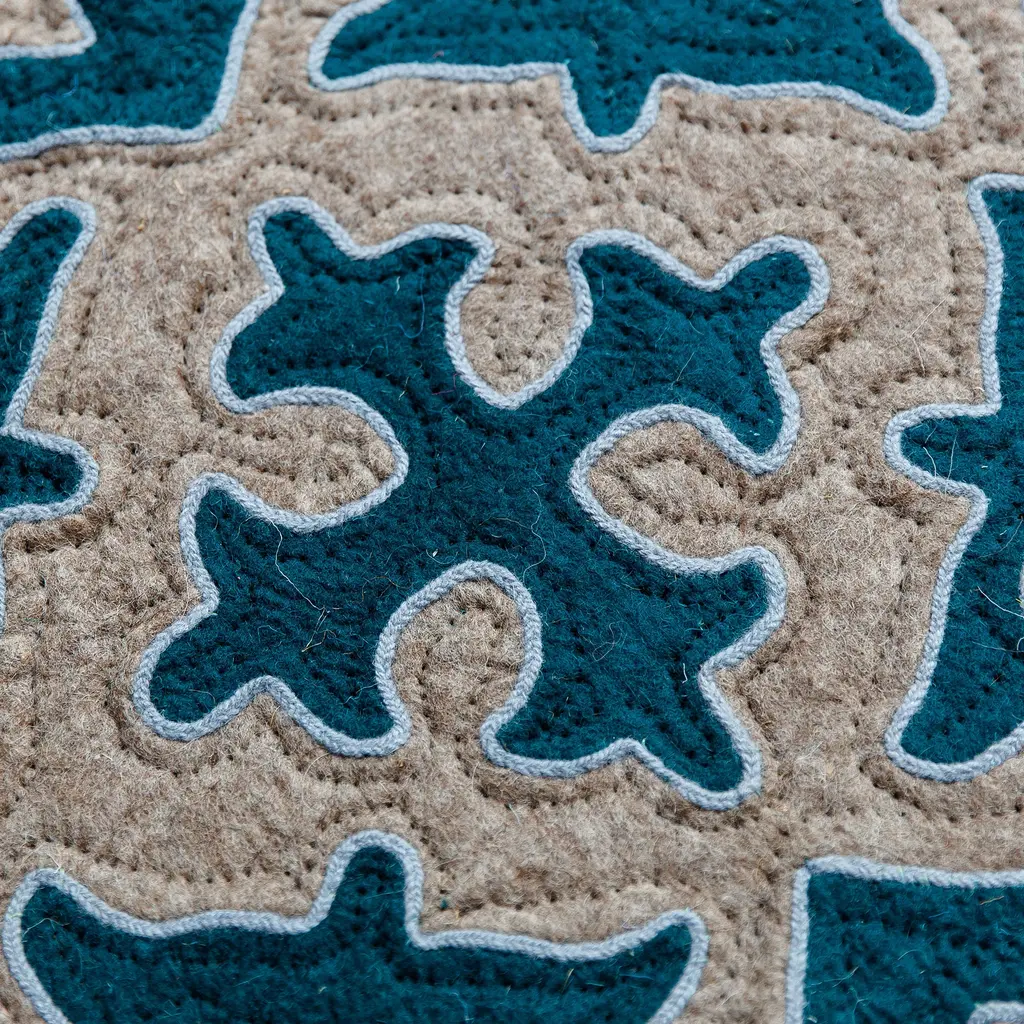 Traditional motifs from the Silk Road are arranged in an exquisite creation that explores Kyrgyzstan's splendid arts. Master artisan Burul Zhakypova works with wool yarns to create this rug made in the traditional shyrdak style, which combines applique and quilting techniques in one design. The palette, featuring teal, brown and beige hues, also adds a magical touch to the piece, making it perfect for elegant home decor.