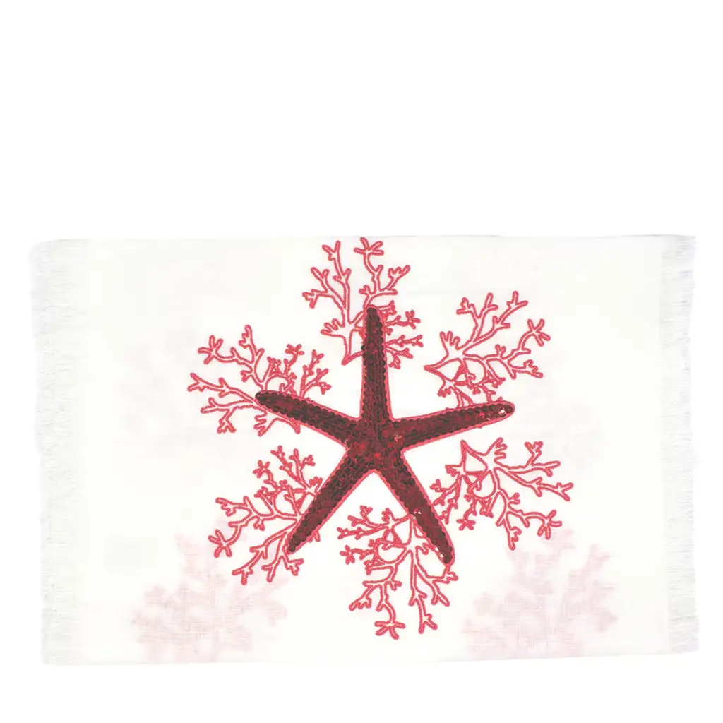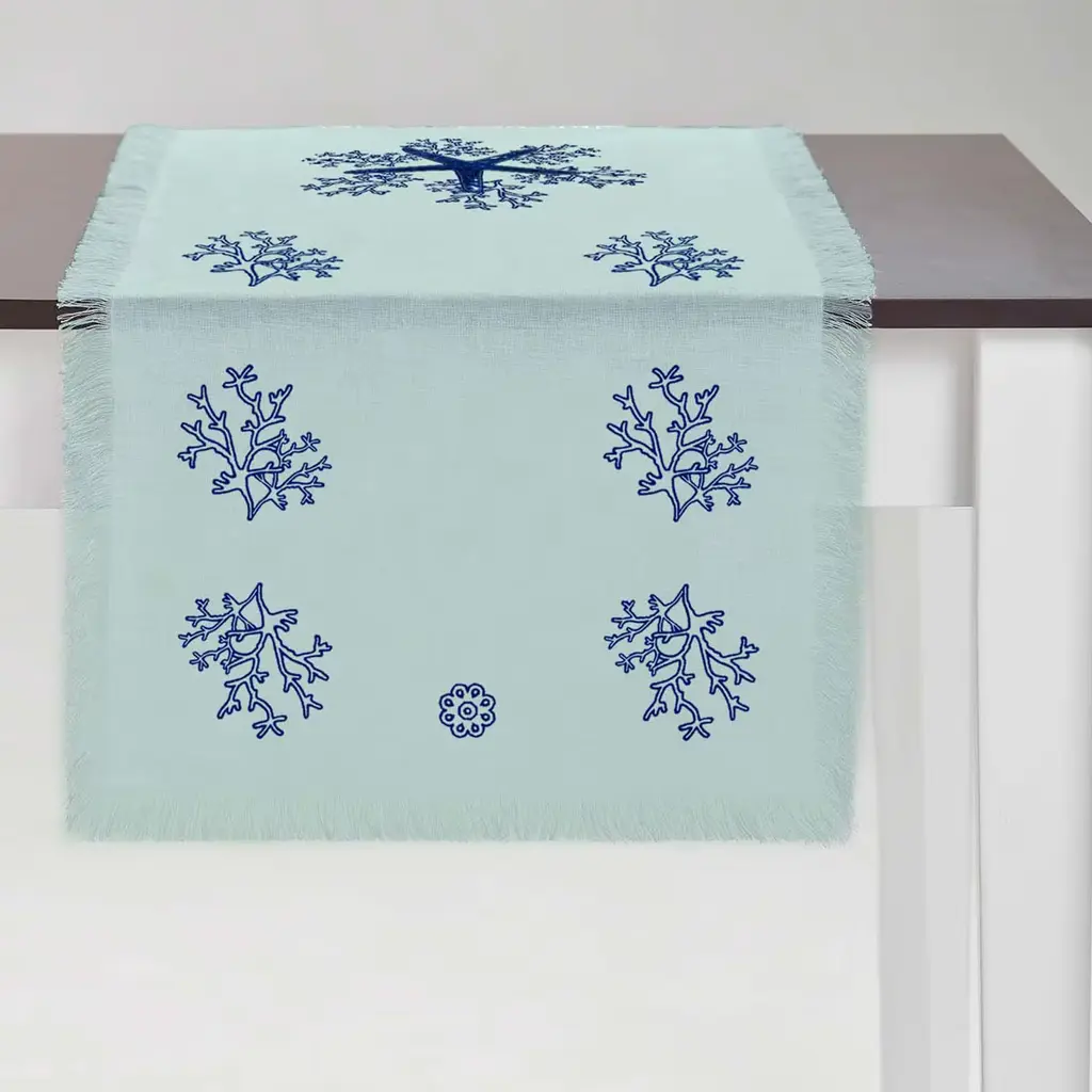 A vibrant and precious Masters of Linen turquoise weft decorated with minute blue Mako cotton embroideries of marine inspiration define the fresh and evocative design of this runner. Embellished with delicate applications of spangles and enlivened by fringed borders, it is a singular, hand-embroidered design also available in a variety of color variants.