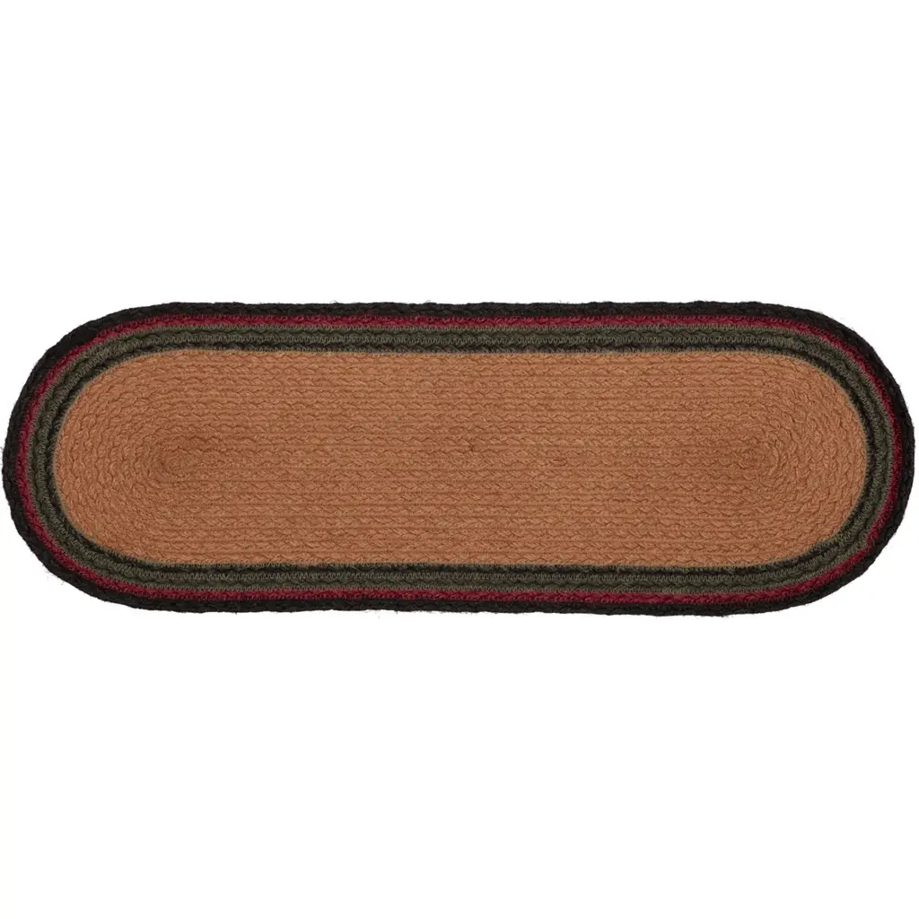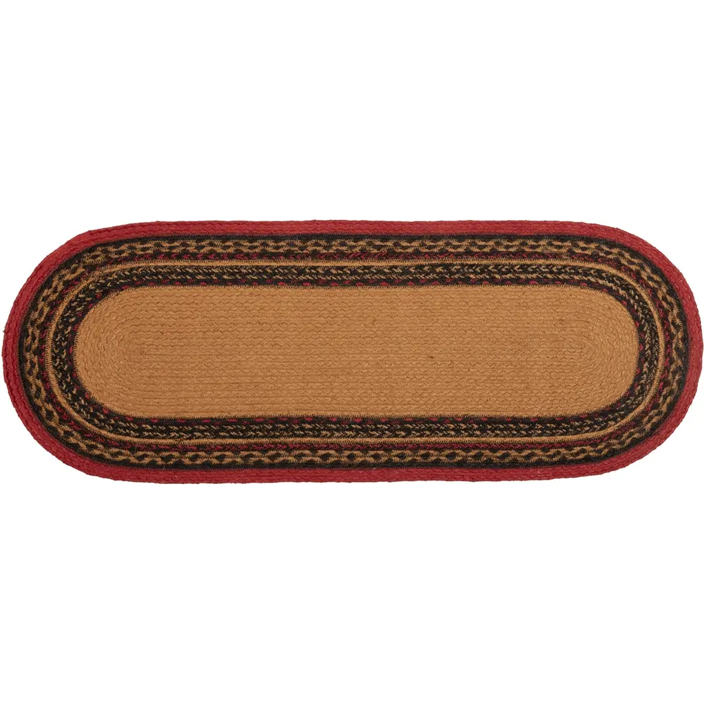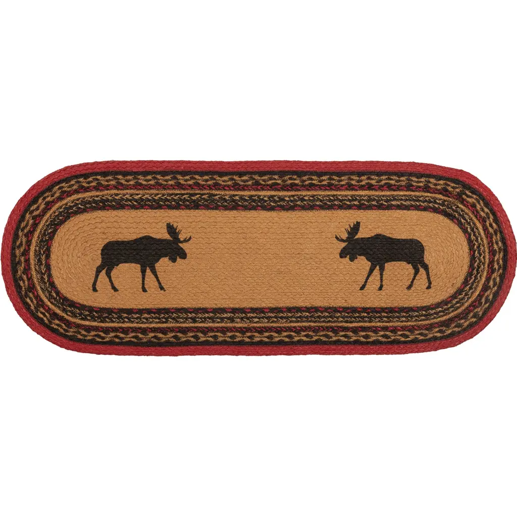 Bring log cabin charm into the home with the Cumberland Jute Runner Oval. Chili pepper reds, caviar blacks, and natural tans make this runner a woodcutter's dream. The Cumberland Jute Runner Oval proudly displays majestic moose stencils.Features PREMIUM CONSTRUCTION: with over two decades experience crafting goods for American homes, our items are built to last for years to come.RUSTIC DECOR: cabin style to fit any lodge, cabin, lake house, or retreat.QUALITY MATERIAL: made with durable 100% jute for a proper look and feel.Concentric braids of almond, cherry red, and black juteBlack moose stencil on each end facing each otherBraided: Machine braided, Machine stitchedSpecifications Material: 100% JuteColors: Almond, Cherry Red, RavenManufacturer Country: IndiaCare: Spot CleanSizes Available 8" x 24" - 0.4 lb13" x 36" - 1 lb13" x 48" - 1.3 lb* To prevent colors from bleeding do not use chemicals or wet clean this item. A rug pad is recommended to keep your surfaces safe from color bleeding and abrasiveness of the jute fibers.