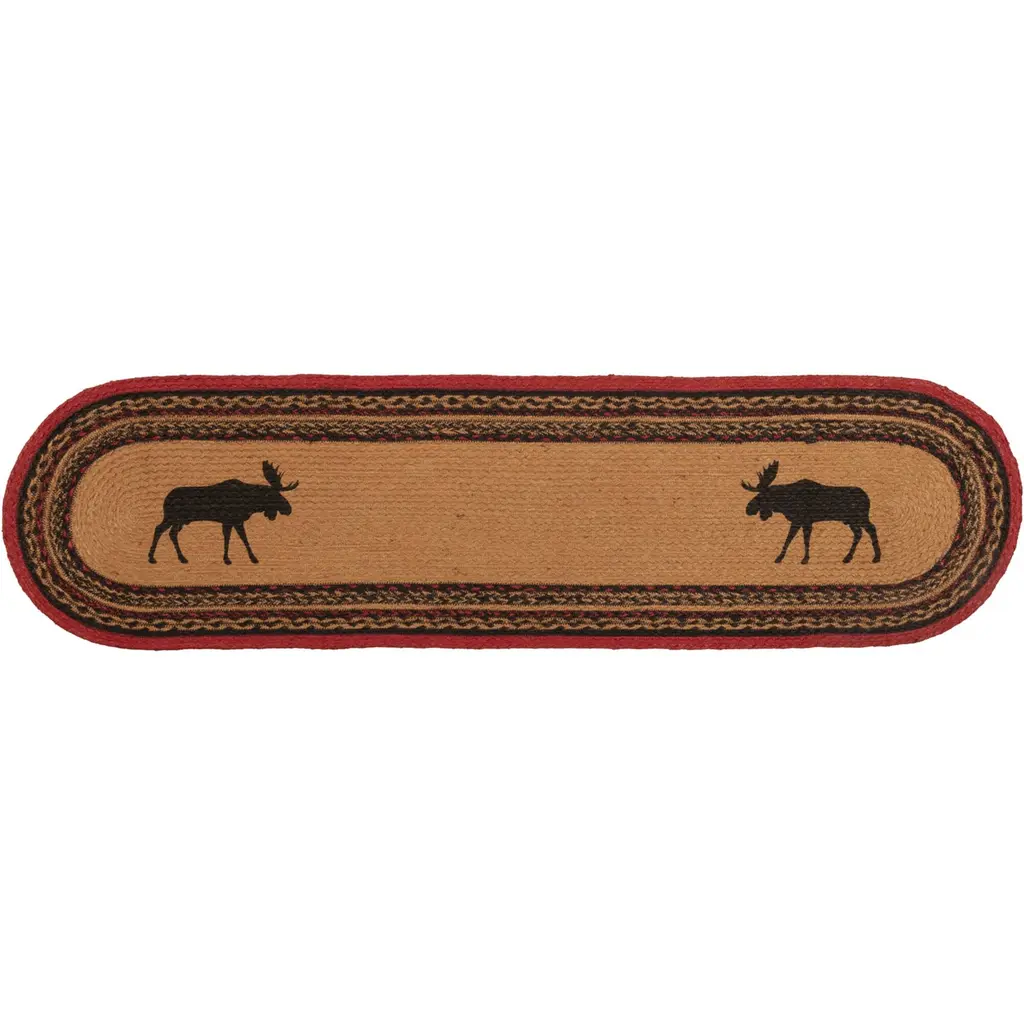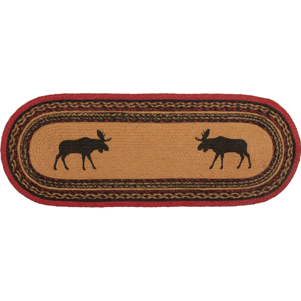 Bring log cabin charm into the home with the Cumberland Jute Runner Oval. Chili pepper reds, caviar blacks, and natural tans make this runner a woodcutter's dream. The Cumberland Jute Runner Oval proudly displays majestic moose stencils.Features PREMIUM CONSTRUCTION: with over two decades experience crafting goods for American homes, our items are built to last for years to come.RUSTIC DECOR: cabin style to fit any lodge, cabin, lake house, or retreat.QUALITY MATERIAL: made with durable 100% jute for a proper look and feel.Concentric braids of almond, cherry red, and black juteBlack moose stencil on each end facing each otherBraided: Machine braided, Machine stitchedSpecifications Material: 100% JuteColors: Almond, Cherry Red, RavenManufacturer Country: IndiaCare: Spot CleanSizes Available 8" x 24" - 0.4 lb13" x 36" - 1 lb13" x 48" - 1.3 lb* To prevent colors from bleeding do not use chemicals or wet clean this item. A rug pad is recommended to keep your surfaces safe from color bleeding and abrasiveness of the jute fibers.