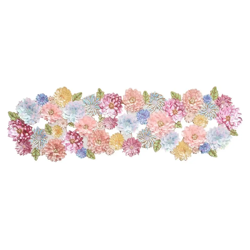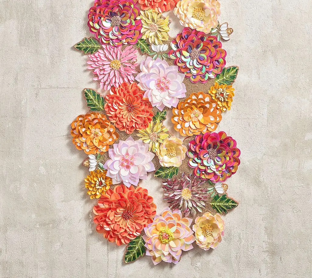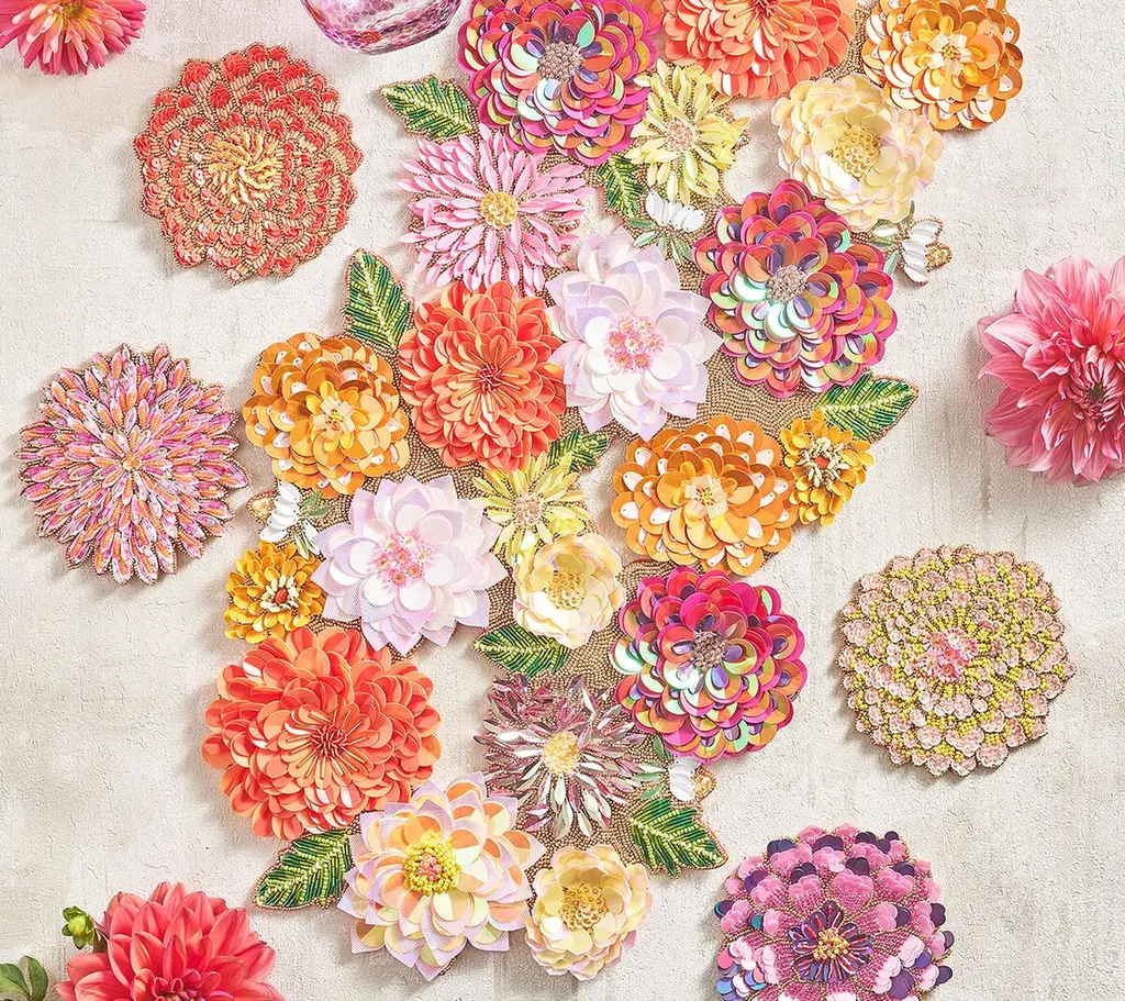 Named for the summer-blooming flower that signifies elegance and strength, the exquisite Dahlia Runner radiates magnificence. Over 35 sequins and beads are hand-layered and folded to create the three-dimensional Dahlia Runner.