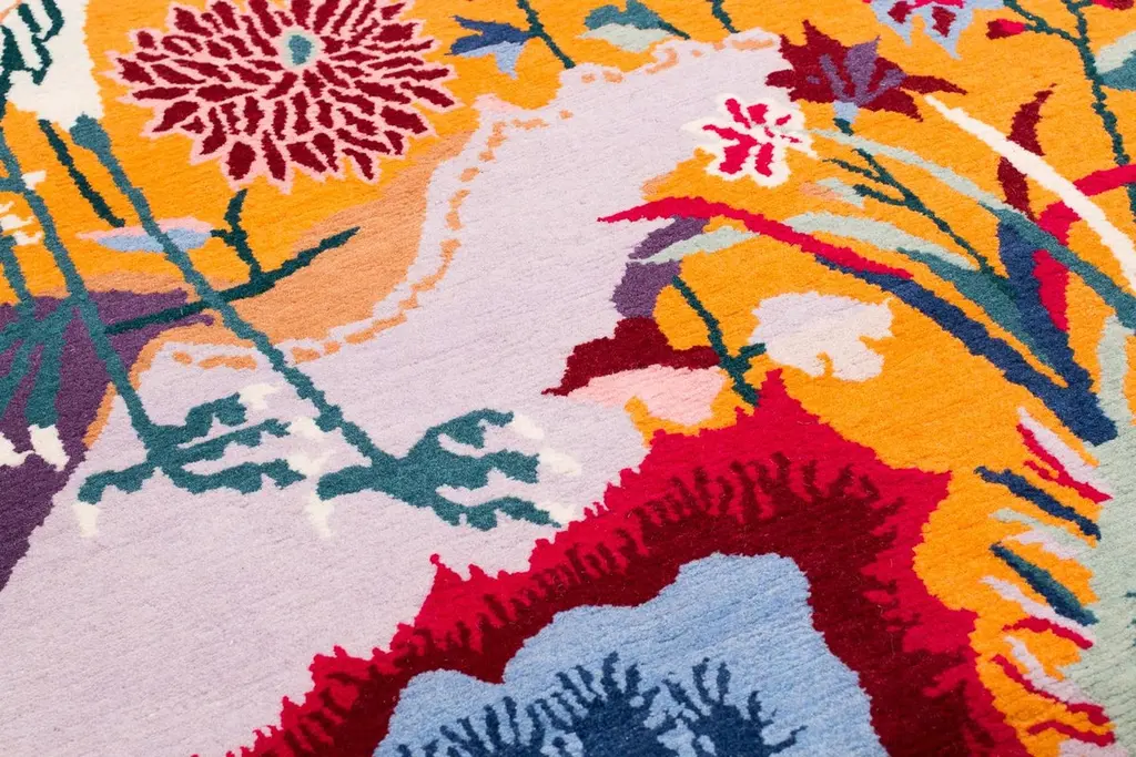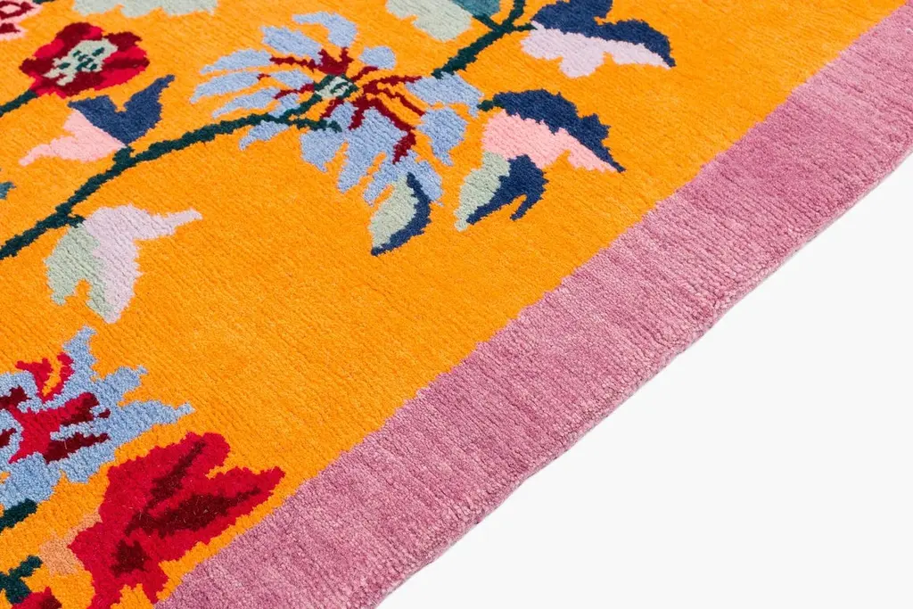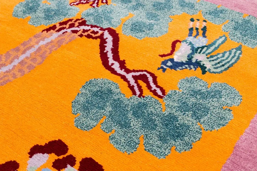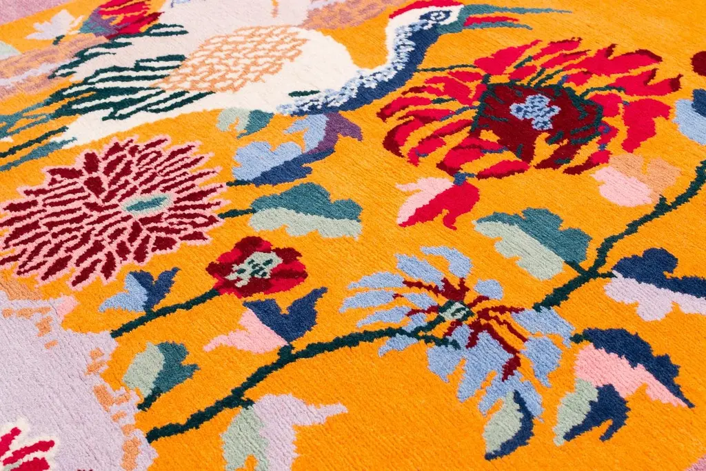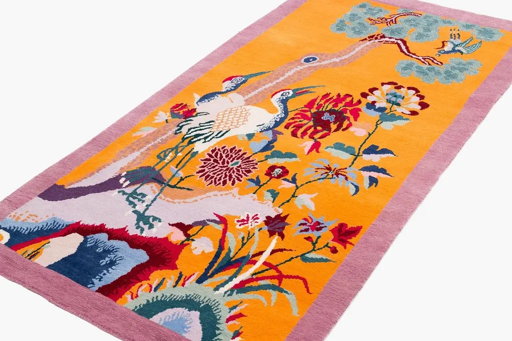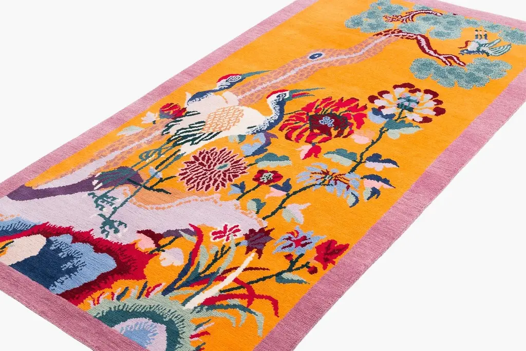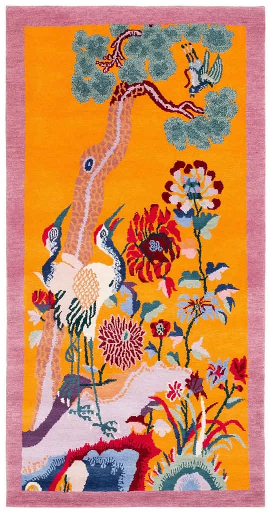 Deco Crane is a small runner rug is part of Joseph Carini's collection of 3x6s carpets. Inspired by Art Deco sensibility and East Asian designs, this carpet is a wonderful colorful accent piece. Remarkable for its fantastic orange field and expressive design, this accessory throw rug could be used at the foot of a bed, in a small hallway or to cozy up any corner of your home. Exclusive production, only two made. Available here individually ($3,300) or also as a set of 2 ($6,600), please reach out for details. Whether styled as a pair or independently, these are powerful accent pieces. Two cranes stand together reaching their necks upward, surrounded by colorful flowers. A tree stands in the rear with a bird among its branches. A beautiful pink border contrasts the orange background. Blue and teal details help ground the artwork. This design is especially soft and whimsical because of the playful flowers throughout. Handwoven in our exclusive workshop in Nepal, this rug exudes craftsmanship and excellence. Hand knotted with the finest hand processed Himalayan wool, this fine handmade carpet is soft to the touch and has a beautiful sheen from the wool's natural lanolin. This design can also be customized to your preferred size, color, and material. Available in silk, wool, mohair, wild nettle, or a combination of materials. Reach out for customization. Carini’s design philosophy is heavily influenced by historical contexts and nature, merging his graphic and organic design interests with his considerable knowledge of decorative arts, architecture, and industrial design history. His expertise in exotic natural dyes and hand-processed materials has become a cornerstone of his work. Joseph Carini is known for his innovative approach, constantly experimenting with design concepts and natural materials. He works closely with designers and clients, offering his expertise to help realize their visions while ensuring practical and aesthetic success. His emphasis on quality and longevity means that each carpet is crafted to last a lifetime, using the most environmentally friendly dyes and processes. Since founding Carini in 1997, Joseph Carini has worked with diverse clients, from A-list celebrities to high-end projects. His creations appeal to design aficionados and art collectors who value unique, authentic pieces. Carini’s rugs are more than just decorative items; they are canvases imbued with intention, positive energy, and a soul that brings warmth and life to any space.Dimensions: 3’ (W) x 6’ (L)Material: Devi Weave, 100 knot, WoolReference #34199, #34219