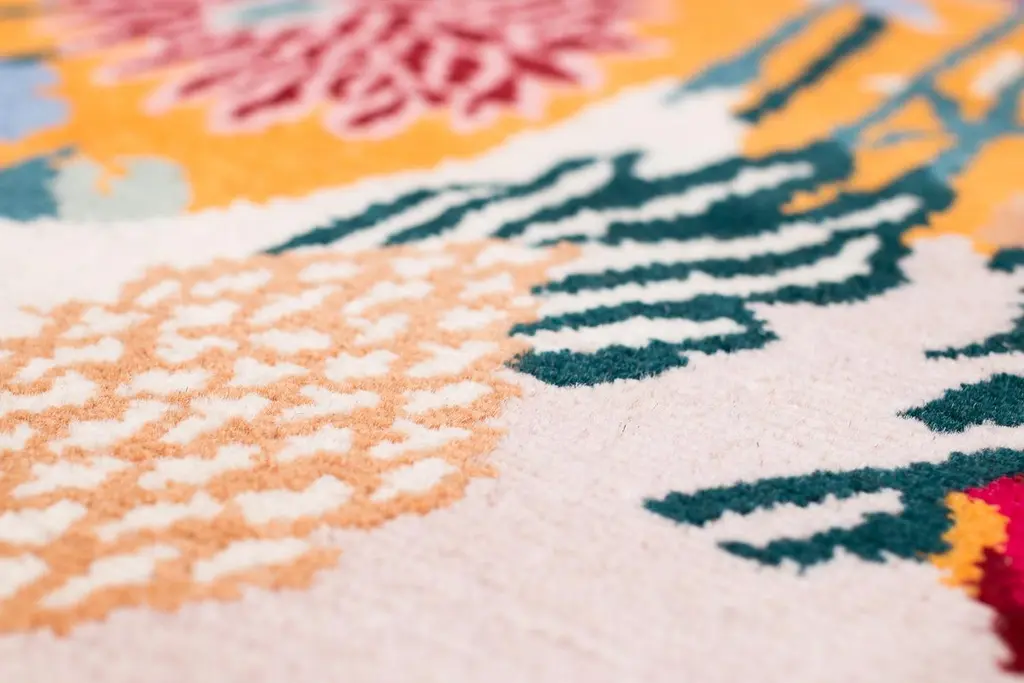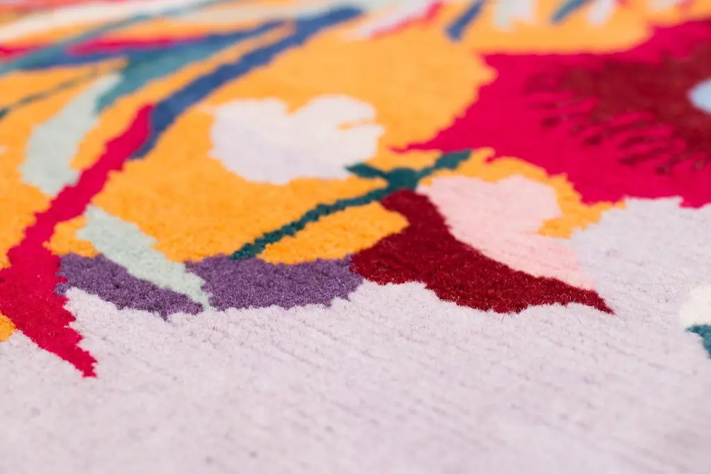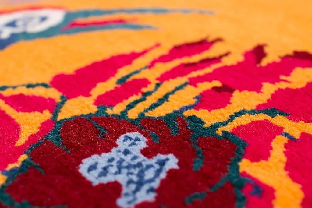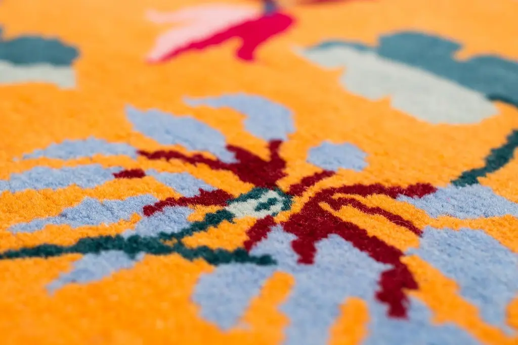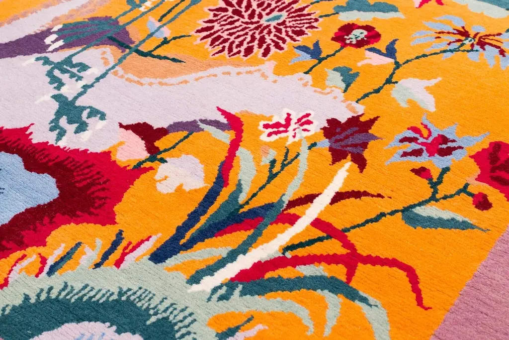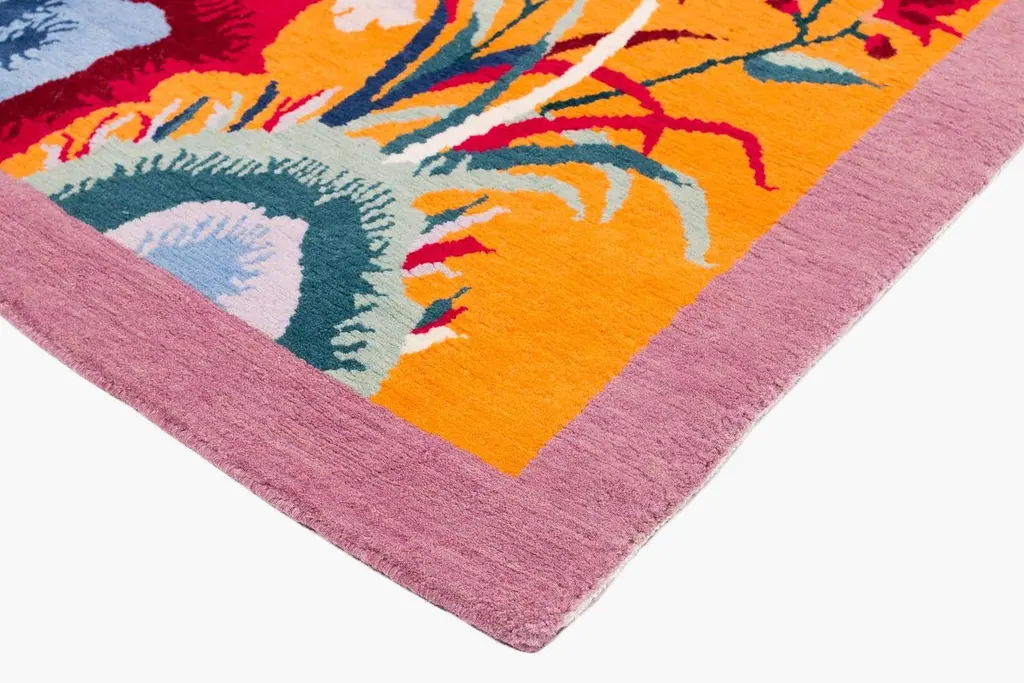 Deco Crane is a small runner rug is part of Joseph Carini's collection of 3x6s carpets. Inspired by Art Deco sensibility and East Asian designs, this carpet is a wonderful colorful accent piece. Remarkable for its fantastic orange field and expressive design, this accessory throw rug could be used at the foot of a bed, in a small hallway or to cozy up any corner of your home. Exclusive production, only two made. Available here individually ($3,300) or also as a set of 2 ($6,600), please reach out for details. Whether styled as a pair or independently, these are powerful accent pieces. Two cranes stand together reaching their necks upward, surrounded by colorful flowers. A tree stands in the rear with a bird among its branches. A beautiful pink border contrasts the orange background. Blue and teal details help ground the artwork. This design is especially soft and whimsical because of the playful flowers throughout. Handwoven in our exclusive workshop in Nepal, this rug exudes craftsmanship and excellence. Hand knotted with the finest hand processed Himalayan wool, this fine handmade carpet is soft to the touch and has a beautiful sheen from the wool's natural lanolin. This design can also be customized to your preferred size, color, and material. Available in silk, wool, mohair, wild nettle, or a combination of materials. Reach out for customization. Carini’s design philosophy is heavily influenced by historical contexts and nature, merging his graphic and organic design interests with his considerable knowledge of decorative arts, architecture, and industrial design history. His expertise in exotic natural dyes and hand-processed materials has become a cornerstone of his work. Joseph Carini is known for his innovative approach, constantly experimenting with design concepts and natural materials. He works closely with designers and clients, offering his expertise to help realize their visions while ensuring practical and aesthetic success. His emphasis on quality and longevity means that each carpet is crafted to last a lifetime, using the most environmentally friendly dyes and processes. Since founding Carini in 1997, Joseph Carini has worked with diverse clients, from A-list celebrities to high-end projects. His creations appeal to design aficionados and art collectors who value unique, authentic pieces. Carini’s rugs are more than just decorative items; they are canvases imbued with intention, positive energy, and a soul that brings warmth and life to any space.Dimensions: 3’ (W) x 6’ (L)Material: Devi Weave, 100 knot, WoolReference #34199, #34219