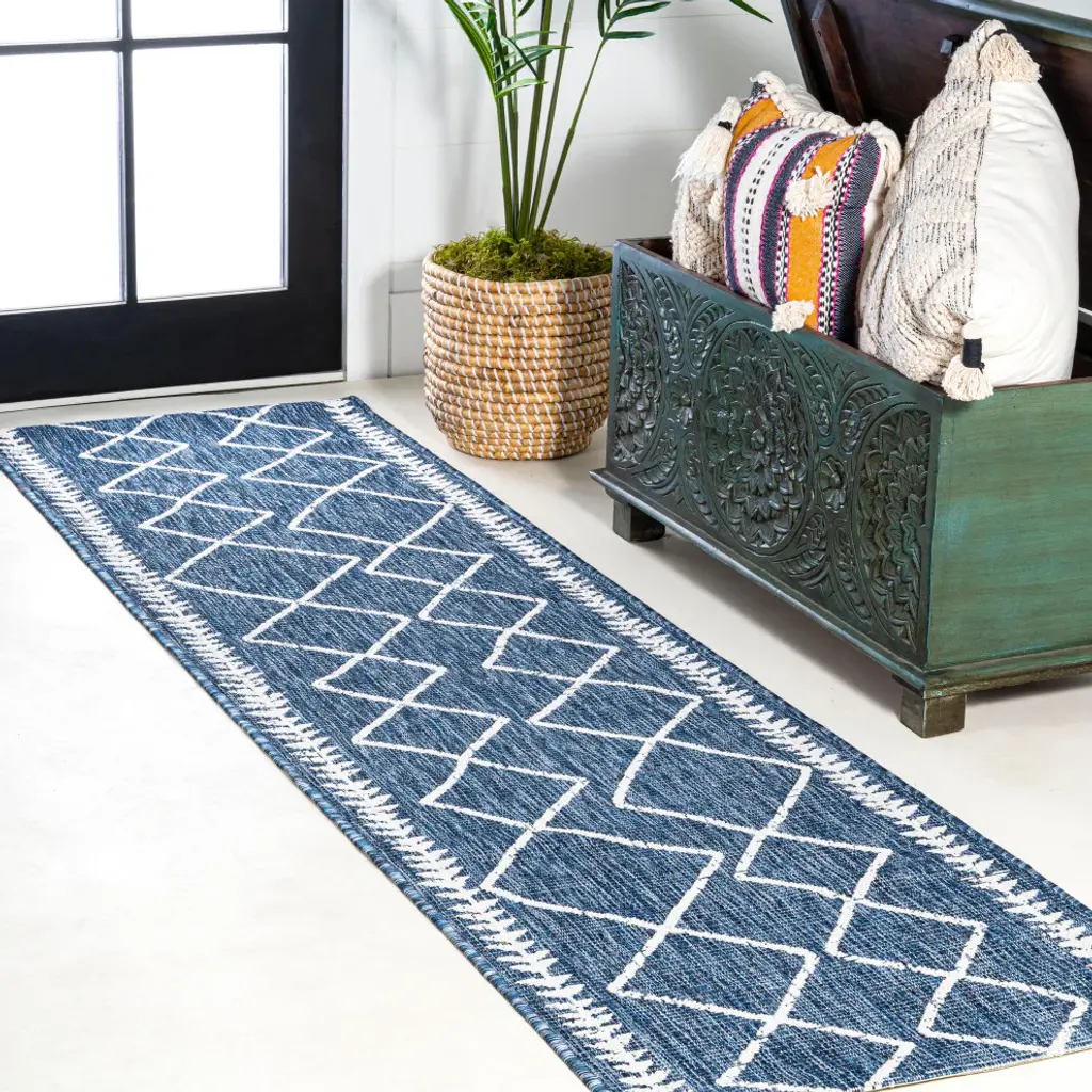 Moroccan influences abound in the geometric design of our tribal-inspired rug. The traditional diamond trellis pattern has the handwoven look popular in mid-century modern interiors. Add graphic impact to a modern living room, dining room, bedroom, kitchen or entry, and create your Boho-chic story with this easy-care rug.Features:• Power loomed with a 0.19" pile that''s soft and durable• The crisp blue and ivory color scheme adds coastal cottage flair to a modern tribal design• Made from easy-care polypropylene - just sweep, vacuum or hose down with mild soap and water• 100% Polypropylene• No backing, use of rug pad is recommended (sold separately)• Power Loomed in Turkey• Actual Dimension: 2 ft. 2 in. X 10 ft.• Color: Blue/Ivory• Thickness measures: 0.19 in.• Available in multiple sizes and/or colorsRug Care:• Vacuum regularly and spot clean as needed; avoid direct and continuous exposure to sunlight; use brushless vacuum; remove spills immediately; if liquid, blot with clean, undyed cloth by pressing firmly around the spill to absorb as much as possible; for hard to remove stains, professional rug cleaning is recommended; store in a dry, well ventilated area and rotate for consistent wear• Packing and shipping may cause temporary creases in rugs, which will flatten out after a week on the floor; to expedite the process, try back-rolling your rug before laying it down, and then allow ample time for the remaining creases to relax• Please Note: Due to differences in monitors, some rug colors may vary slightly. Lengths and widths may vary from the published dimensions. Patterns may vary slightly according to shape and size selected.About us:Style your floors with JONATHAN Y. By combining fine craftsmanship and design, this New York creative studio is bringing fashion to your floors. The collection mixes sustainable organic materials, vibrant colors and trend worthy styles to create JONATHAN Y''s distinctive catalog of rugs.