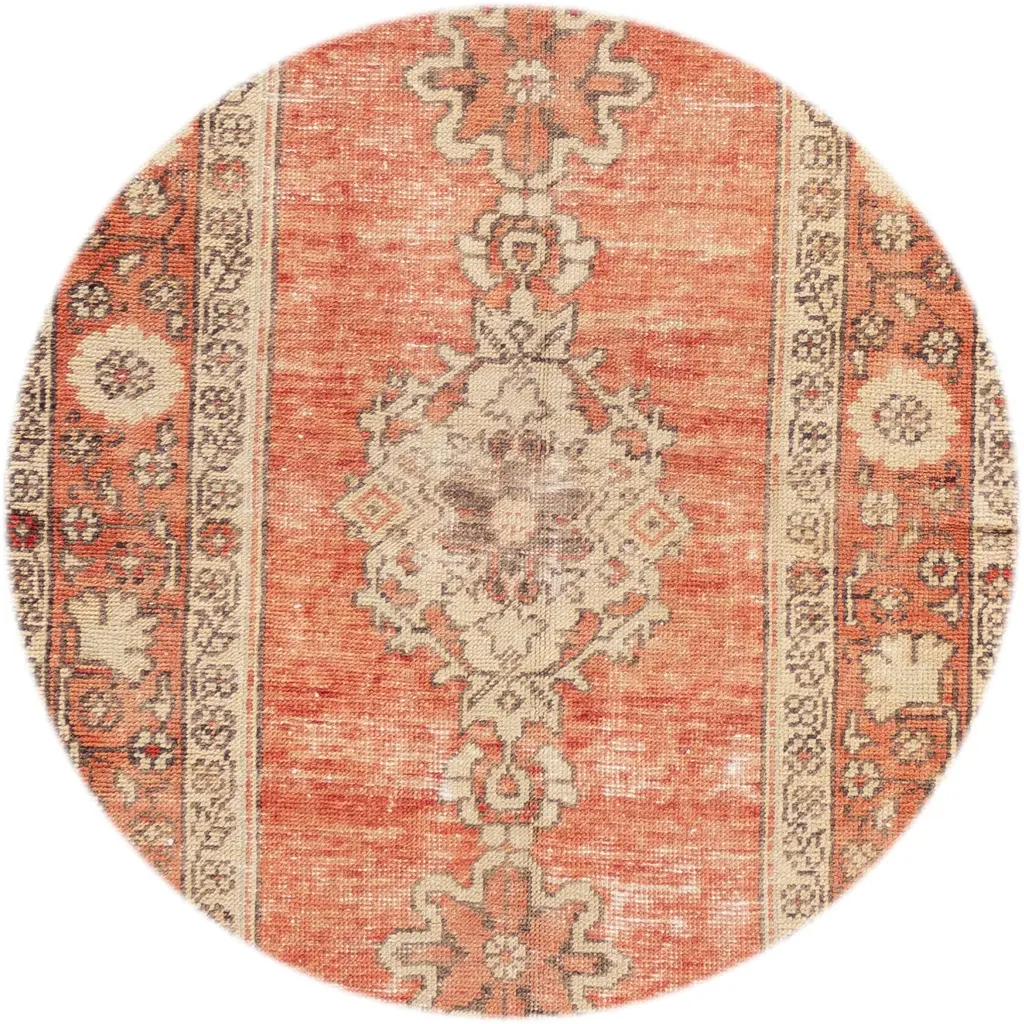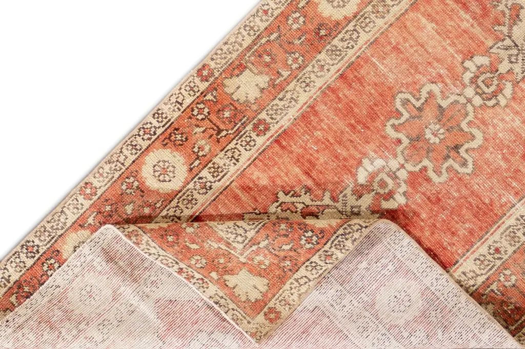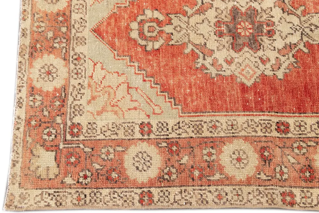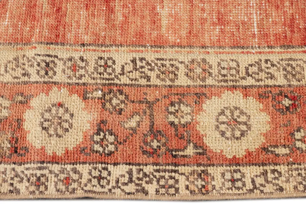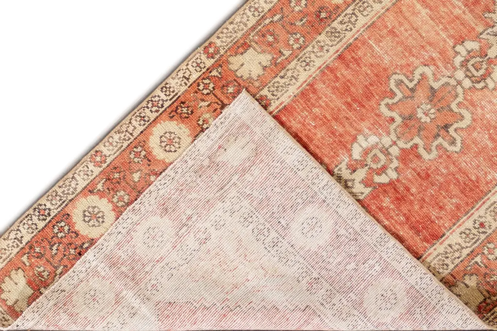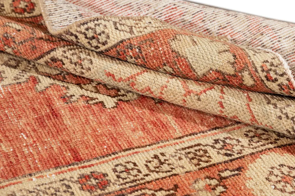 A hand knotted vintage Turkish Anatolian runner with an orange field, ivory and tan accents in all-over multi medallion design,circa 1930s.This rug measures 3' 2" x 9' 7".
