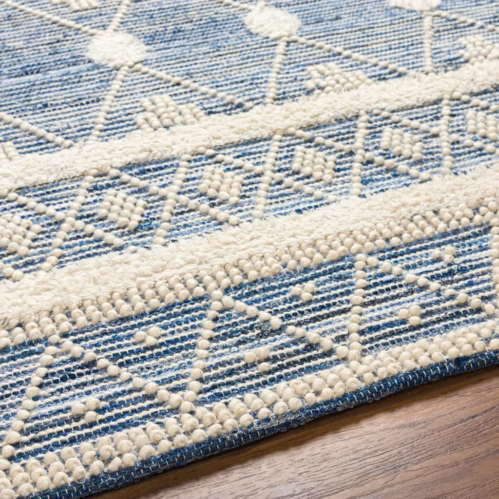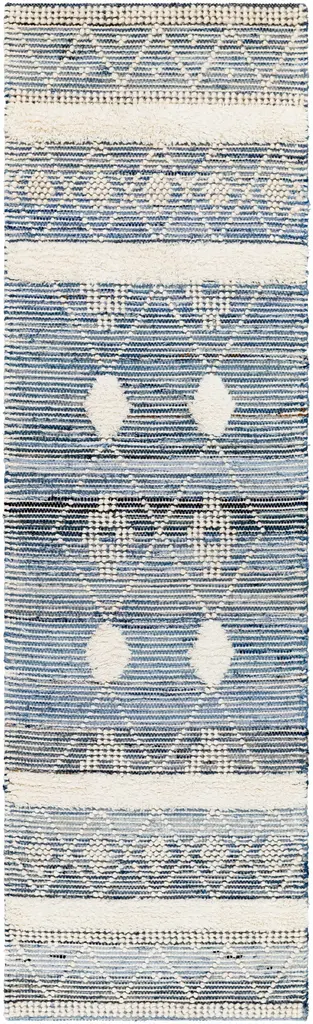 Collection: Eben Colors: Navy, Light Blue, Charcoal, Medium Gray, Off White Construction: Hand Woven Material: 70% Cotton,30% Wool Pile: High Pile Pile Height: 0.79" Styles: Transitional,Bohemian Made In: India Thickness: 0.98" Price Range: $$$$$ (Affordable)