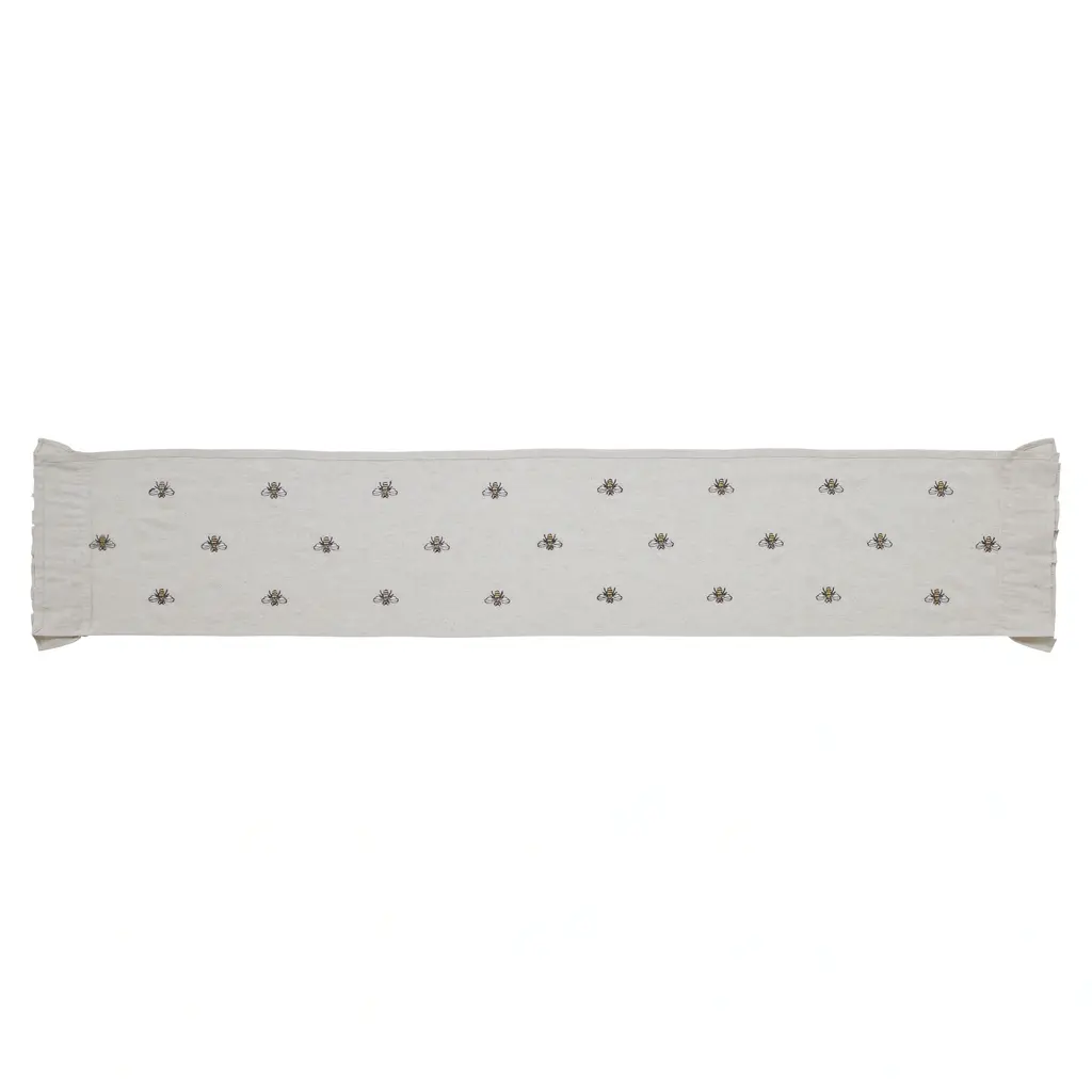 FARMHOUSE RUNNER: Our 13x72 inch Embroidered Bee Runner features natural creme, soft yellow, and charcoal grey hues in a country embroidered bee design.,TEXTURED MATERIAL: This runner is crafted from 89 percent cotton, 11 percent flax that is both textured and durable.,PROTECTS SURFACES: Uniquely engineered cotton protects surfaces from heat, scratches, and condensation.,EASY CARE: To give your cotton runner as many years of quality comfort as possible, machine wash on delicate cycle and tumble dry low.,COORDINATING ACCESSORIES: Pair this farmhouse runner with matching placemats, towels, and more from the Embroidered Bee collection.