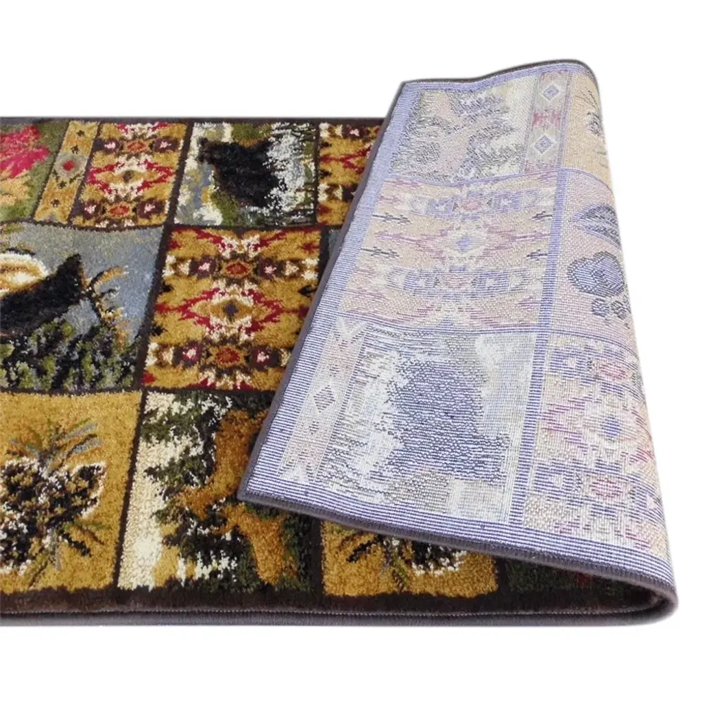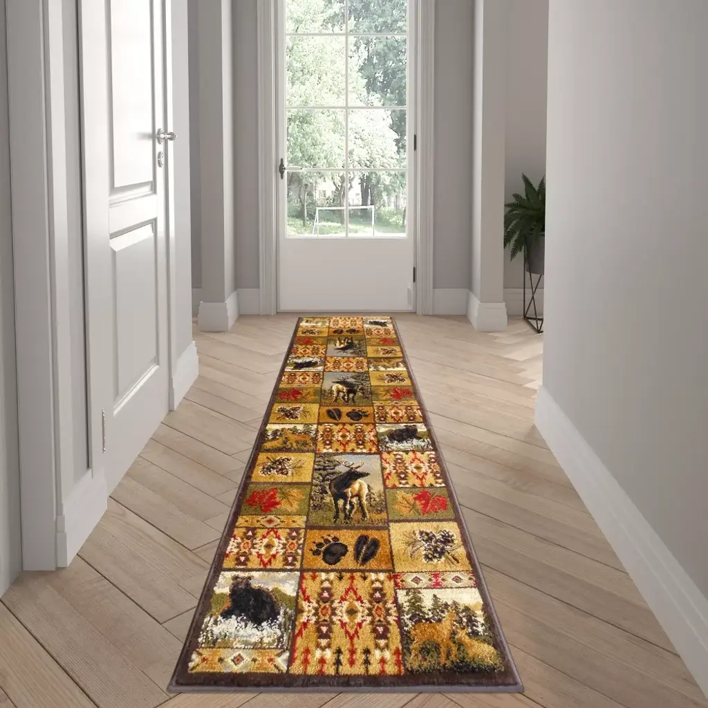 Capture the majesty of wildlife in your home, camper, or RV with this accent runner featuring a rustic wildlife theme with elk and black bear scenes and Southwestern geometric accents in vibrant, full color. The olefin facing offers and ultra soft feel and natural moisture and stain resistance with colorfast, non-shedding fibers. The easy cleaning makes this rug a great choice for active, adventurous lifestyles. Simply vacuum regularly without the roller brush to remove surface dirt and debris and spot clean when necessary with a diluted mixture of clear, neutral detergent and water and a dry cloth. For heavy messes, steam clean on a low moisture setting for best results. The natural jute backing is suitable for many flooring types. Pair with one of our anti-slip rug pads to keep your rug securely in place and delay the signs of wear from every day foot traffic.